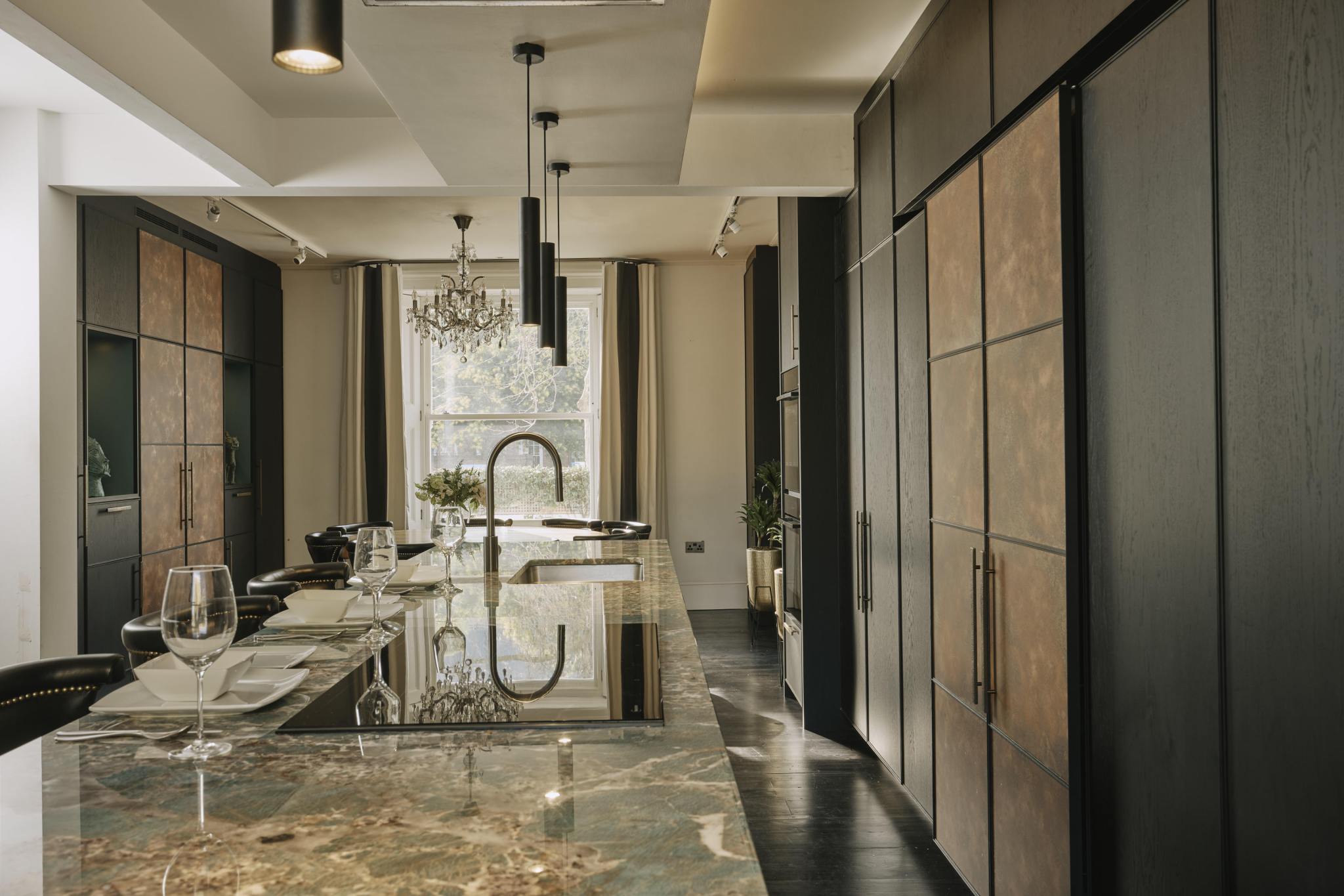 Our client downsized from a large house in the country to a Victorian townhouse in Central London, so storage space in the kitchen was a big requirement. She also loved Ledbury Studio’s aged and patinated copper finish, and wanted to incorporate this into the design. Black stained oak cabinets were chosen as a foil to set off the beautiful copper centrepieces, and echoed in the specially cast handles in aged and distressed brass. Sliding copper doors break up the bank of tall cupboards on the back wall, revealing open shelves backed with Latina antique glass which is back lit with led lighting.
