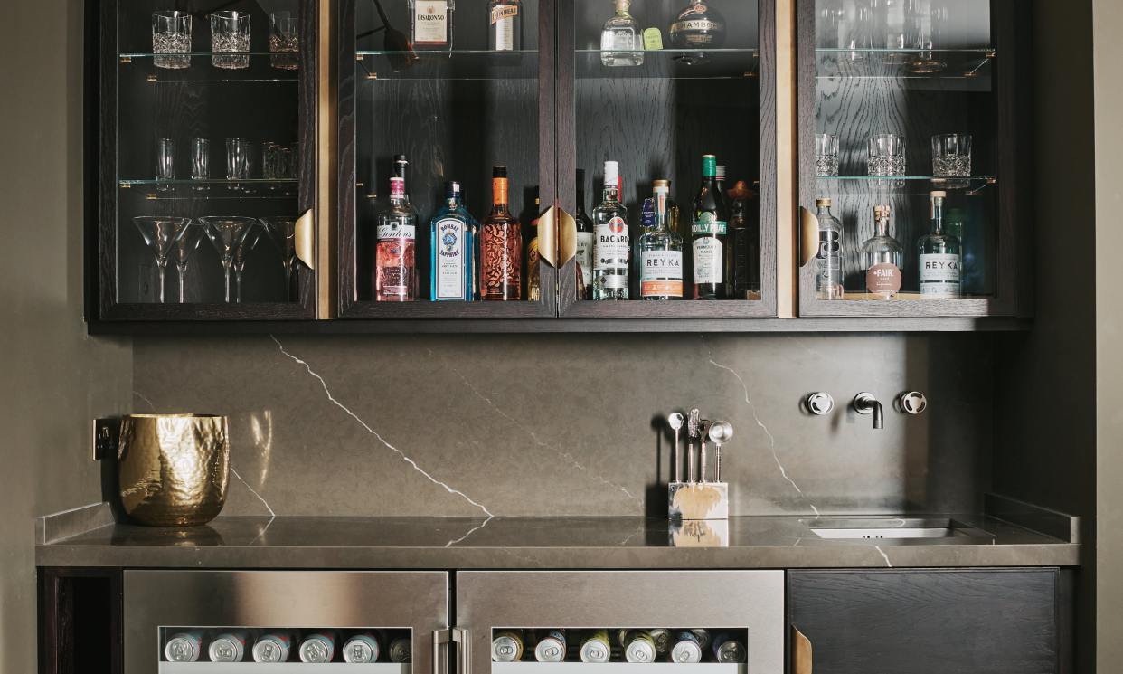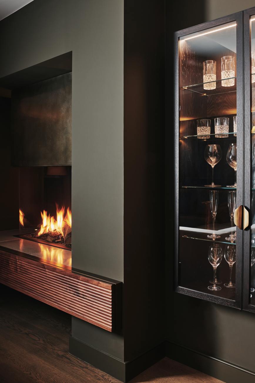 Our client wanted us to create a space that’s both inviting and sophisticated, somewhere where the family could enjoy everything from Friday night drinks to Sunday afternoon movie marathons. A masterclass in understated luxury, the design is characterised by the quality and effortless beauty of the materials chosen, and the skill with which they’ve been curated. Wall mounted cupboards for glassware feature glass and dark stained oak, finished with bronze handles and interior lighting, and the theme is continued into the bar area where glass fronted cupboards with liquid bronze styles sit above wine coolers and a small sink. This Mayfair media room is so much more than somewhere to watch movies, its perfect for some serious entertaining too!