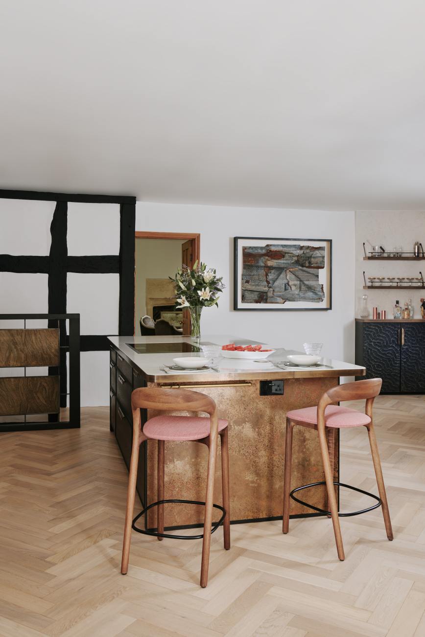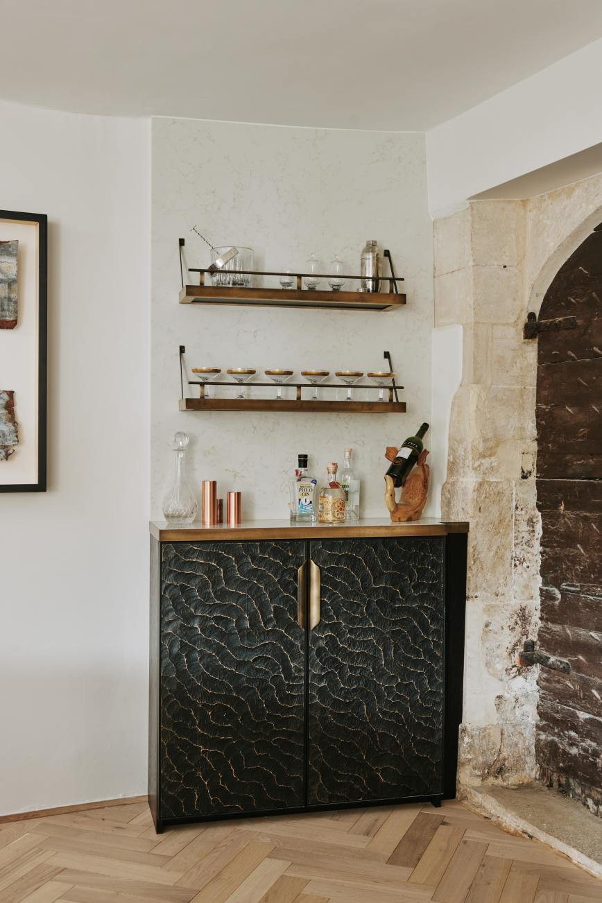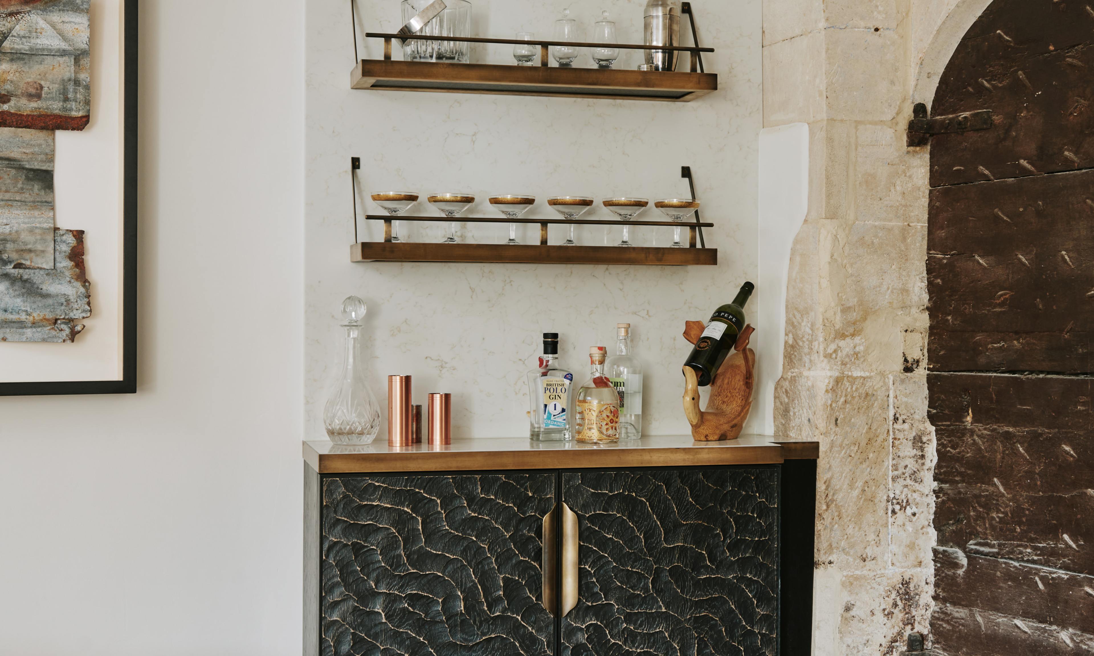 “It was created out of necessity, as we needed a way to hide the ugly electricity meters in the kitchen, which we accomplished with a shallow-depth cupboard. To make it more of a talking point, however, we added a brass-edged worktop that functions as a little bar area, complete with aged-brass shelves above for glassware and cocktail essentials. I think it works rather well.”