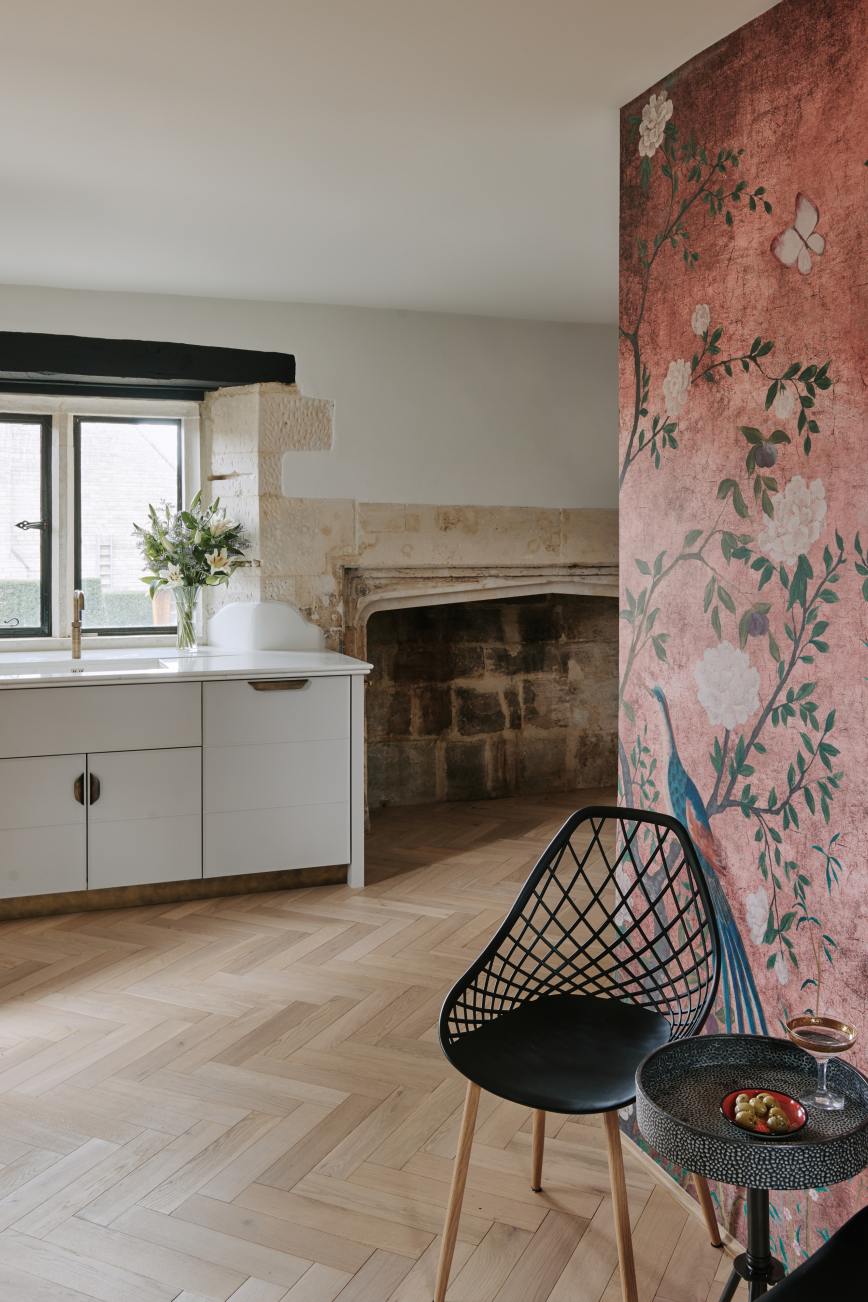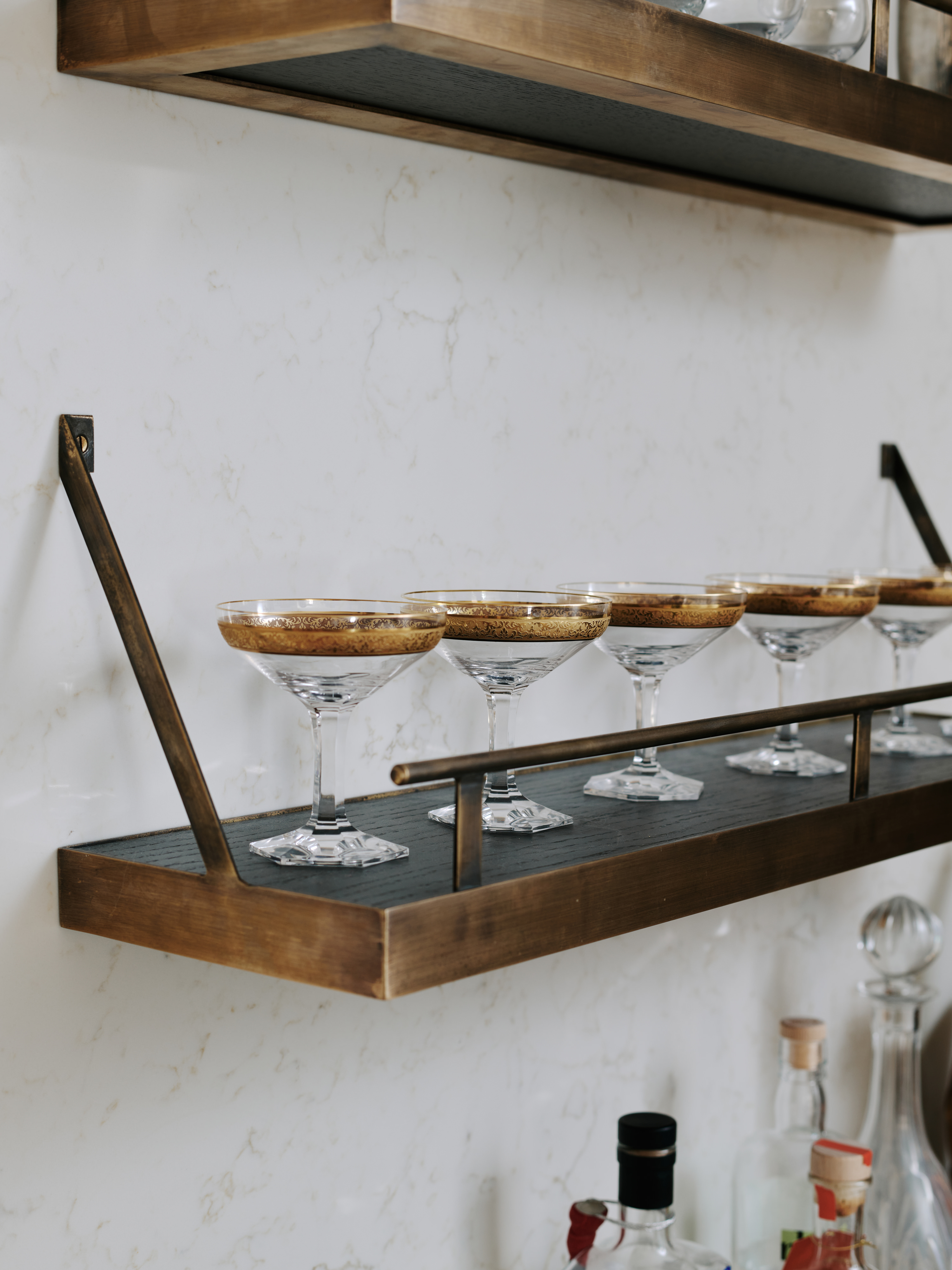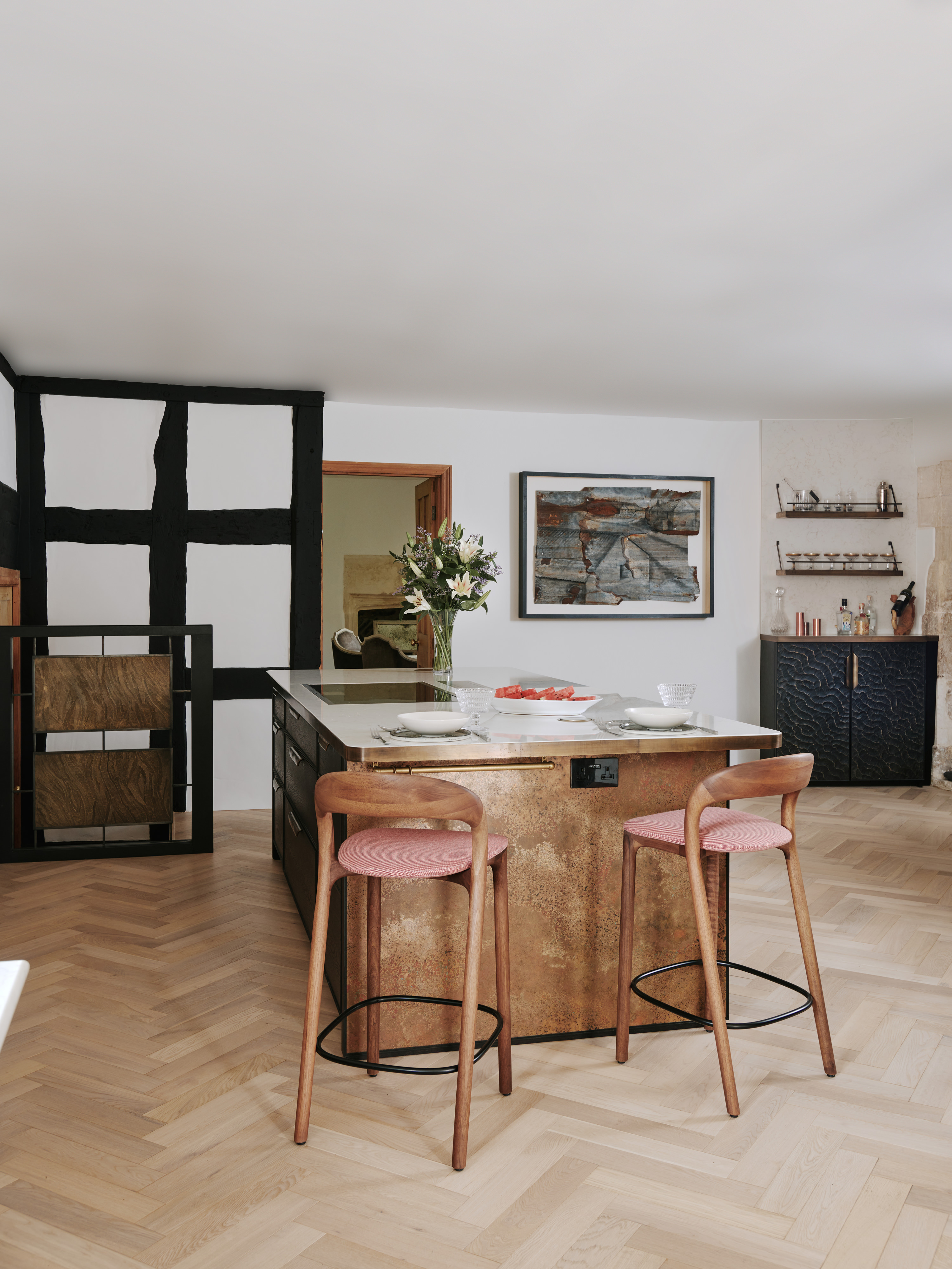 “It was created out of necessity, as we needed a way to hide the ugly electricity meters in the kitchen, which we accomplished with a shallow-depth cupboard. To make it more of a talking point, however, we added a brass-edged worktop that functions as a little bar area, complete with aged-brass shelves above for glassware and cocktail essentials. I think it works rather well.”