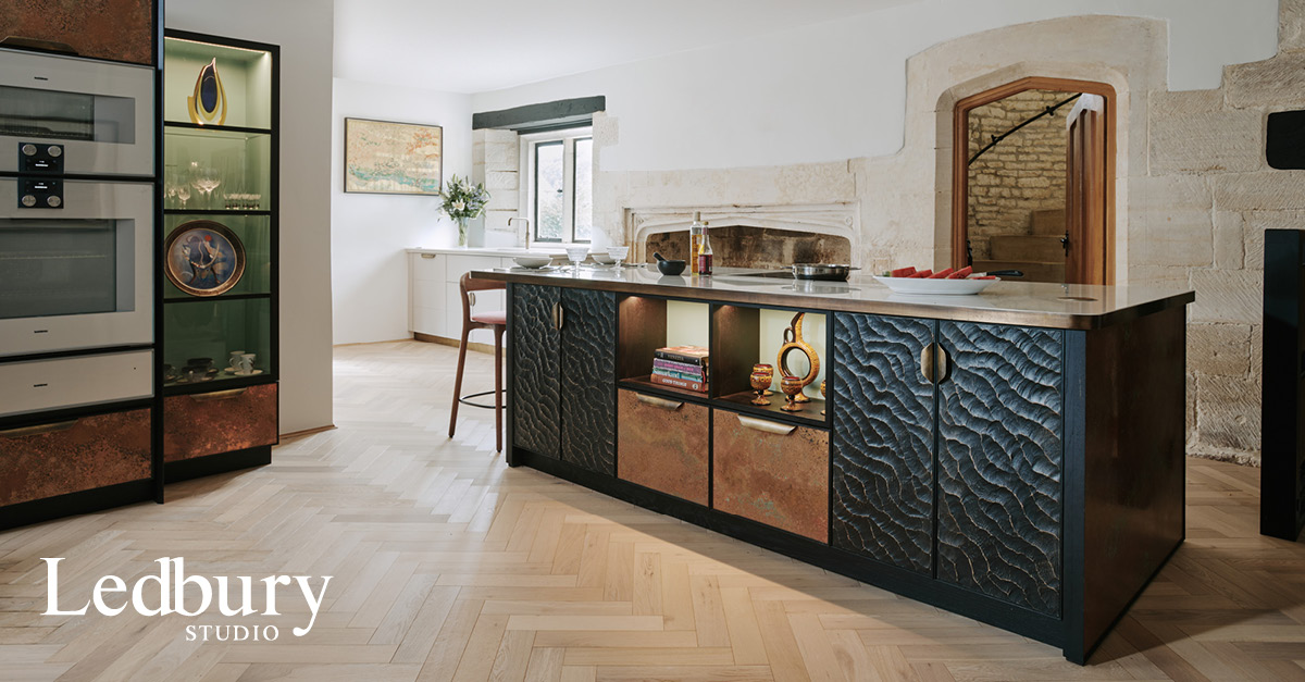 A home bar became gorgoues kitchen feature within The Stroud Kitchen when a cupboard with aged brass shelving above was designed to house the meters.