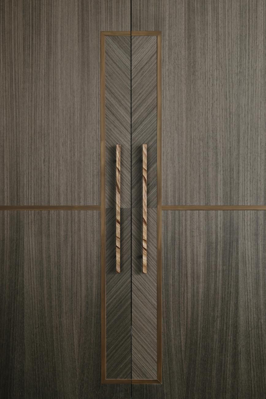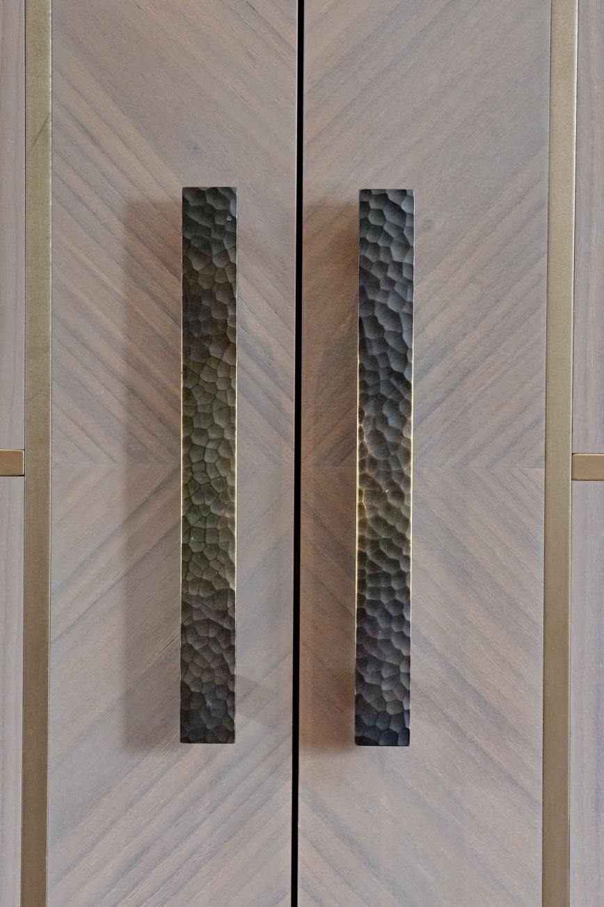 Directional crosslaid veneers are applied by hand in an exquisite herringbone marquetry design, accented with liquid metal bronze inlays on the doors, and custom designed bronze bar handles.