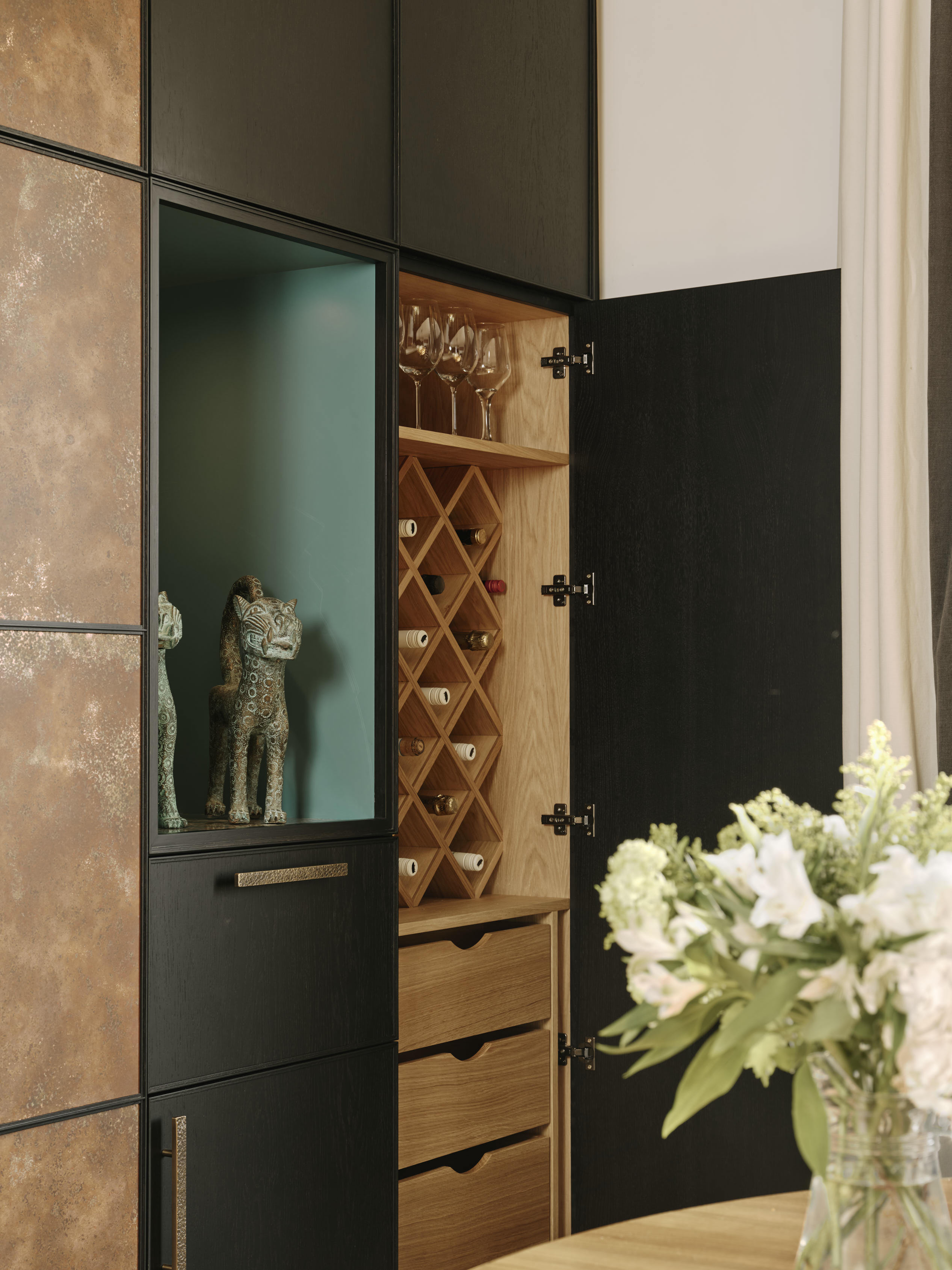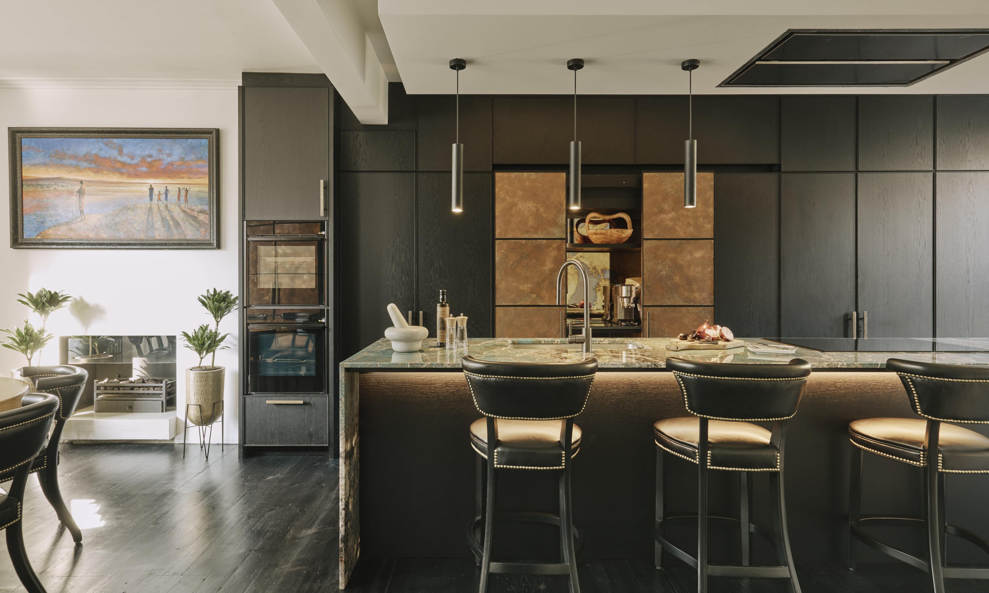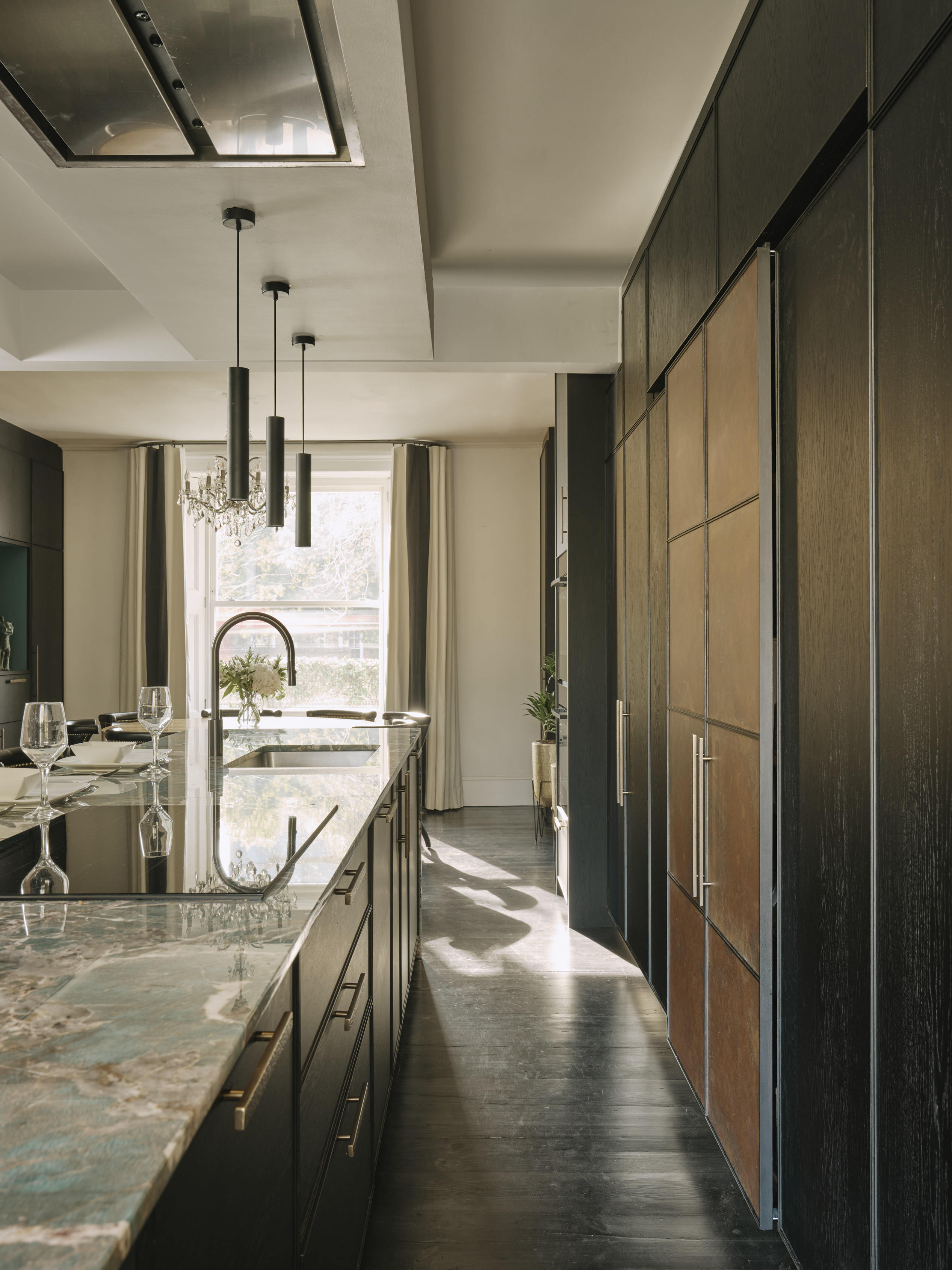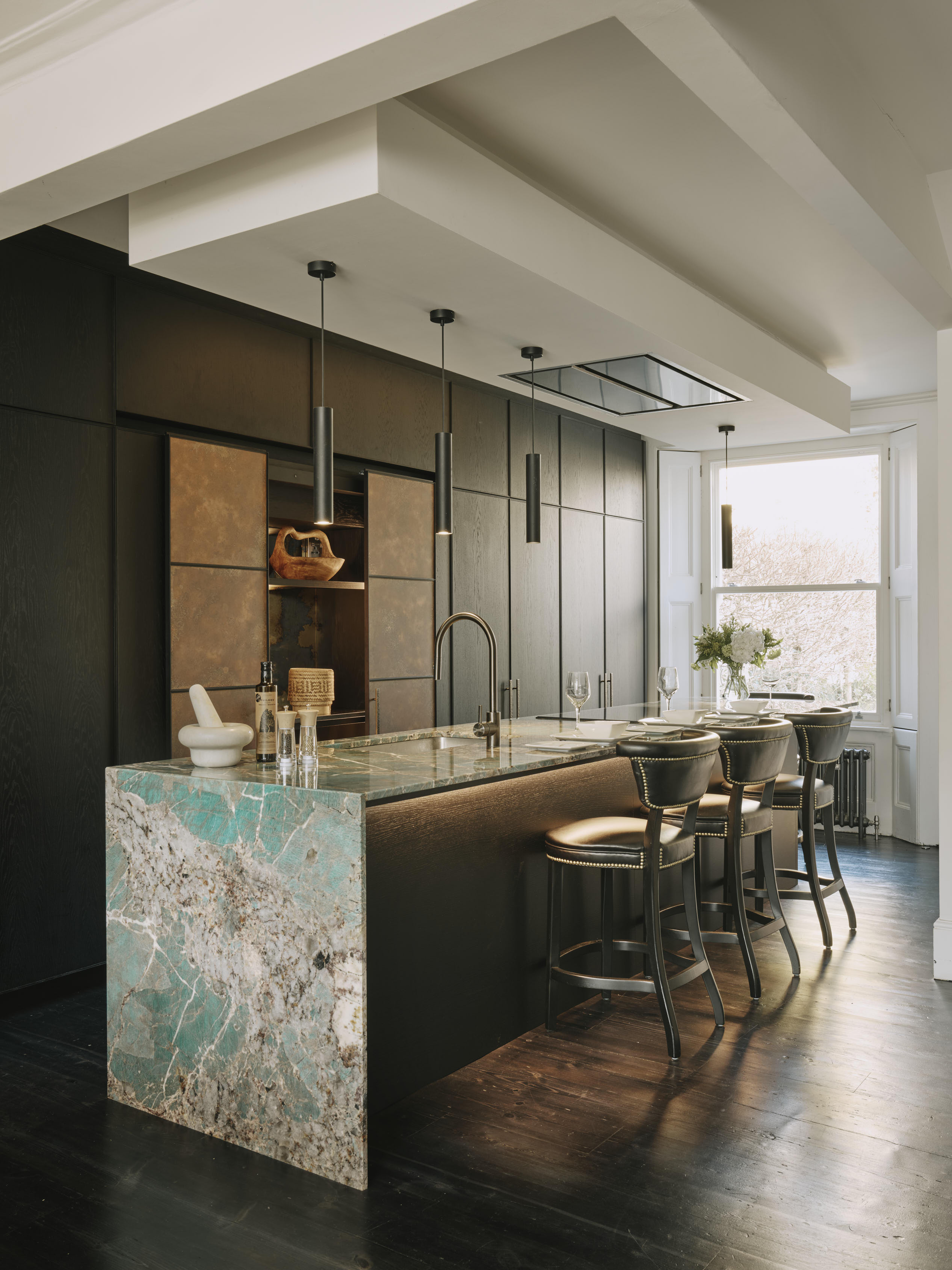 Our client downsized from a large house in the country to a Victorian townhouse in Central London, so storage space in the kitchen was a big requirement. She also loved Ledbury Studio’s aged and patinated copper finish, and wanted to incorporate this into the design. Black stained oak cabinets were chosen as a foil to set off the beautiful copper centrepieces, and echoed in the specially cast handles in aged and distressed brass. Sliding copper doors break up the bank of tall cupboards on the back wall, revealing open shelves backed with Latina antique glass which is back lit with led lighting.