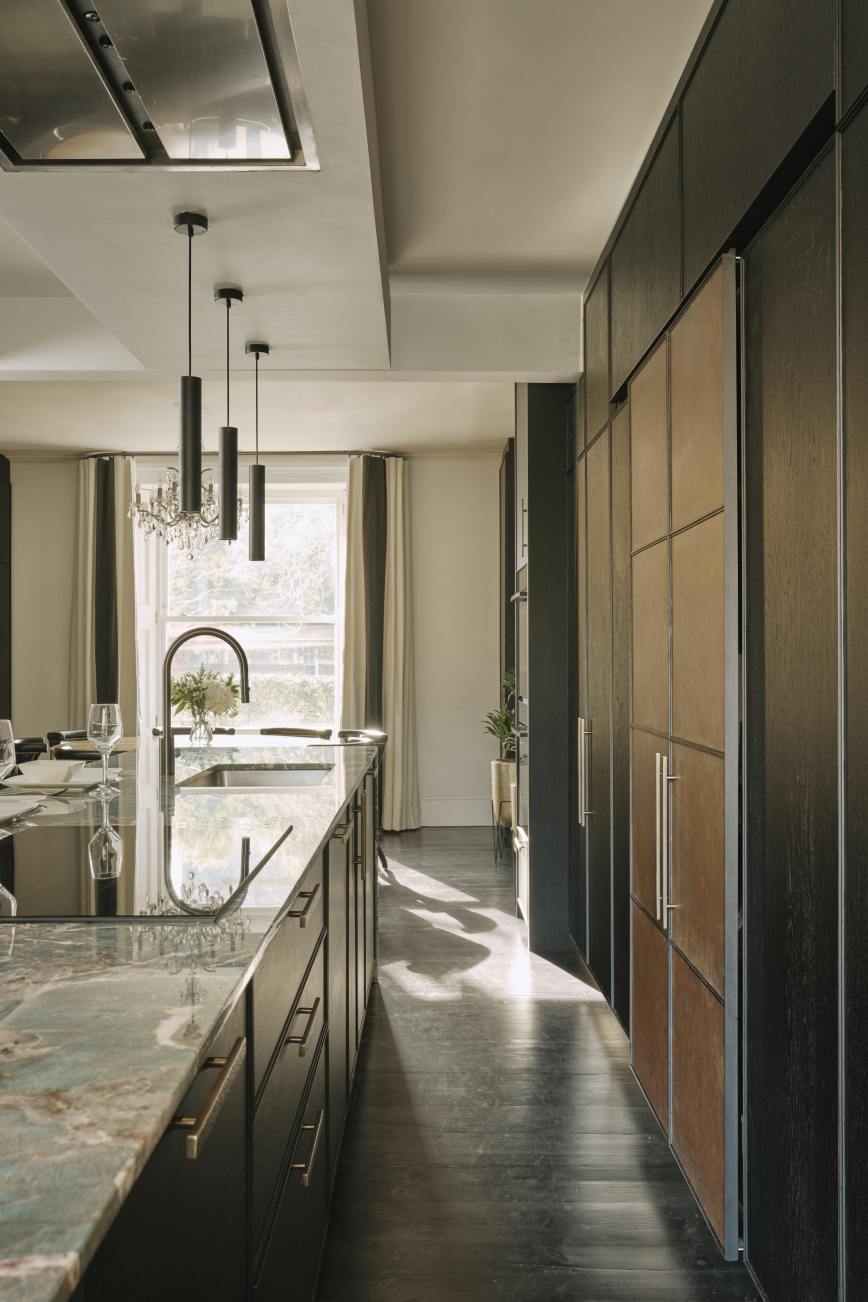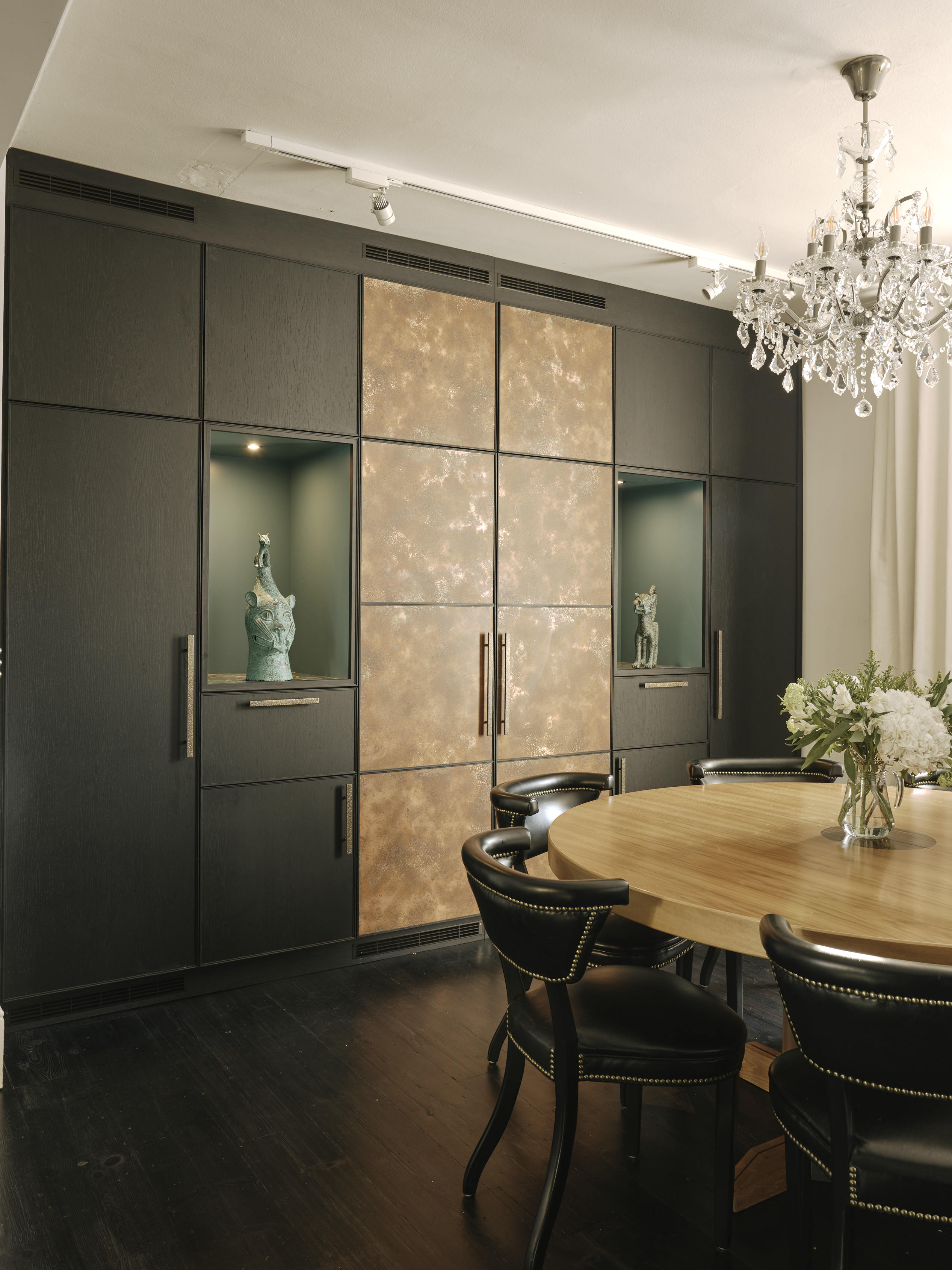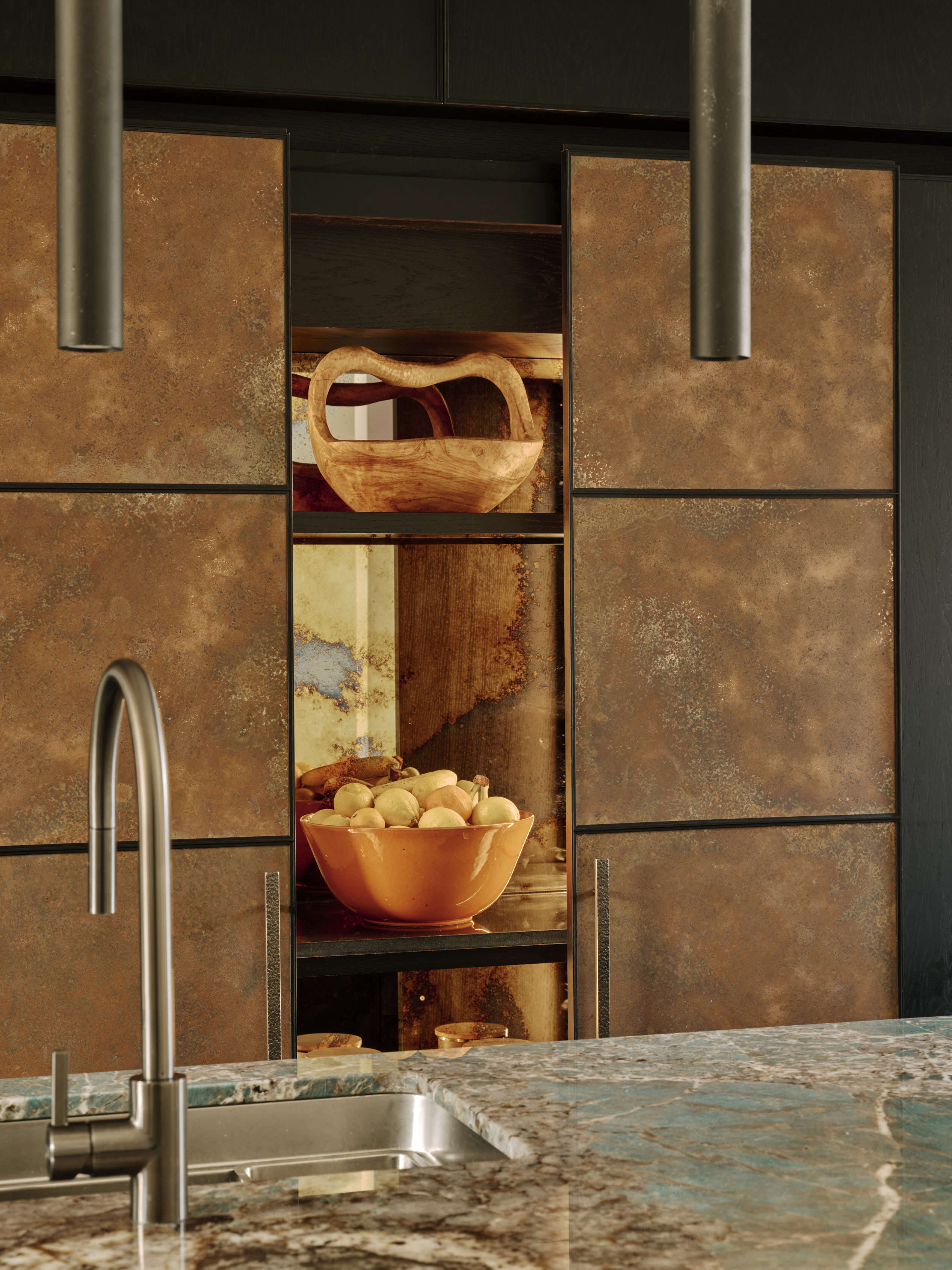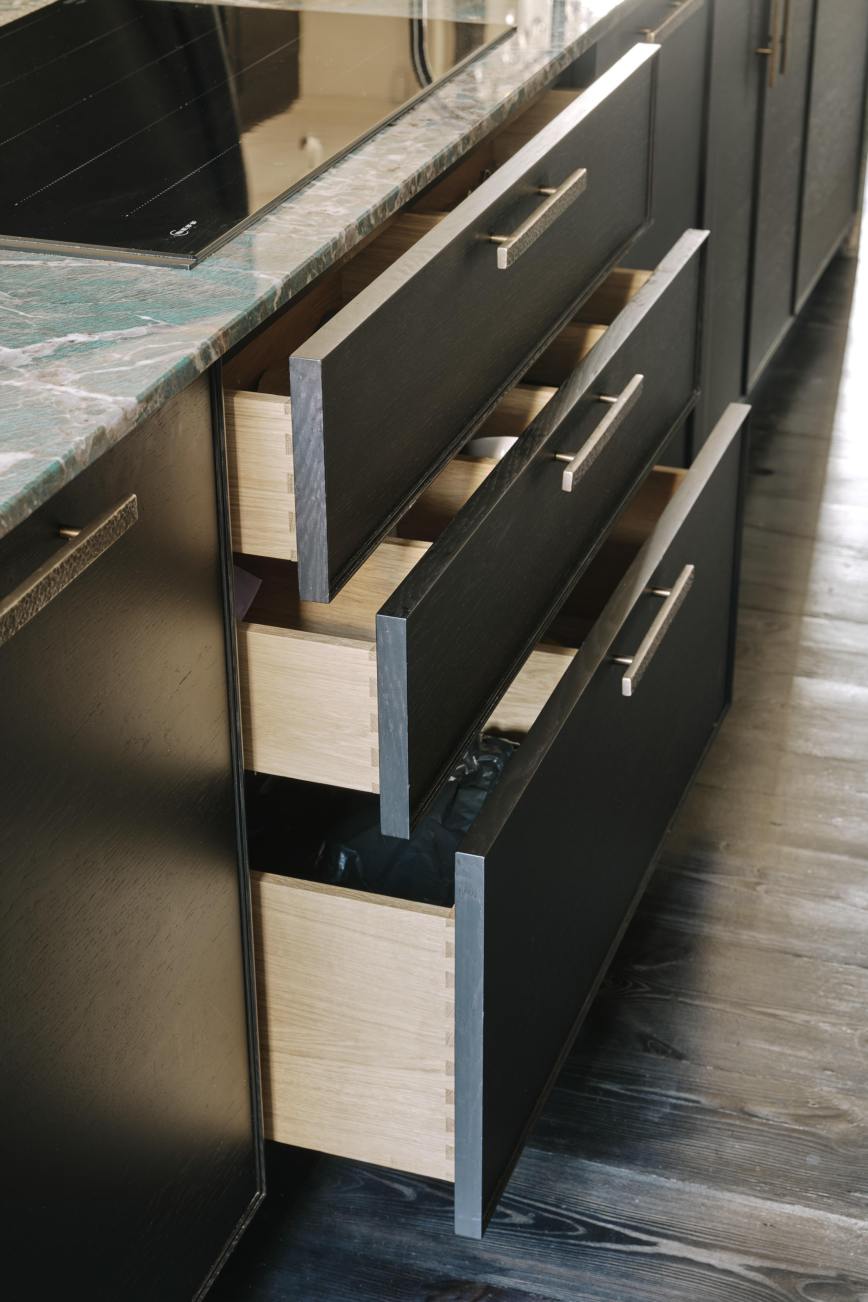Our client downsized from a large house in the country to a Victorian townhouse in Central London, so storage space in the kitchen was a big requirement. She also loved Ledbury Studio’s aged and patinated copper finish, and wanted to incorporate this into the design. Black stained oak cabinets were chosen as a foil to set off the beautiful copper centrepieces, and echoed in the specially cast handles in aged and distressed brass. Sliding copper doors break up the bank of tall cupboards on the back wall, revealing open shelves backed with Latina antique glass which is back lit with led lighting.