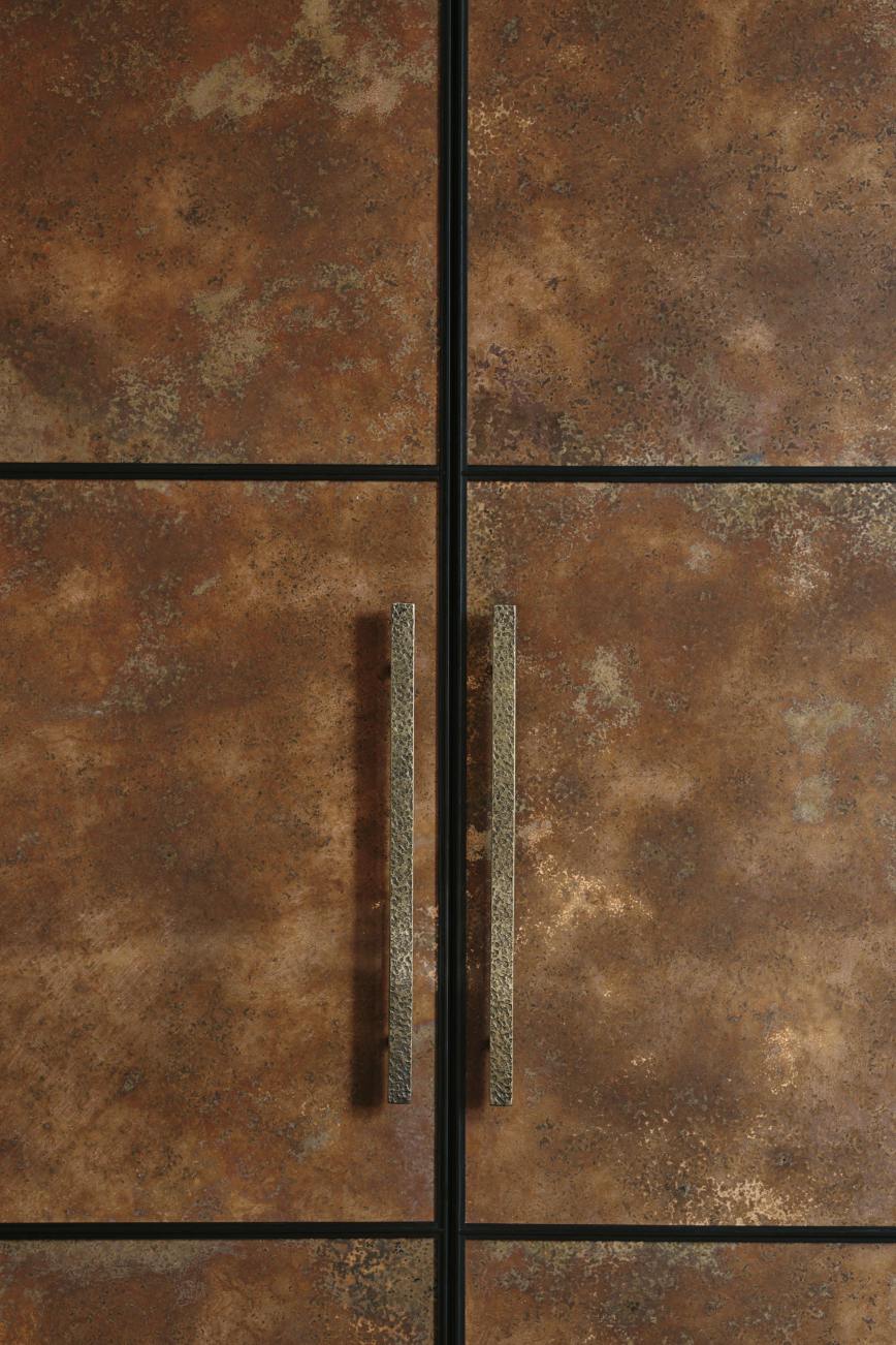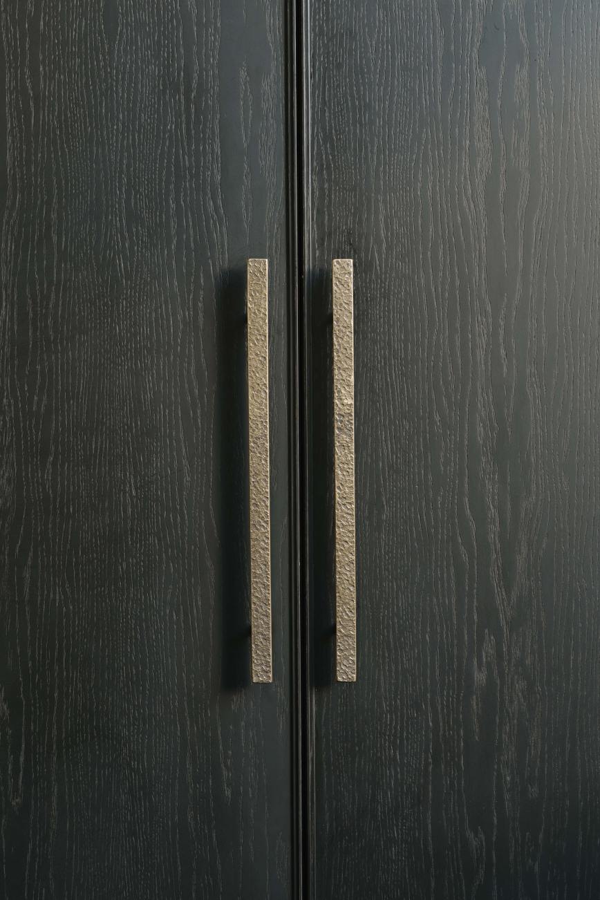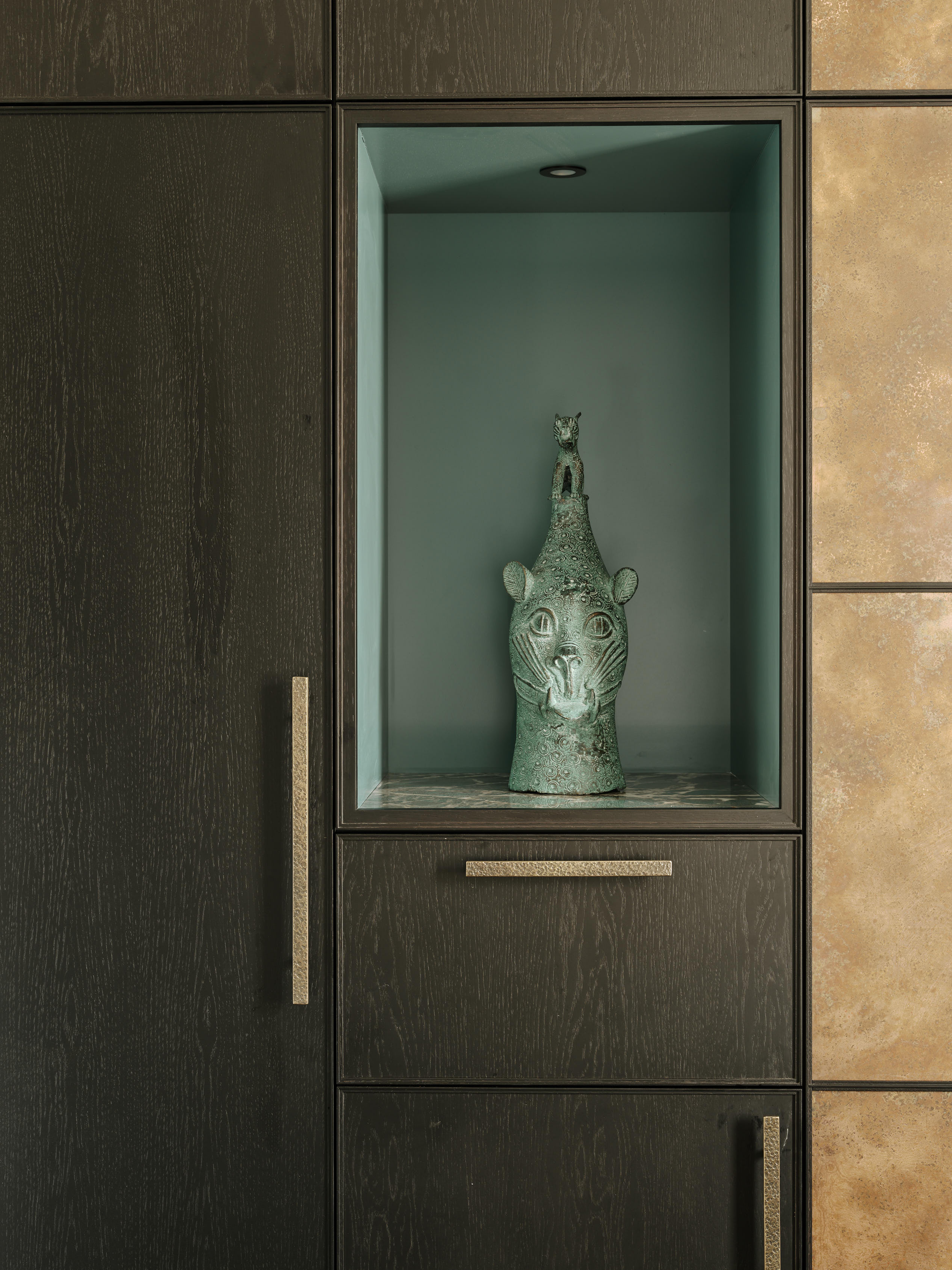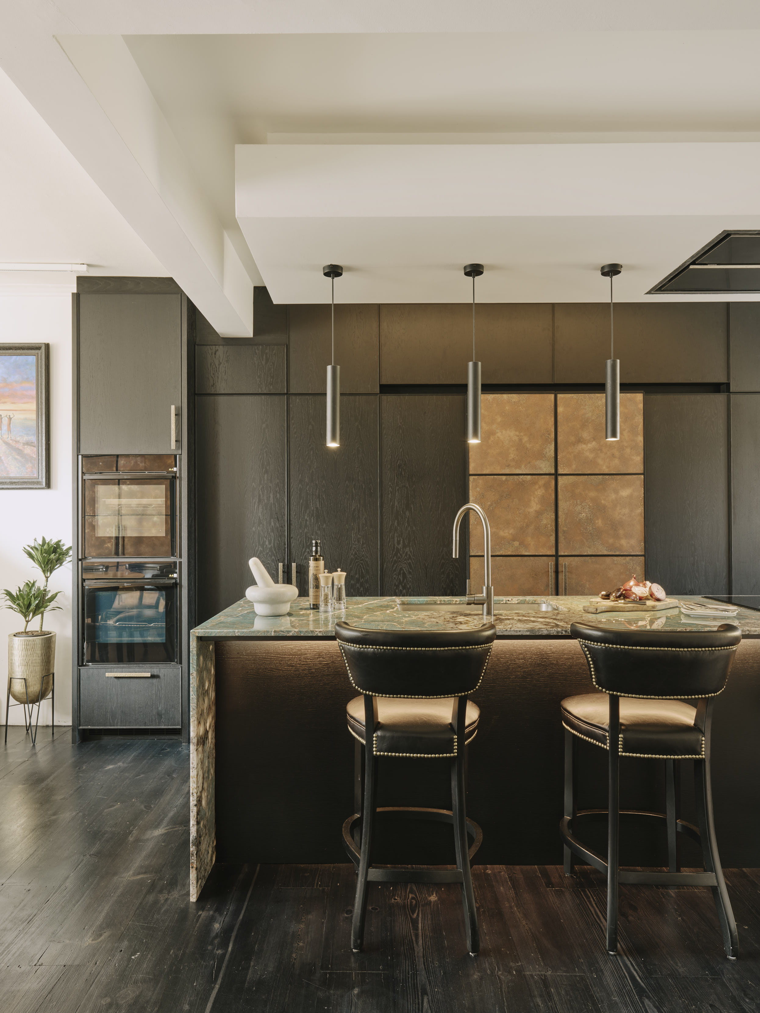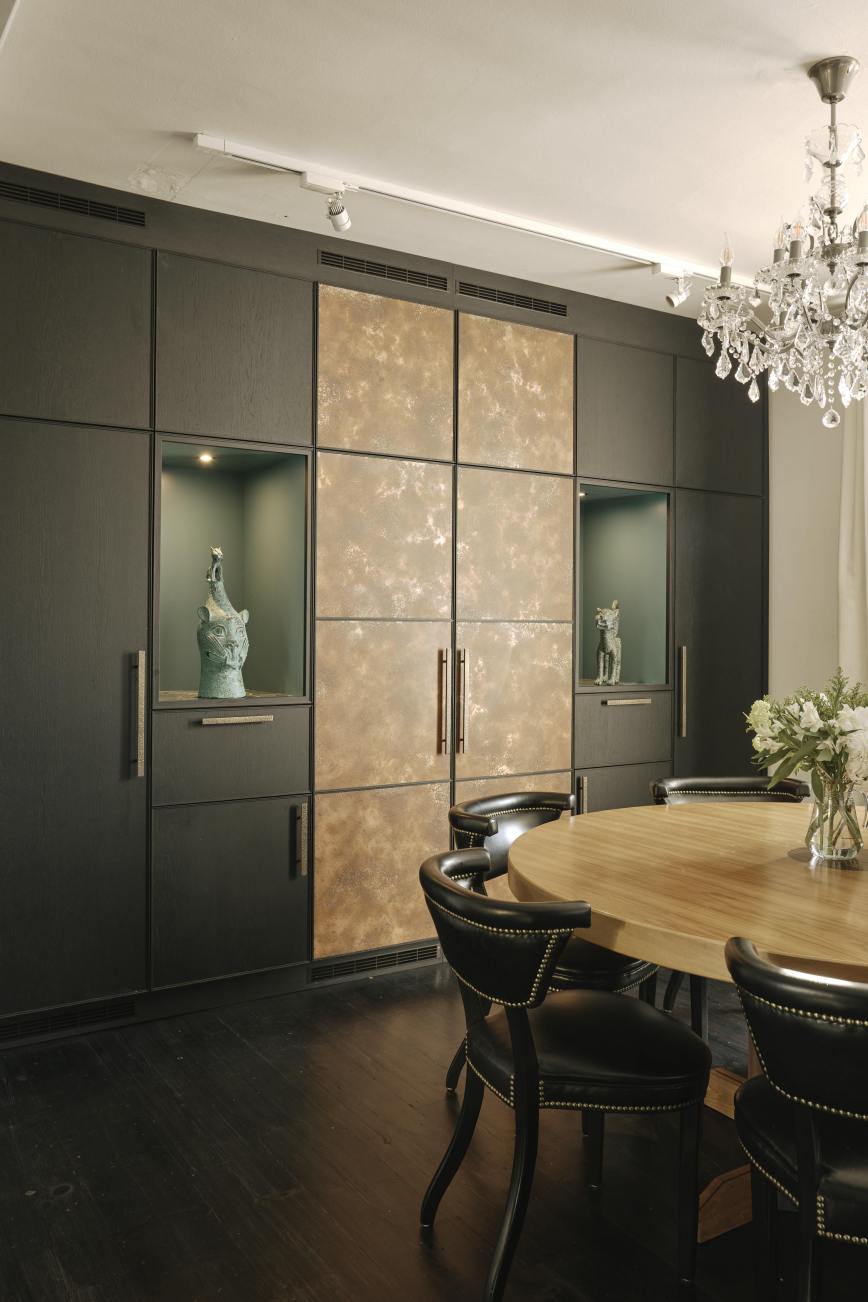 Our client downsized from a large house in the country to a Victorian townhouse in Central London, so storage space in the kitchen was a big requirement. She also loved Ledbury Studio’s aged and patinated copper finish, and wanted to incorporate this into the design. Black stained oak cabinets were chosen as a foil to set off the beautiful copper centrepieces, and echoed in the specially cast handles in aged and distressed brass. Sliding copper doors break up the bank of tall cupboards on the back wall, revealing open shelves backed with Latina antique glass which is back lit with led lighting.