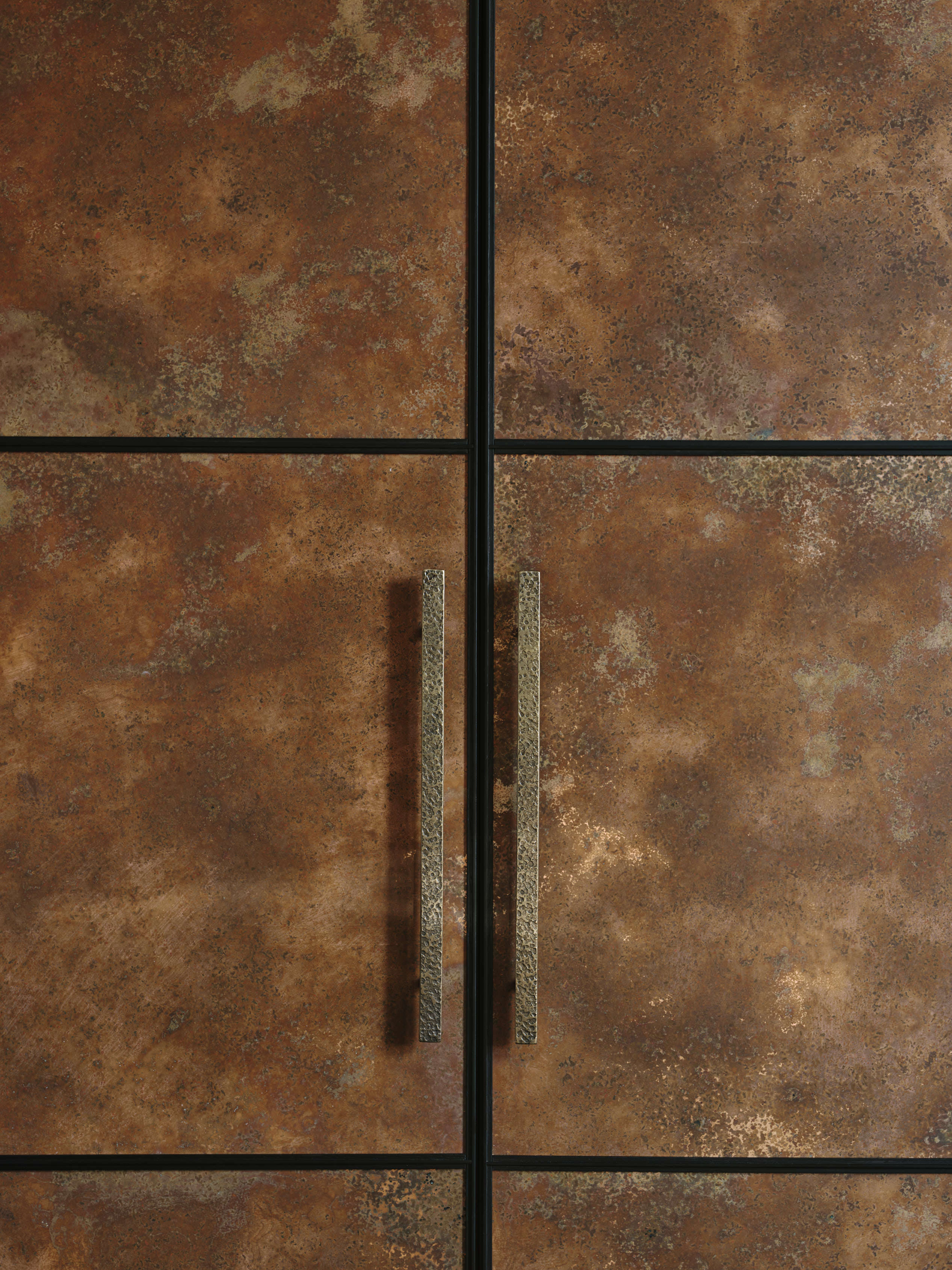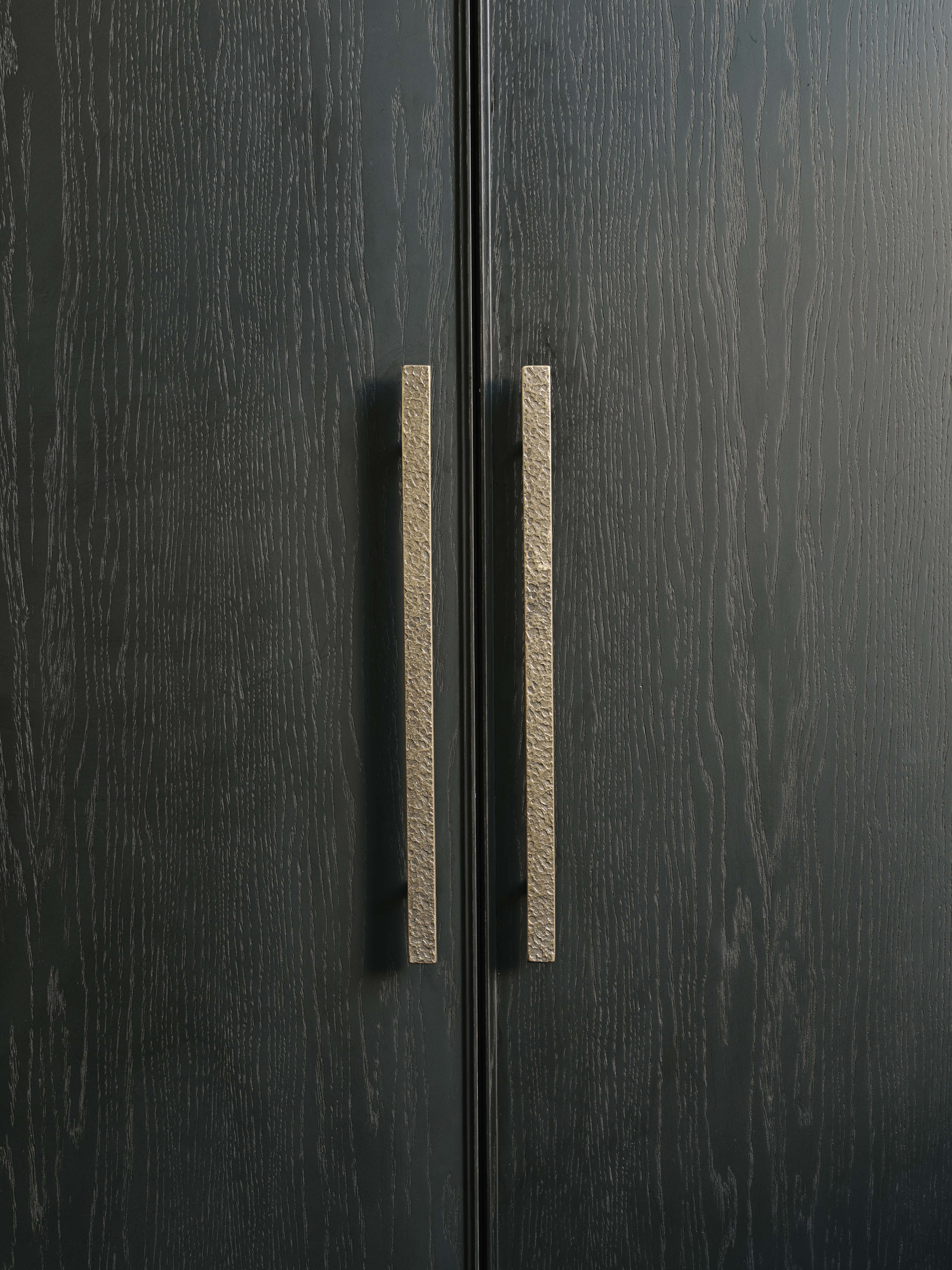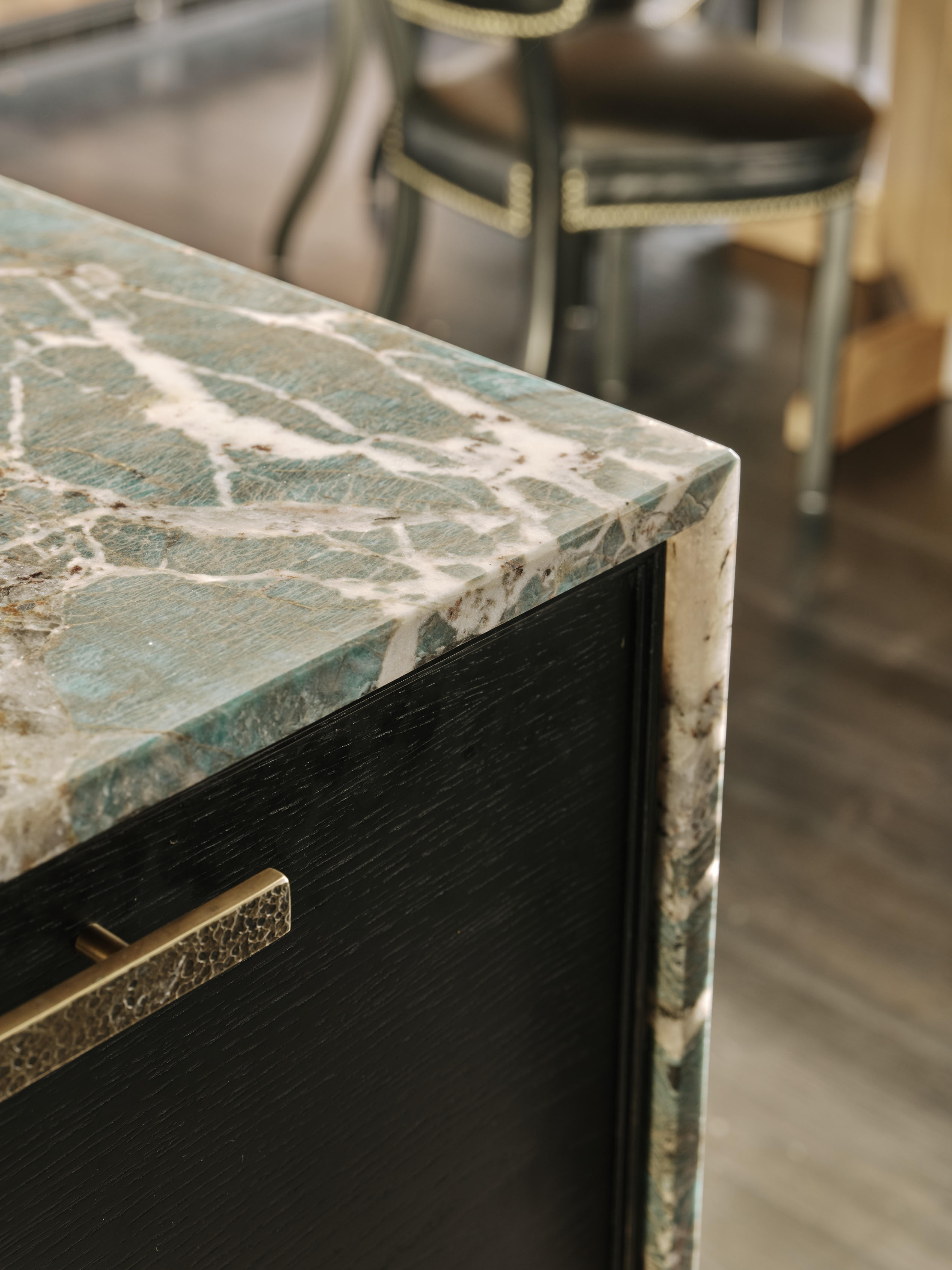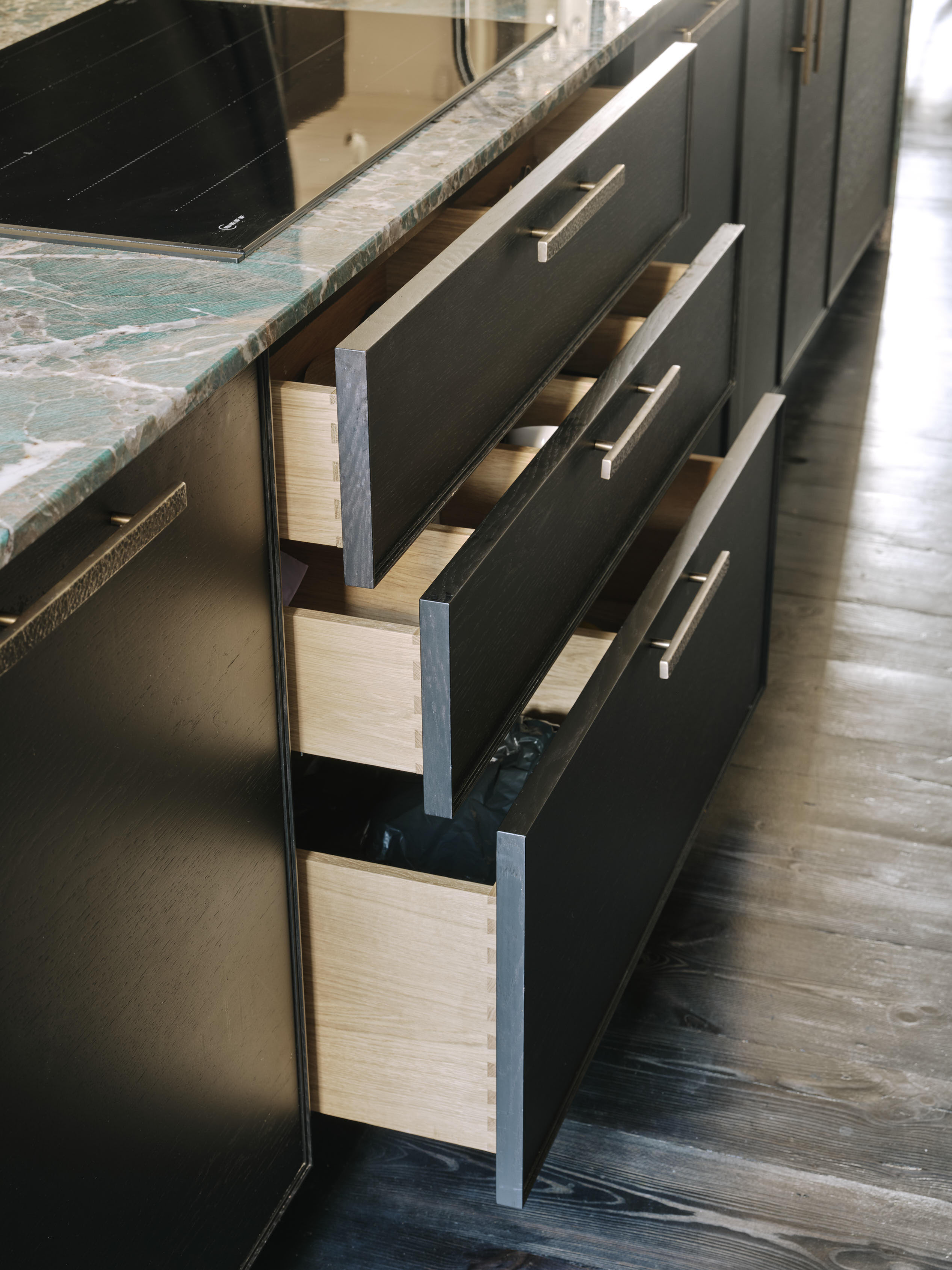 Our client downsized from a large house in the country to a Victorian townhouse in Central London, so storage space in the kitchen was a big requirement. She also loved Ledbury Studio’s aged and patinated copper finish, and wanted to incorporate this into the design. Black stained oak cabinets were chosen as a foil to set off the beautiful copper centrepieces, and echoed in the specially cast handles in aged and distressed brass. Sliding copper doors break up the bank of tall cupboards on the back wall, revealing open shelves backed with Latina antique glass which is back lit with led lighting.
