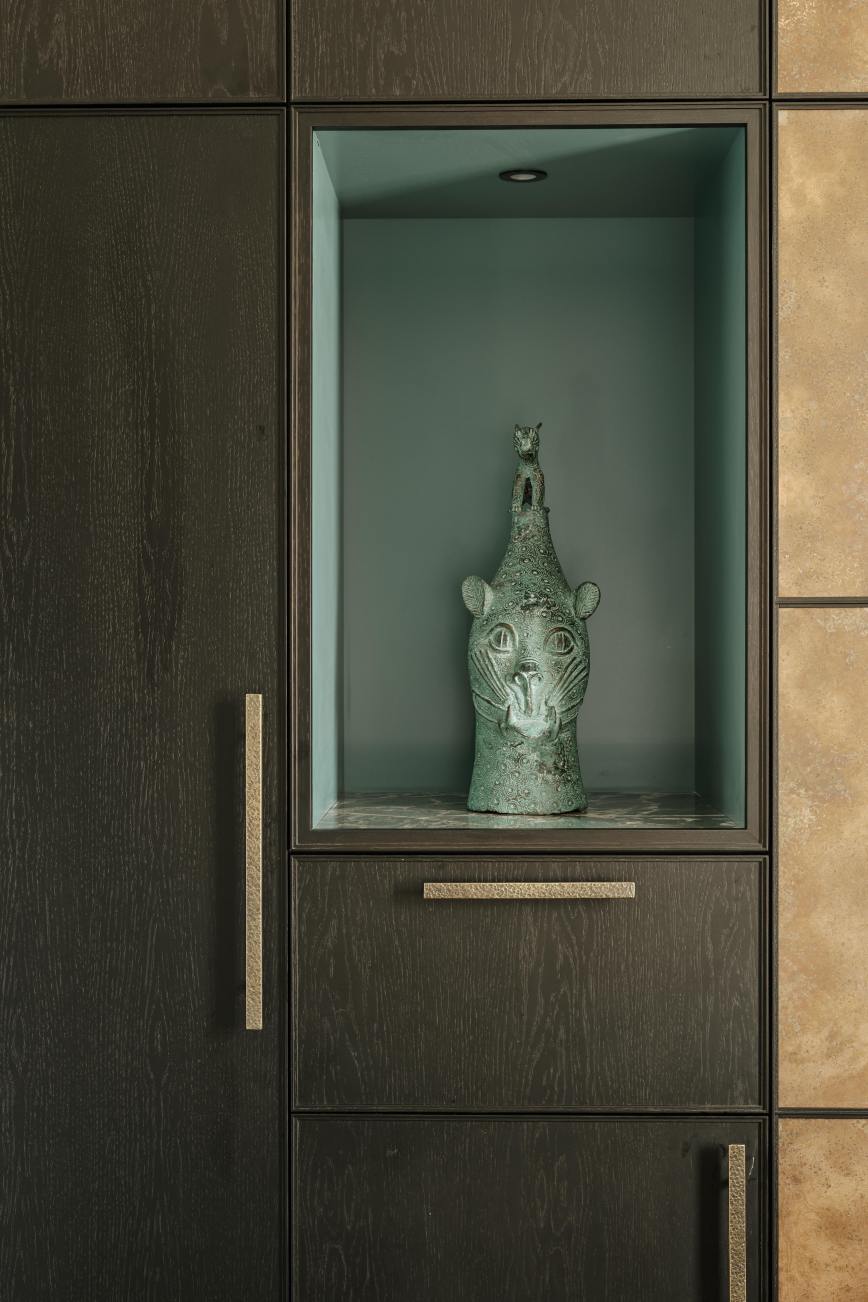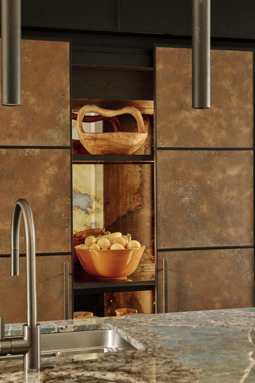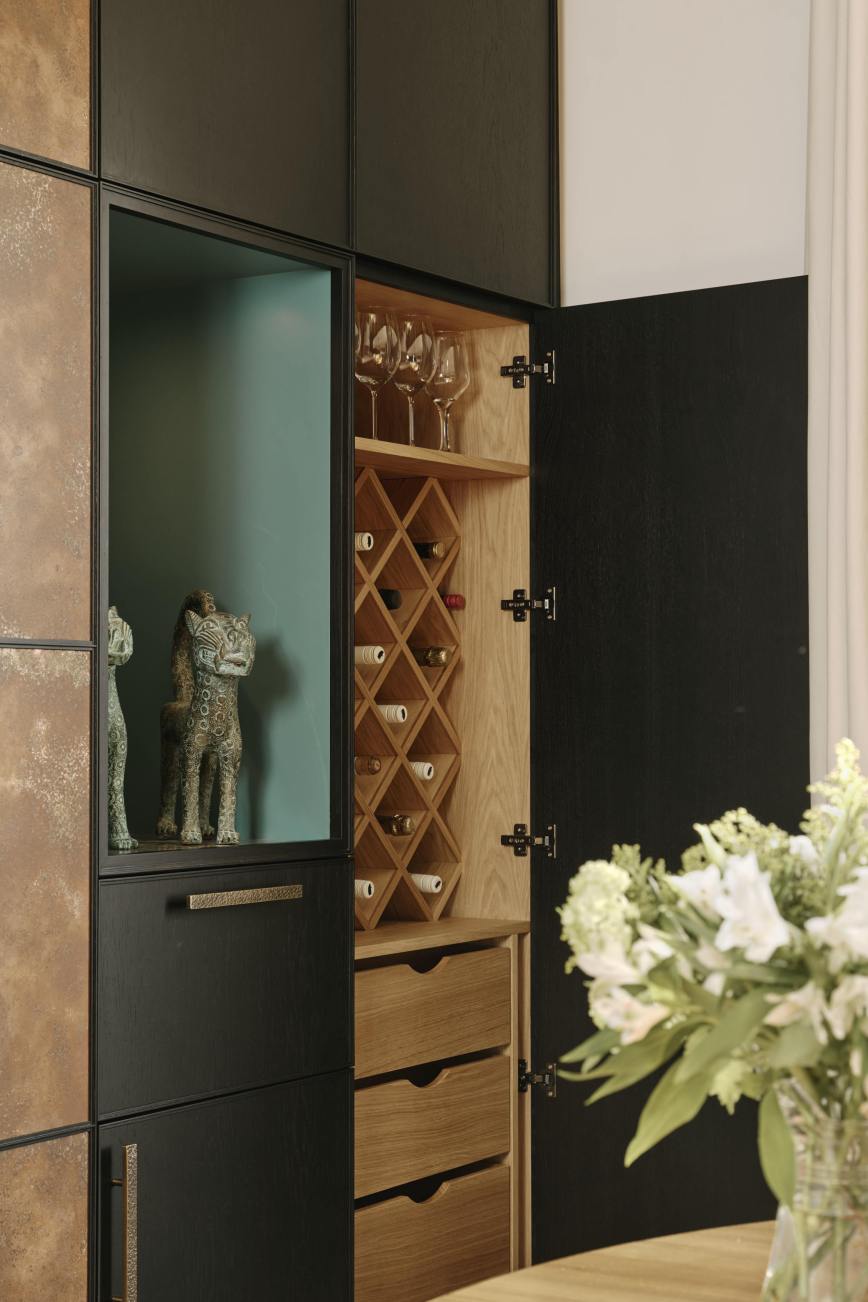 In the dining area of the kitchen, the double larder doors are clad in patinated copper as a centrepiece, and flanked with open shelves painted in Vardo by Farrow and Ball, to display our client’s decorative pieces. Our client’s brief was fulfilled…she has a glamorous and contemporary kitchen without compromising on storage space, job done!