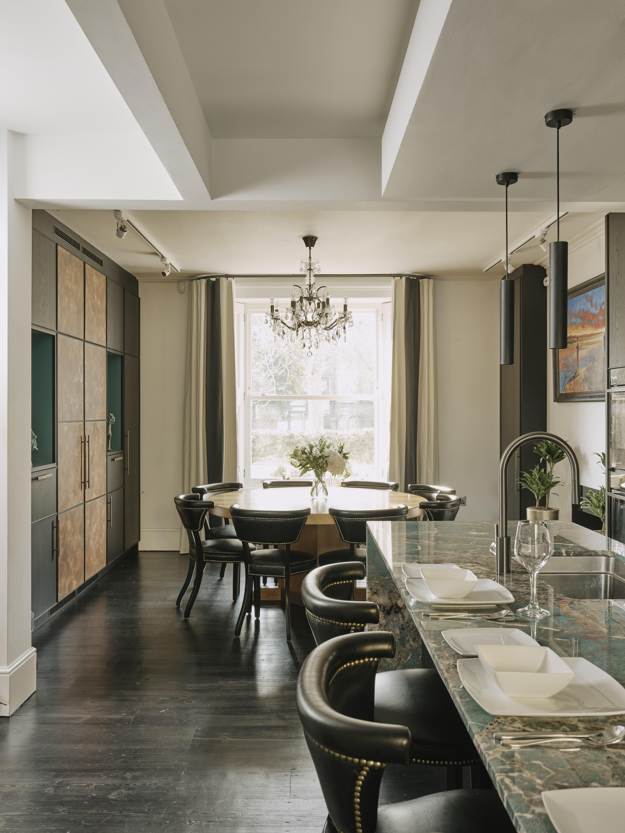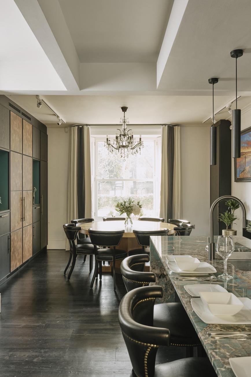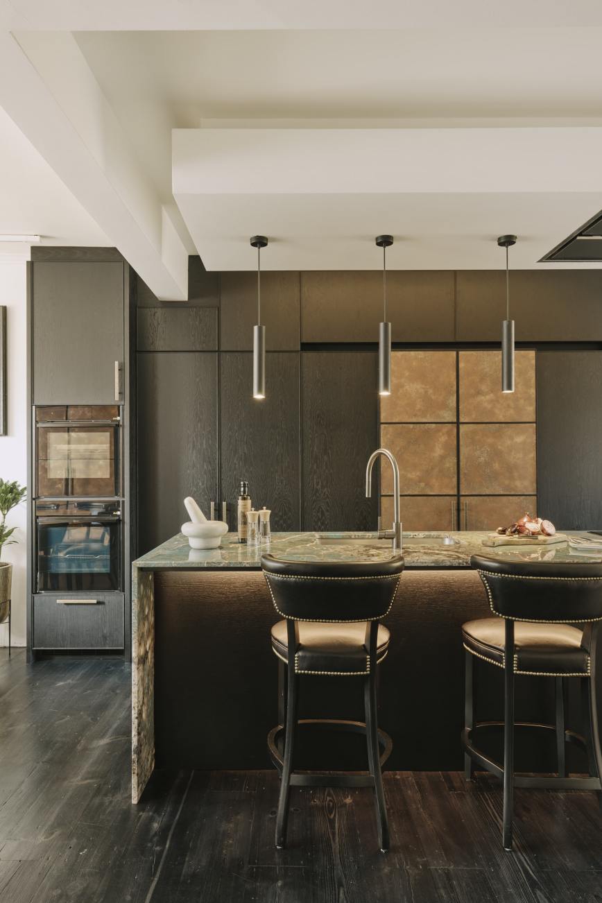 In the dining area of the kitchen, the double larder doors are clad in patinated copper as a centrepiece, and flanked with open shelves painted in Vardo by Farrow and Ball, to display our client’s decorative pieces. Our client’s brief was fulfilled…she has a glamorous and contemporary kitchen without compromising on storage space, job done!