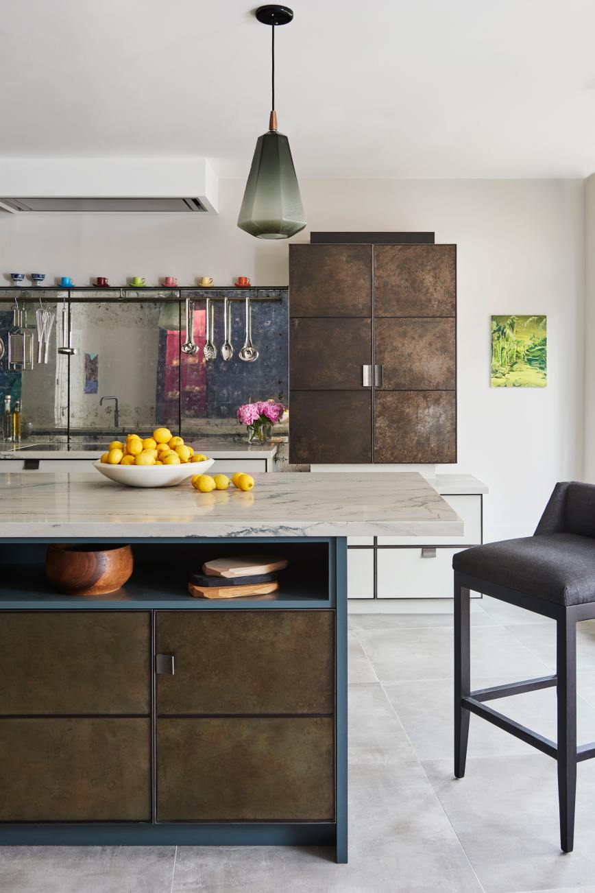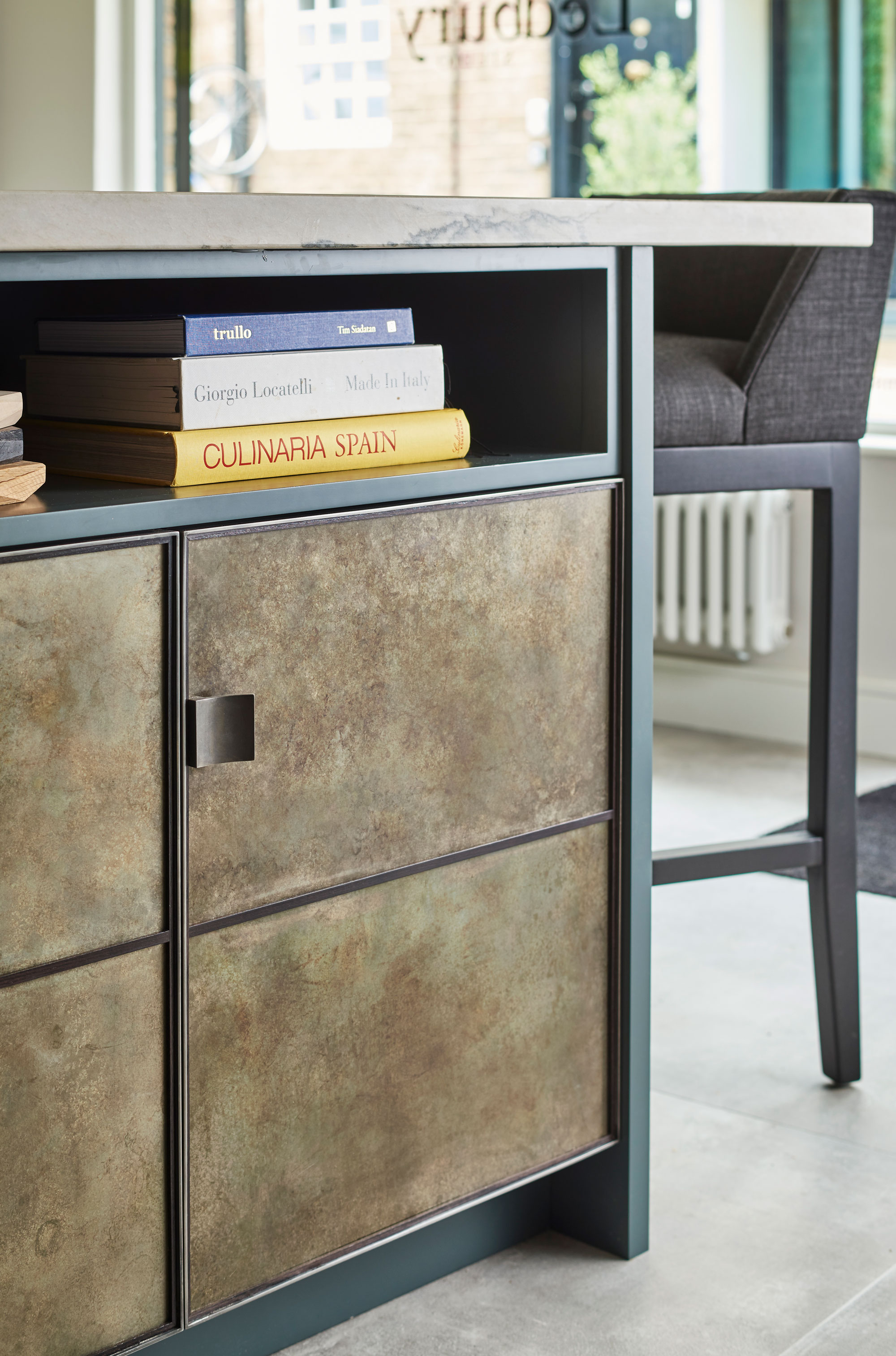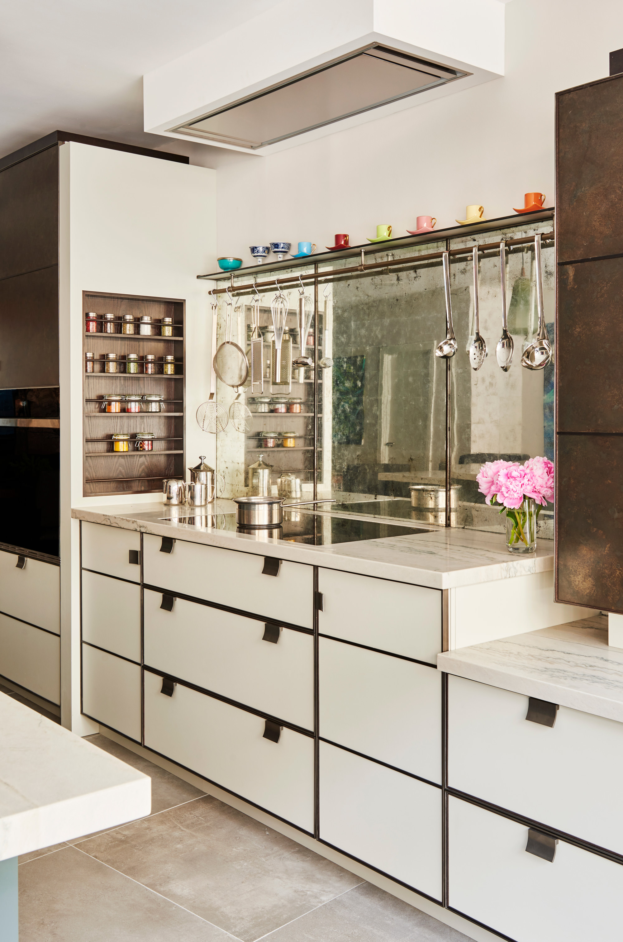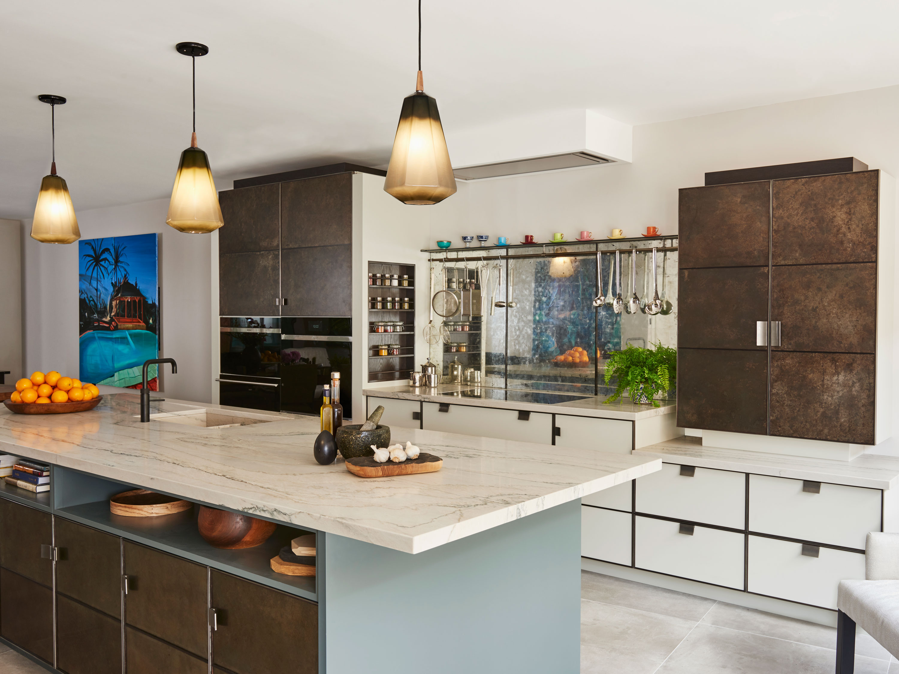 Our original showroom display in the Ledbury Mews showroom is still very much what we are all about. Painted cupboards and drawers are framed in bead blasted stainless steel, and aged and patinated zinc panels provide the wow factor to the back of the island and around the Wolf ovens. Solid Bianco Macaubas quartzite worktops with a beautiful sink in the same stone and specially designed concave handles made from blasted stainless steel complete the look … stylish elegant and totally functional.