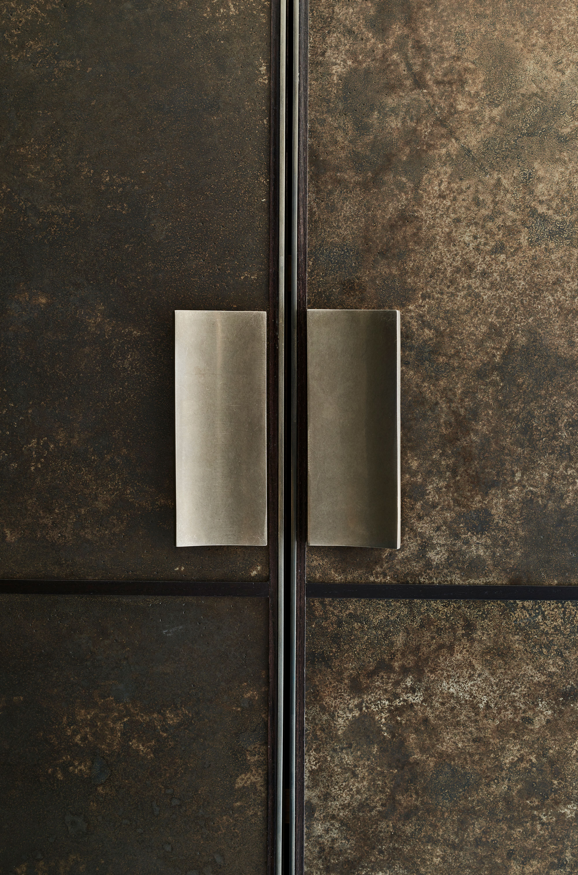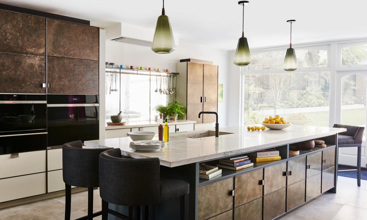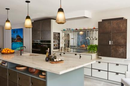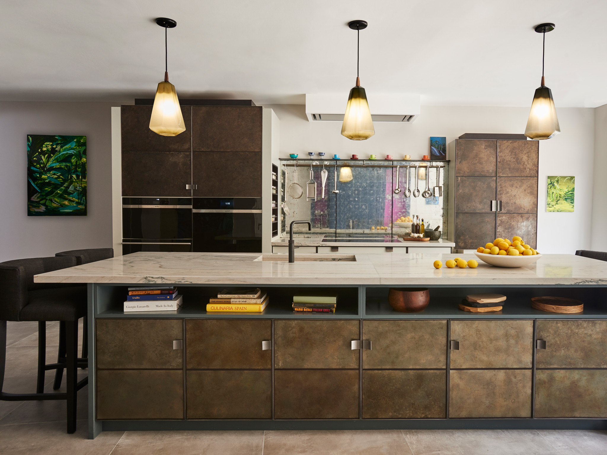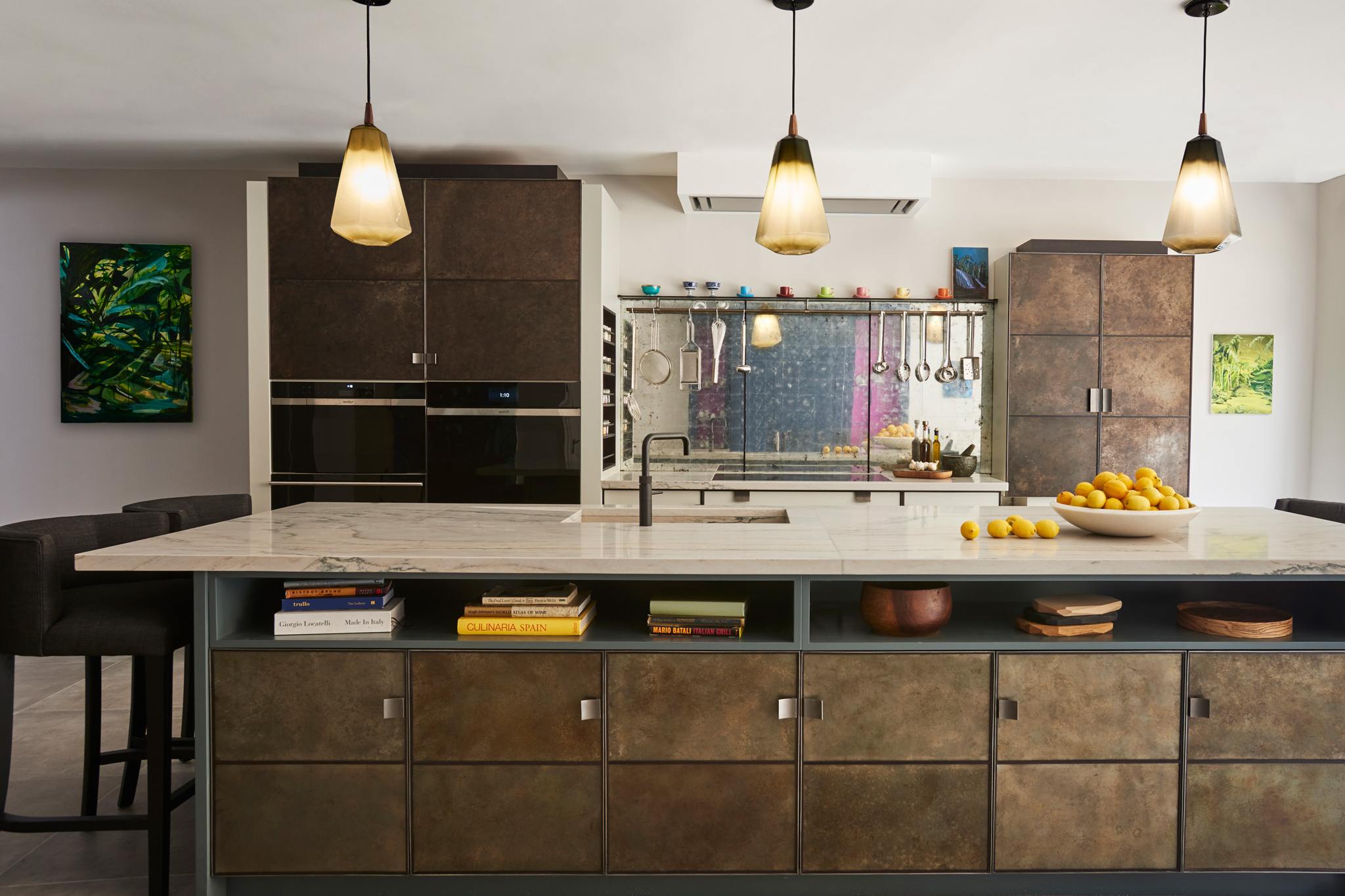 Our original showroom display in the Ledbury Mews showroom is still very much what we are all about. Painted cupboards and drawers are framed in bead blasted stainless steel, and aged and patinated zinc panels provide the wow factor to the back of the island and around the Wolf ovens. Solid Bianco Macaubas quartzite worktops with a beautiful sink in the same stone and specially designed concave handles made from blasted stainless steel complete the look … stylish elegant and totally functional.