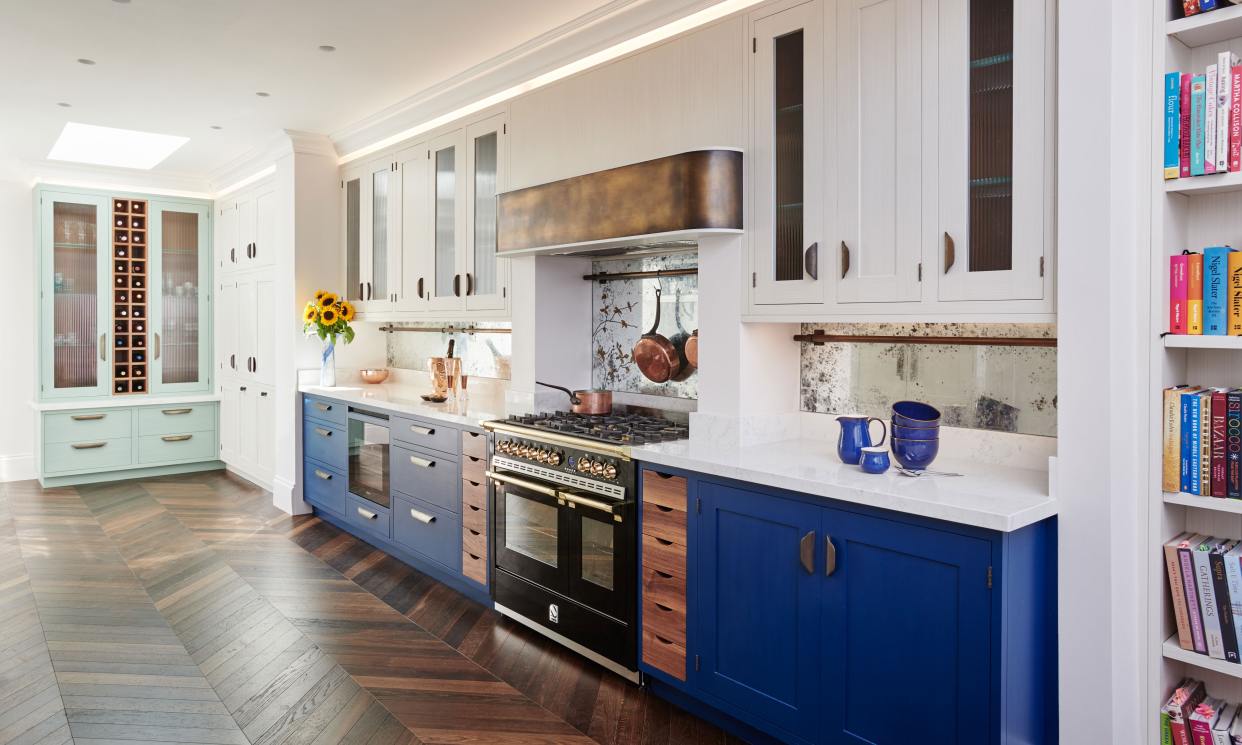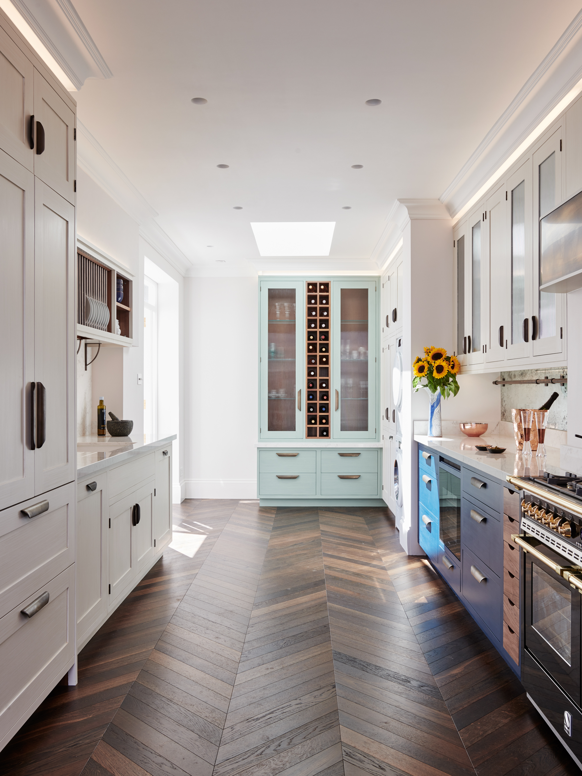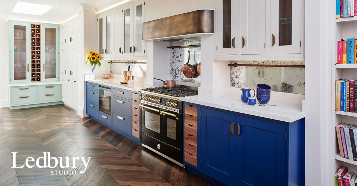 The kitchen design is mainly taken from our Ledbury Shaker collection, but the client was also keen to introduce our signature use of metals. We added aged brass to the edge of the cooker hood and also used it for the plate rack’s supporting brackets, the hanging rails mounted on the splashbacks and the cupboard handles. Fluted glass was chosen for the cupboard fronts to keep the design light and airy but without having the contents on display, and the kitchen was handpainted in situ to compliment the client's collection of chinaware. Finally to increase the sense of light and space Verre Eglomise was chosen for the splashbacks whereby pure gold leaf is applied to the reverse of toughened glass and antiqued. Demonstrating an eye for detail our client requested a floral design be gilded on to the surface behind the hob, transforming it into a standout feature.