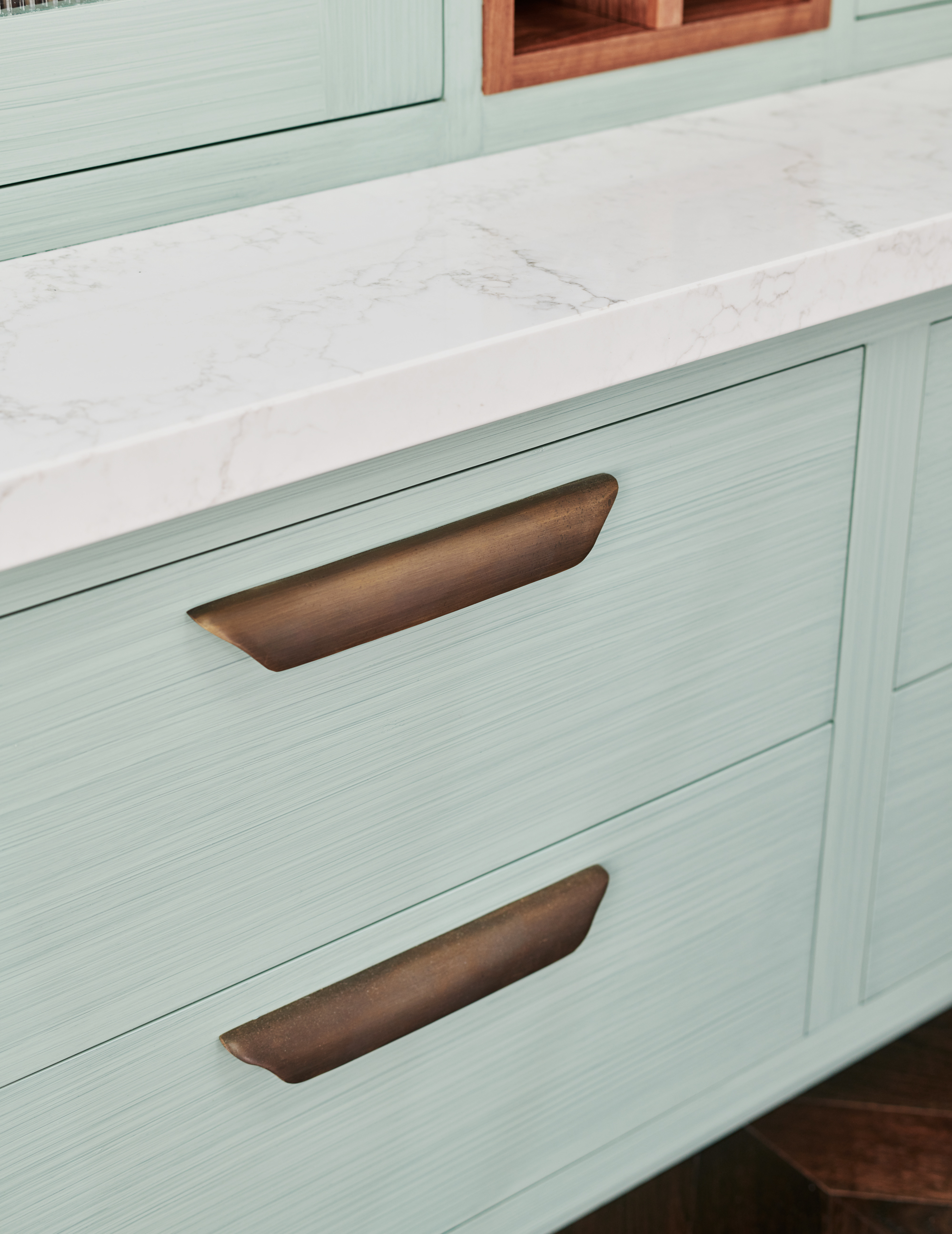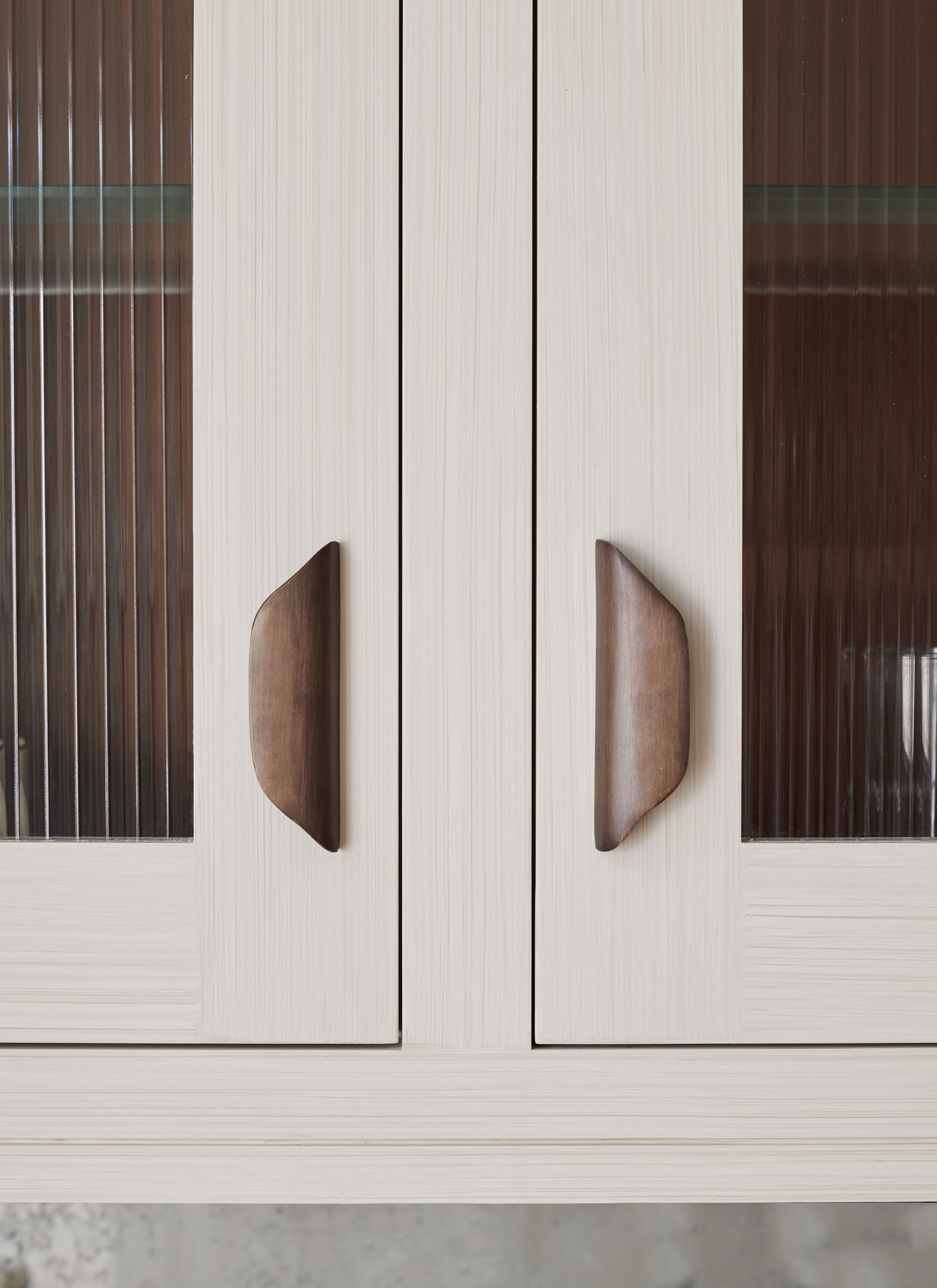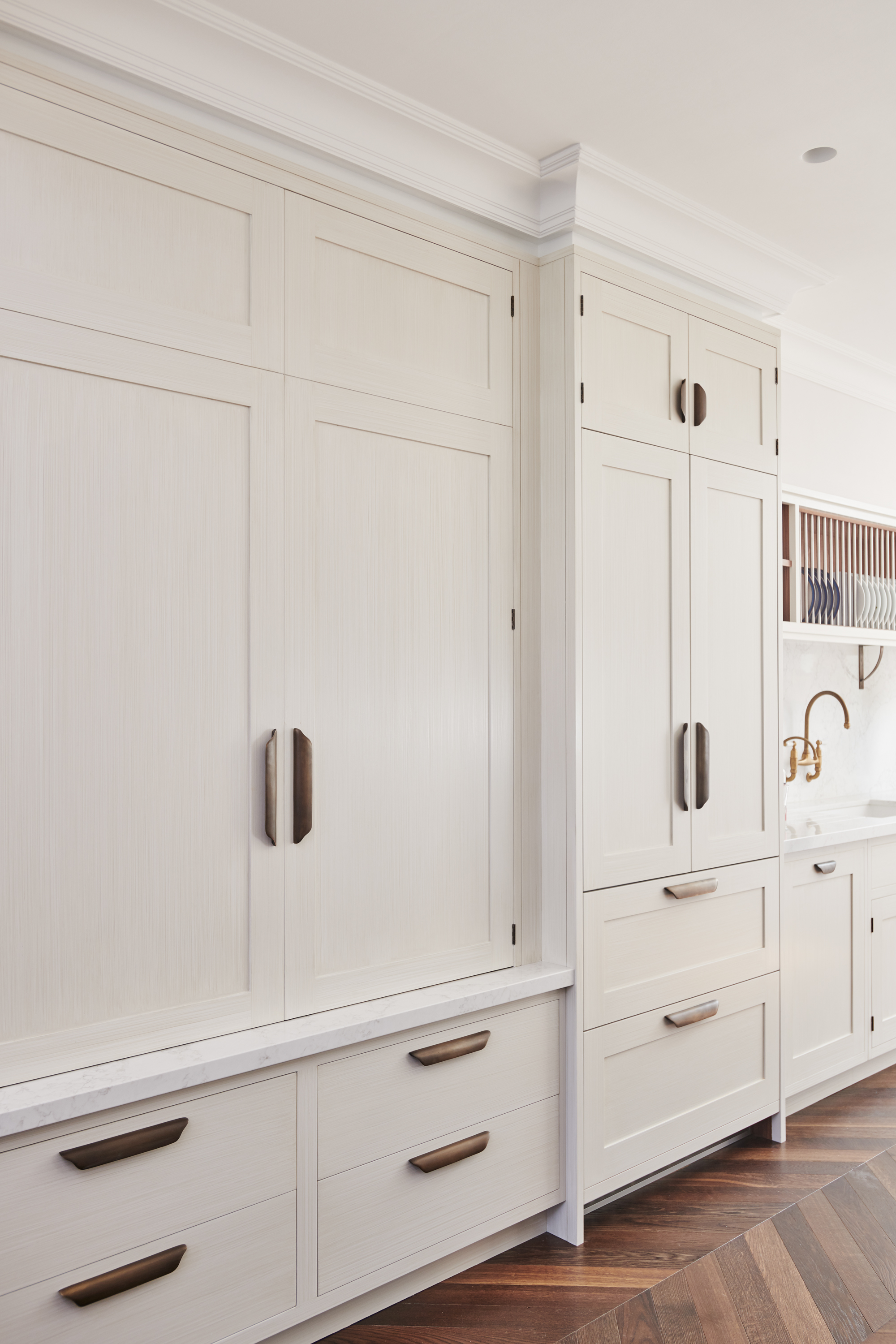 The kitchen design is mainly taken from our Ledbury Shaker collection, but the client was also keen to introduce our signature use of metals. We added aged brass to the edge of the cooker hood and also used it for the plate rack’s supporting brackets, the hanging rails mounted on the splashbacks and the cupboard handles. Fluted glass was chosen for the cupboard fronts to keep the design light and airy but without having the contents on display, and the kitchen was handpainted in situ to compliment the client's collection of chinaware. Finally to increase the sense of light and space Verre Eglomise was chosen for the splashbacks whereby pure gold leaf is applied to the reverse of toughened glass and antiqued. Demonstrating an eye for detail our client requested a floral design be gilded on to the surface behind the hob, transforming it into a standout feature.