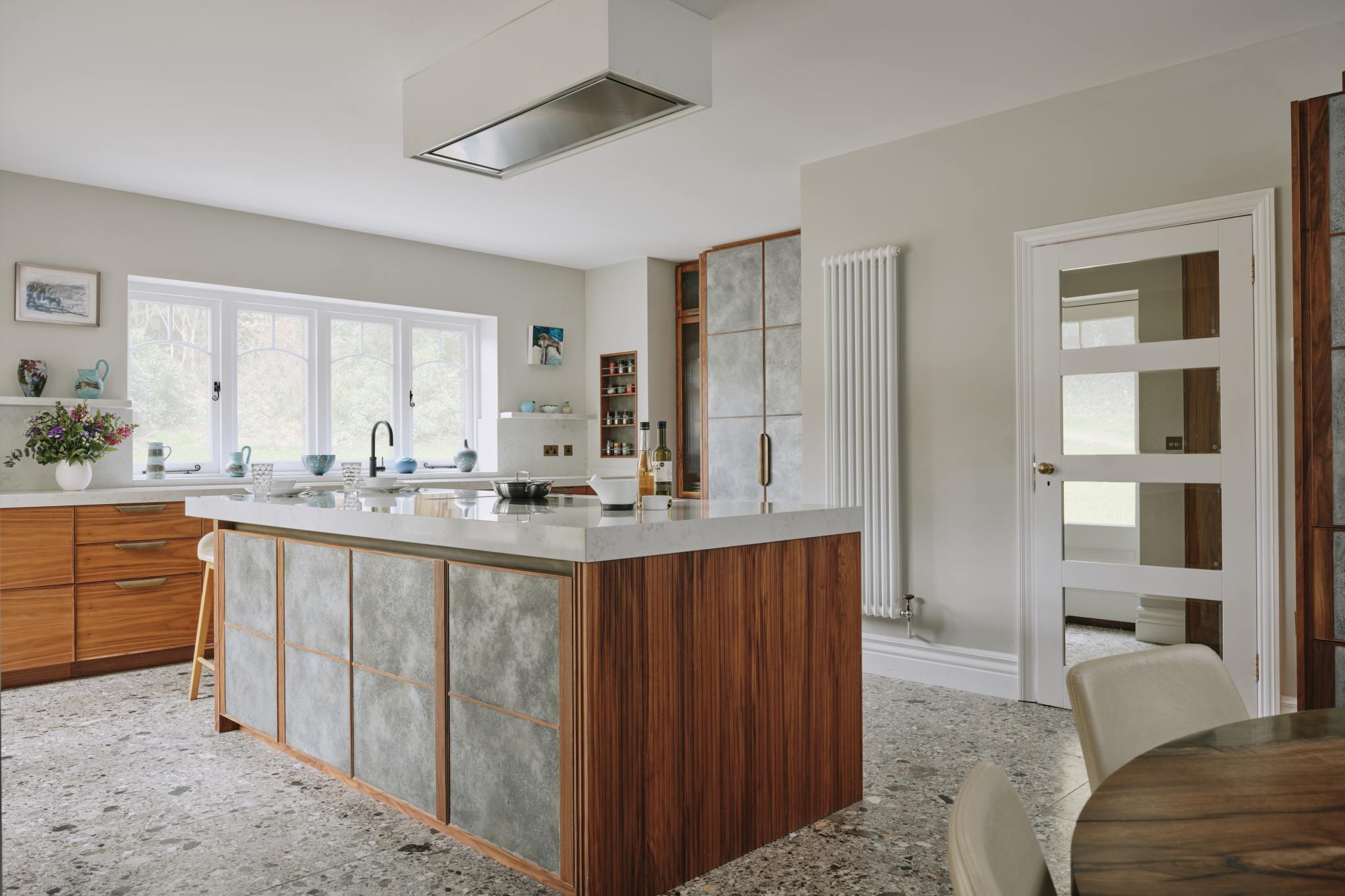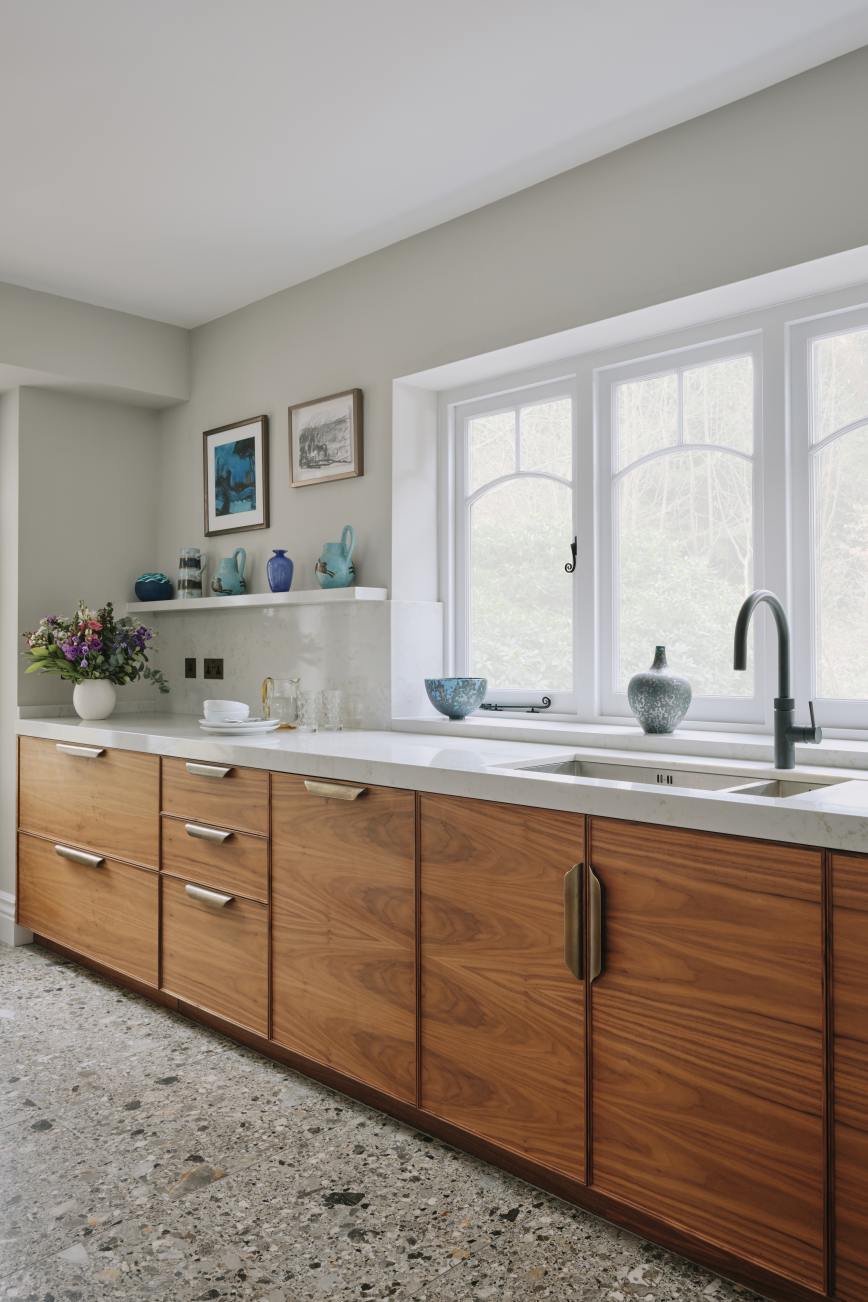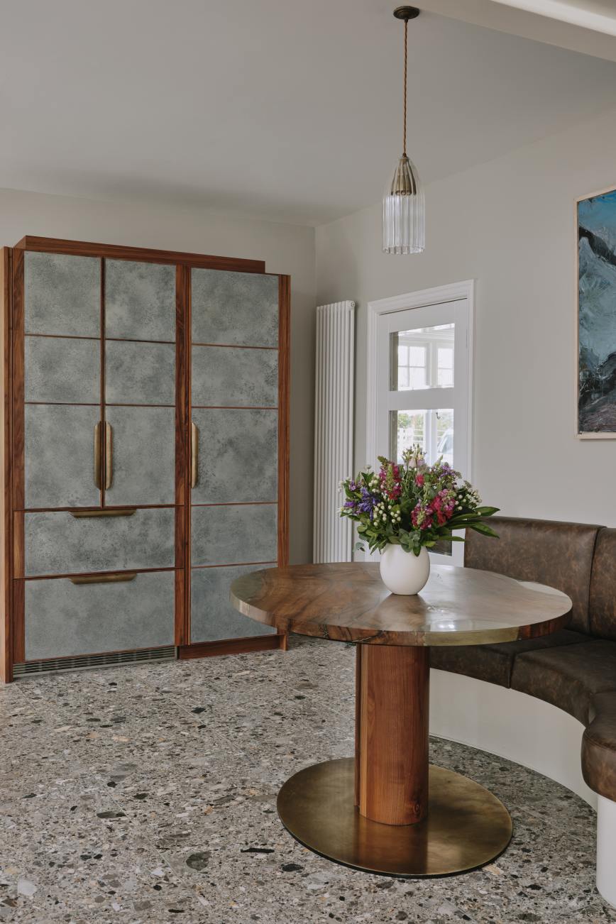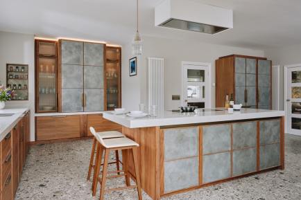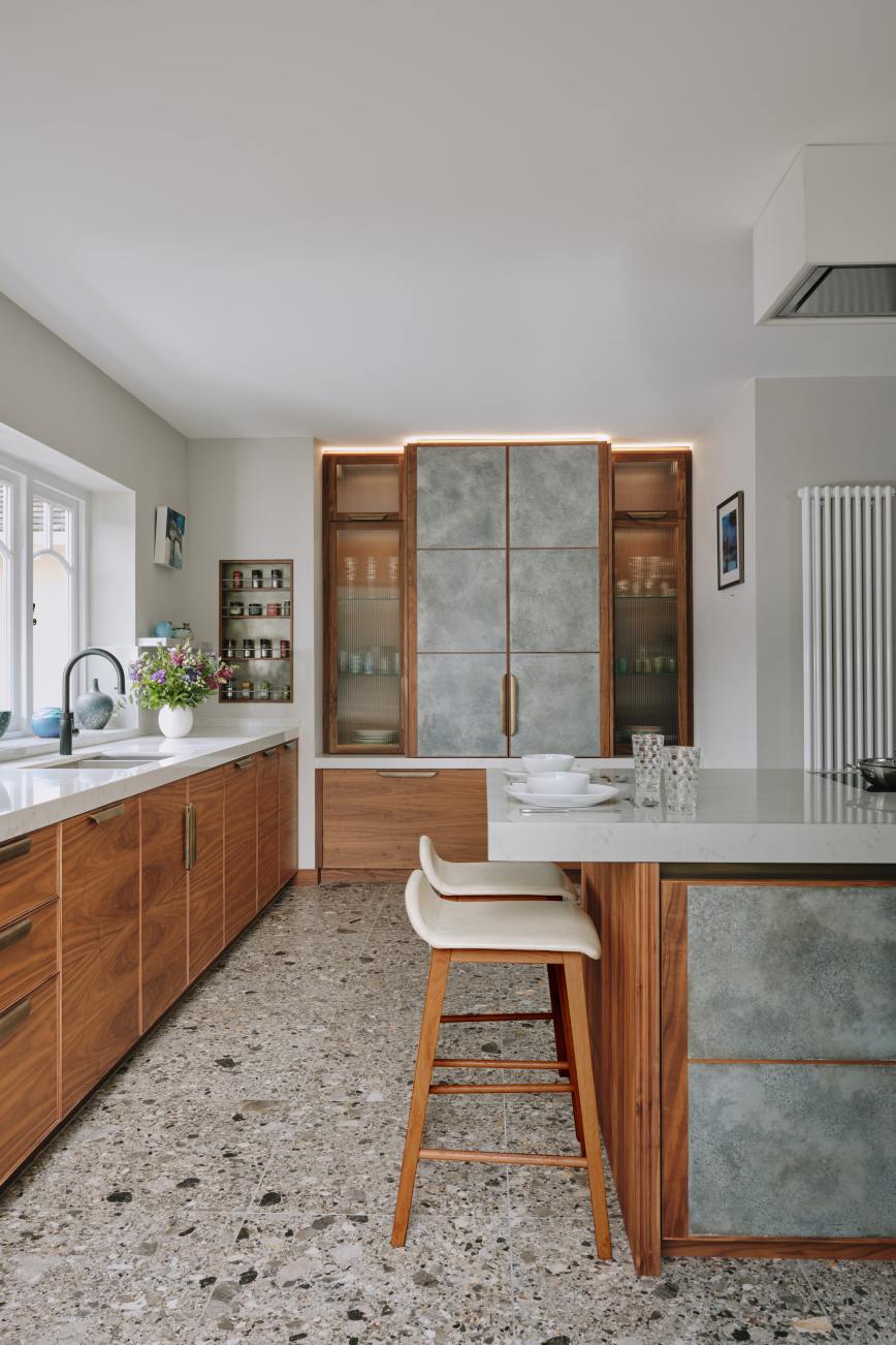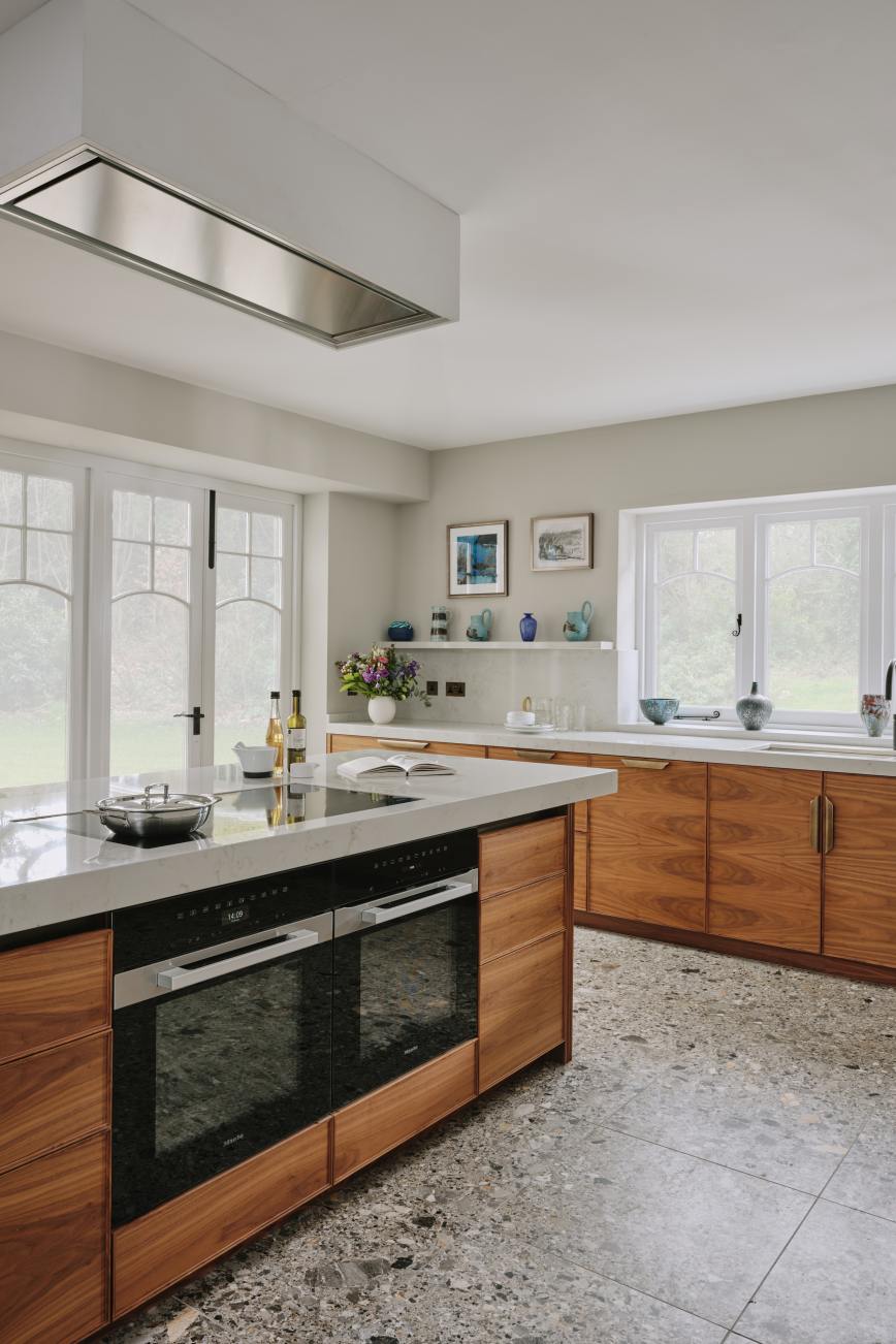 When our client moved from the Midlands to the New Forest, the first thing she wanted was a new kitchen, as this is the room in which she spends most of her time. The room was large enough to incorporate a large island with breakfast bar, a dining space with banquette seating and plenty of tall cupboards for storage space. She chose Ledbury Studio as she wanted something different from the eponymus Shaker look , and felt that a more contemporary aesthetic suited the style and architecture of this Edwardian villa. Charlie chose a beautiful bookmatched walnut veneer which he coordinated with hand patinated zinc panels , edged in the same walnut, and aged brass handles, combining quality craftsmanship, with beautiful materials, for a sleek and contemporary look. Ambre quartz worktops and chic terrazzo flooring complete the design.