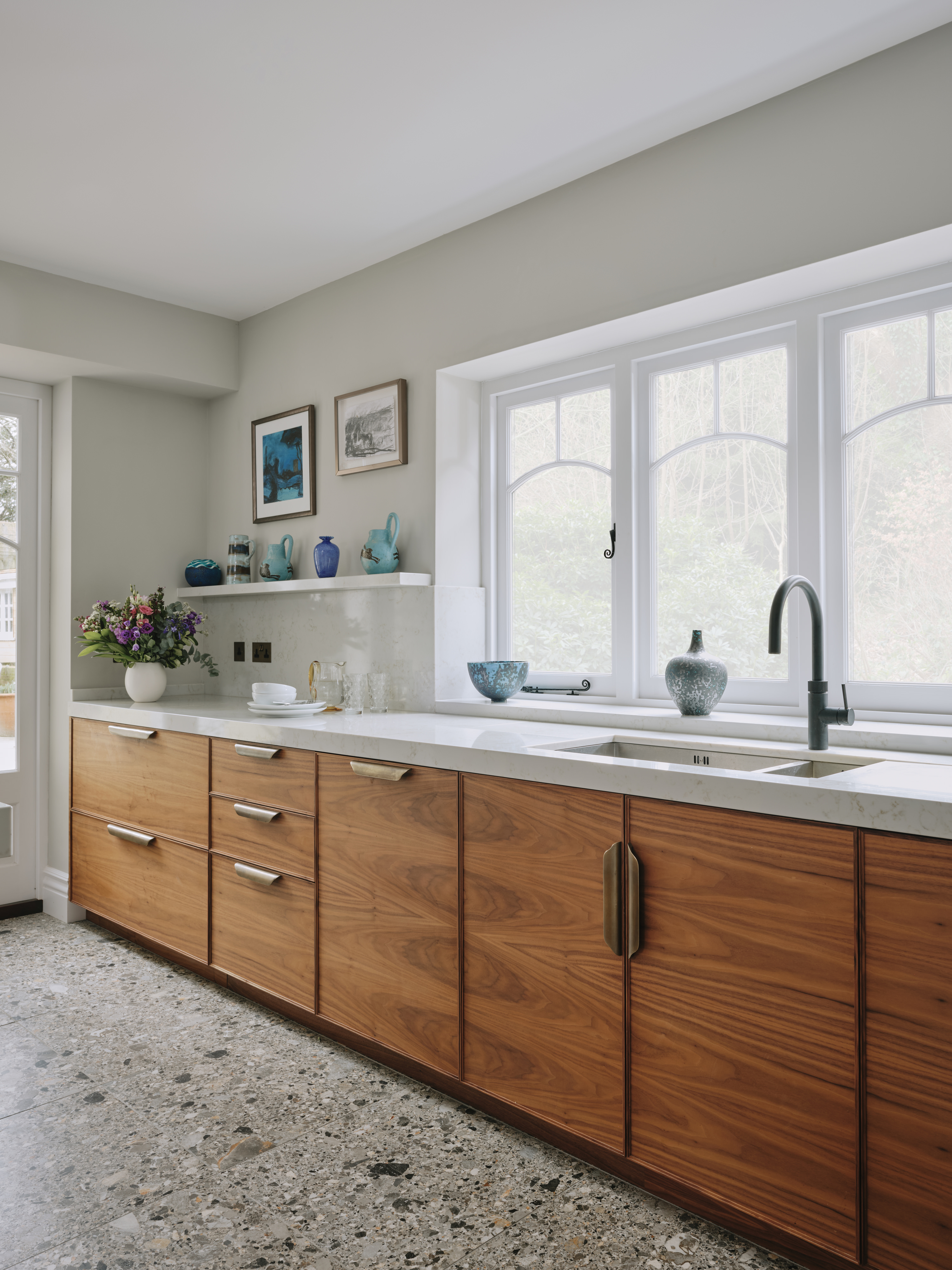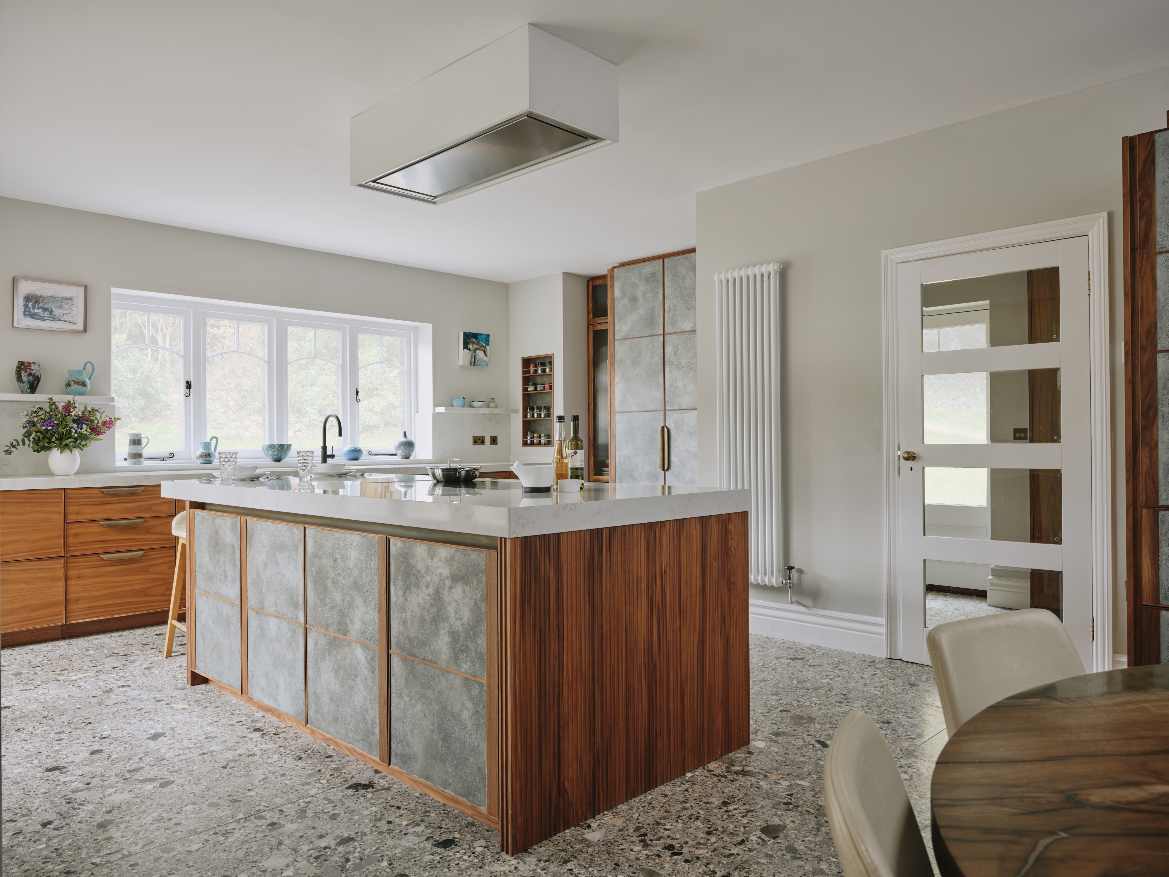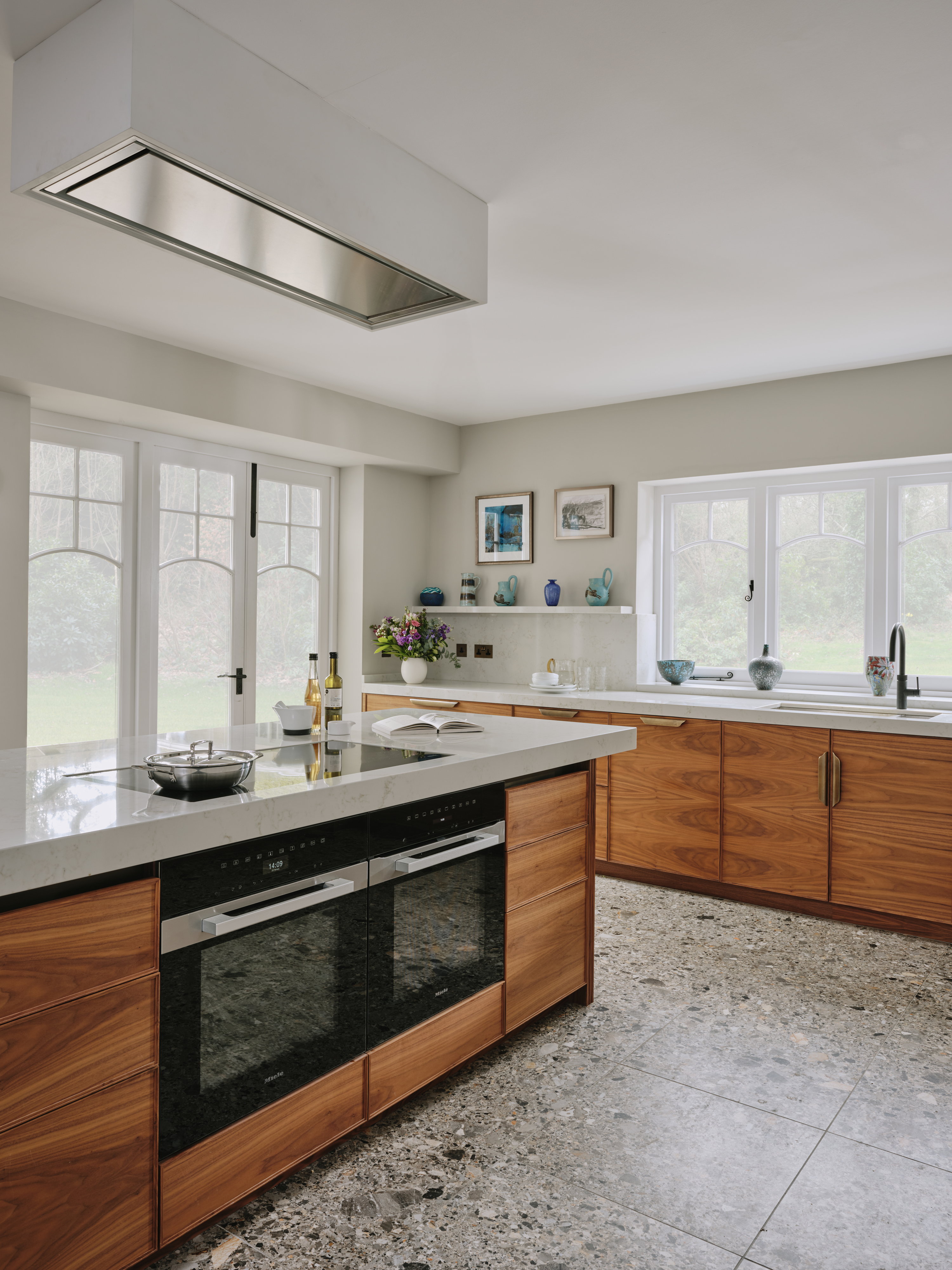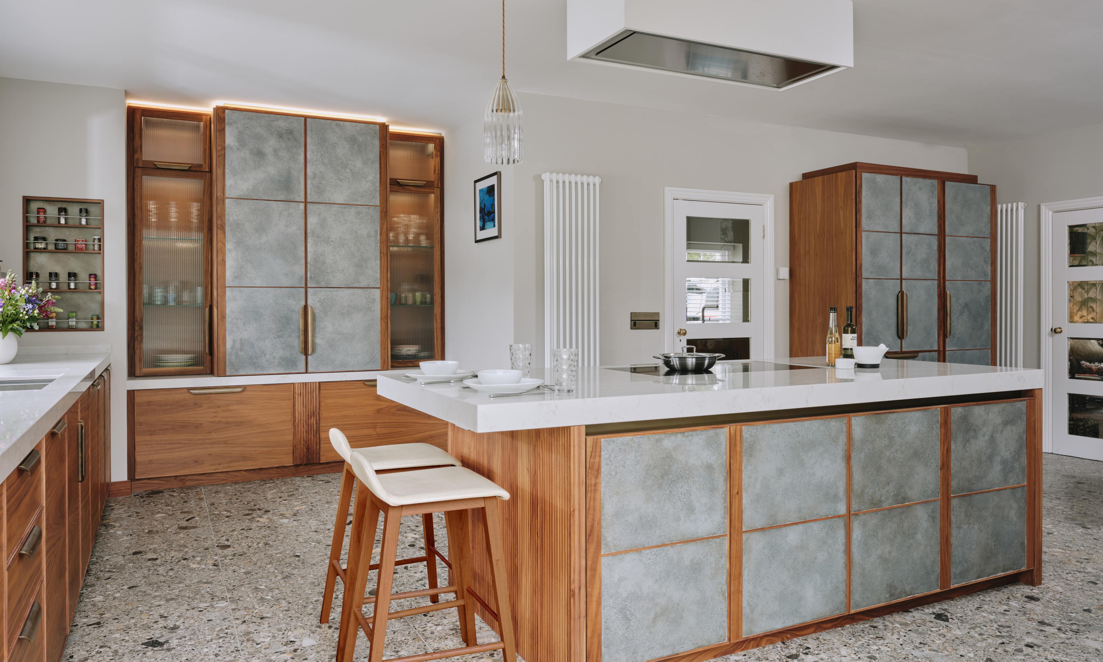 When our client moved from the Midlands to the New Forest, the first thing she wanted was a new kitchen, as this is the room in which she spends most of her time. The room was large enough to incorporate a large island with breakfast bar, a dining space with banquette seating and plenty of tall cupboards for storage space. She chose Ledbury Studio as she wanted something different from the eponymus Shaker look , and felt that a more contemporary aesthetic suited the style and architecture of this Edwardian villa. Charlie chose a beautiful bookmatched walnut veneer which he coordinated with hand patinated zinc panels , edged in the same walnut, and aged brass handles, combining quality craftsmanship, with beautiful materials, for a sleek and contemporary look. Ambre quartz worktops and chic terrazzo flooring complete the design.