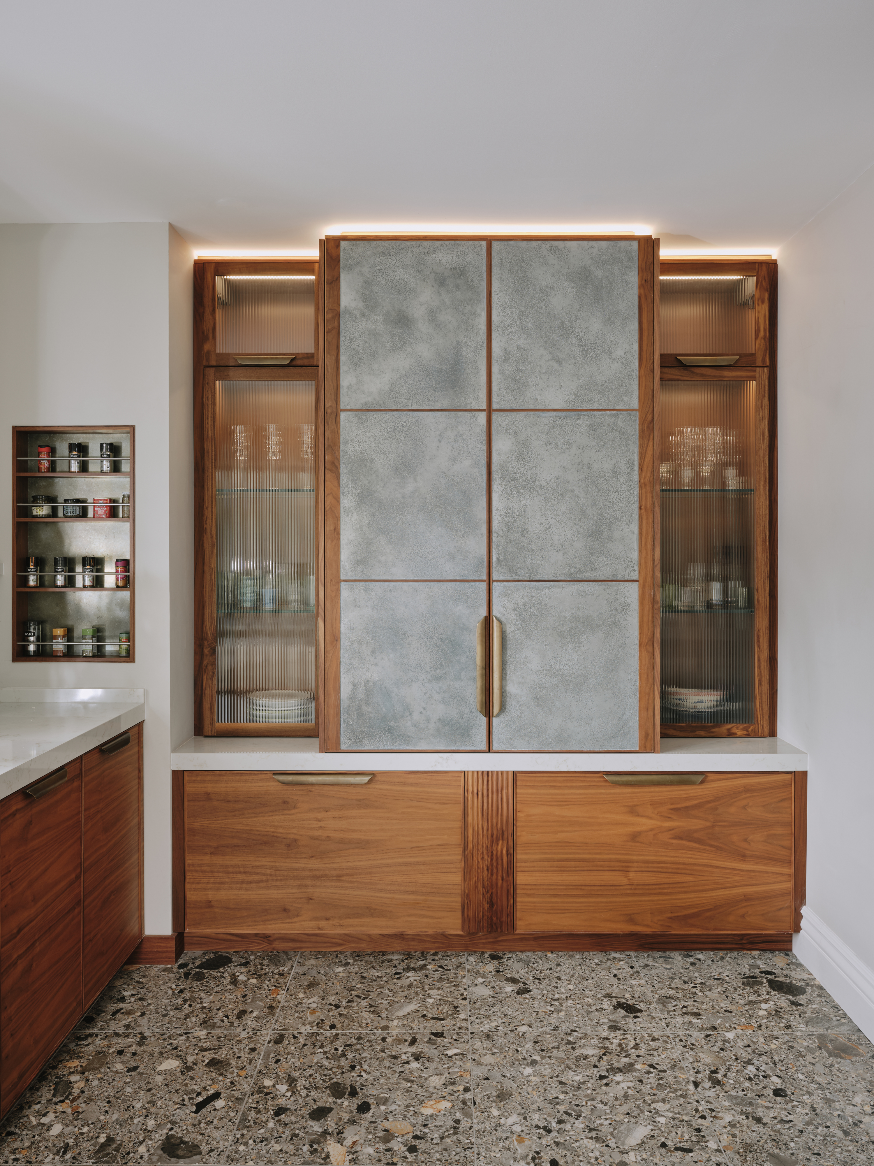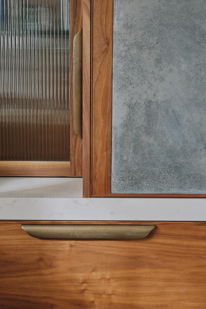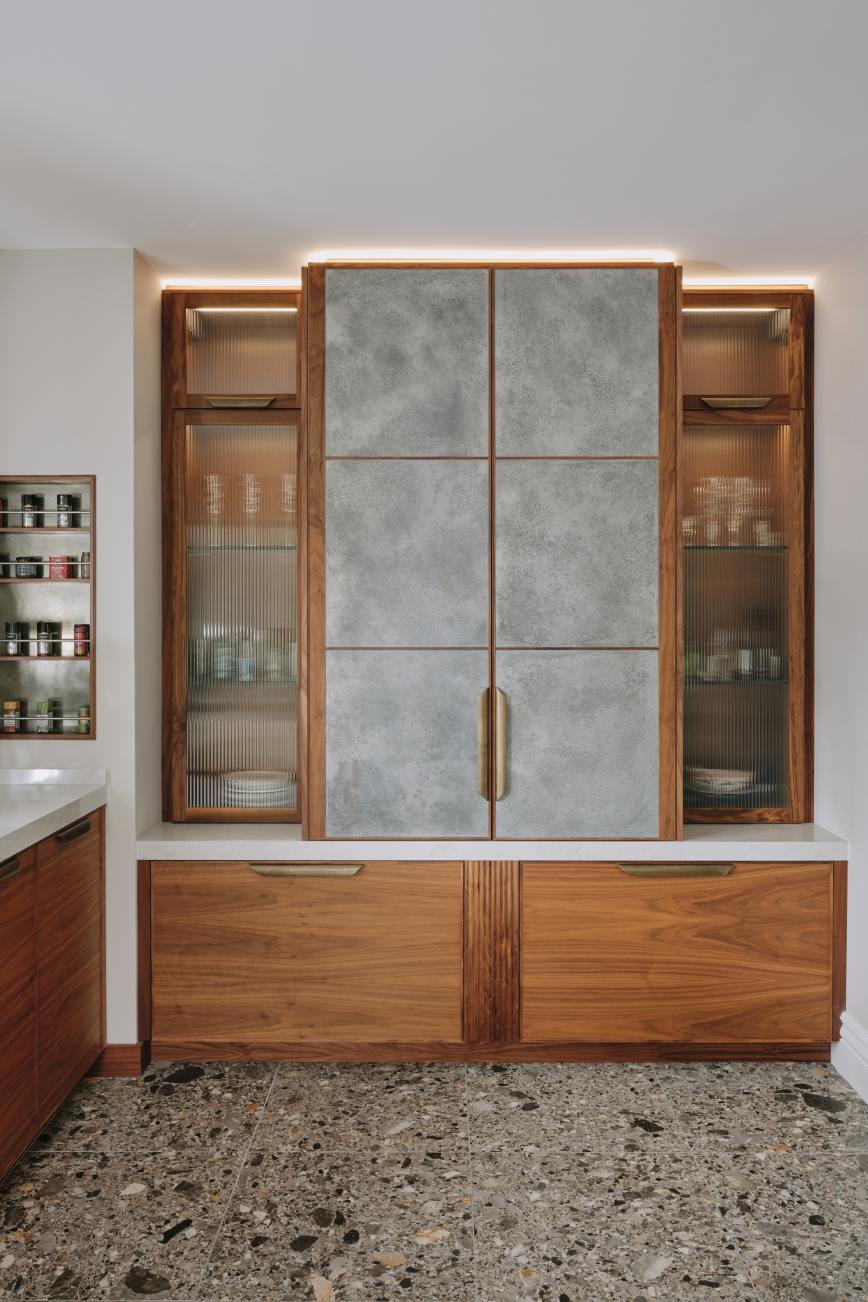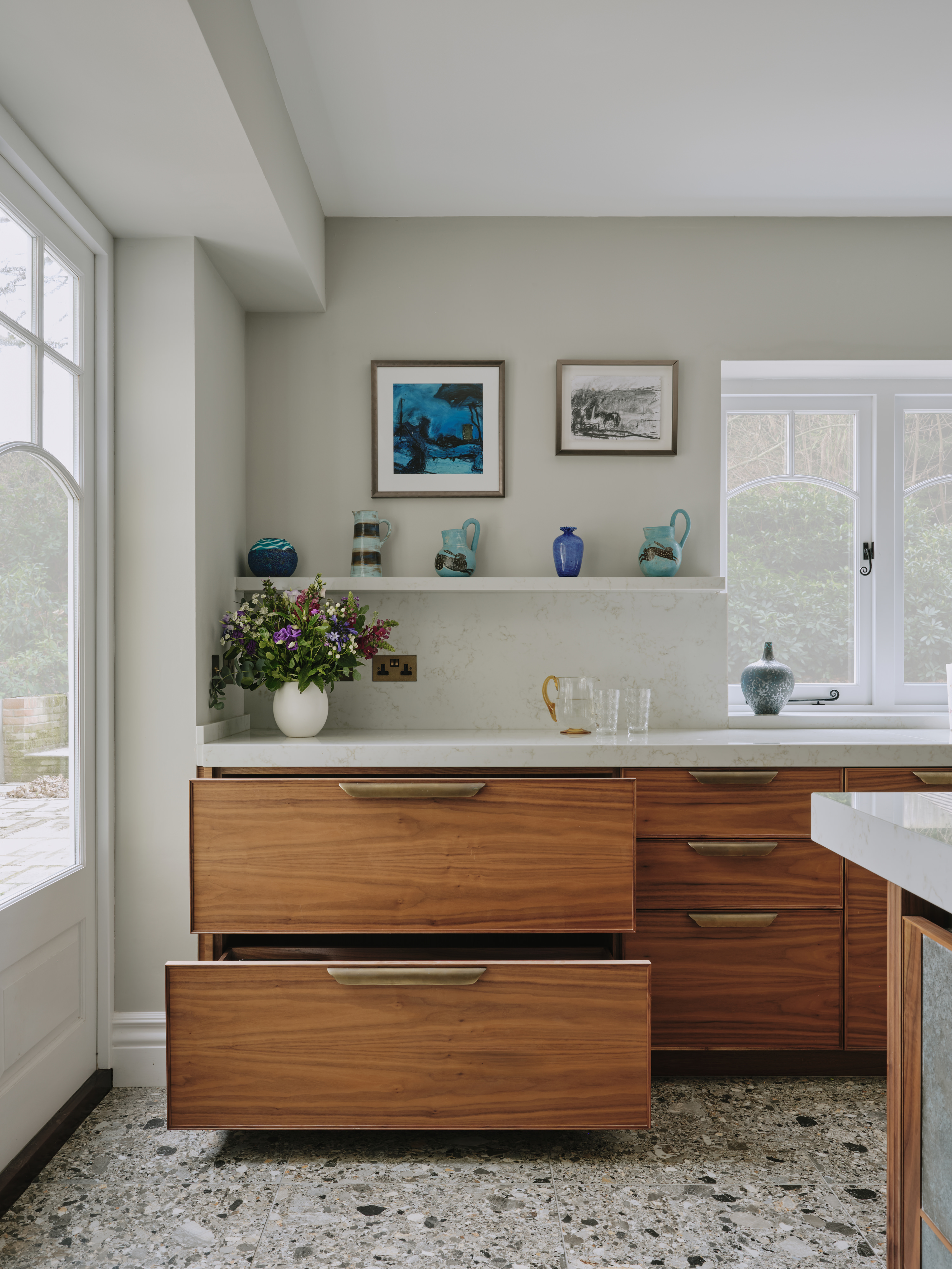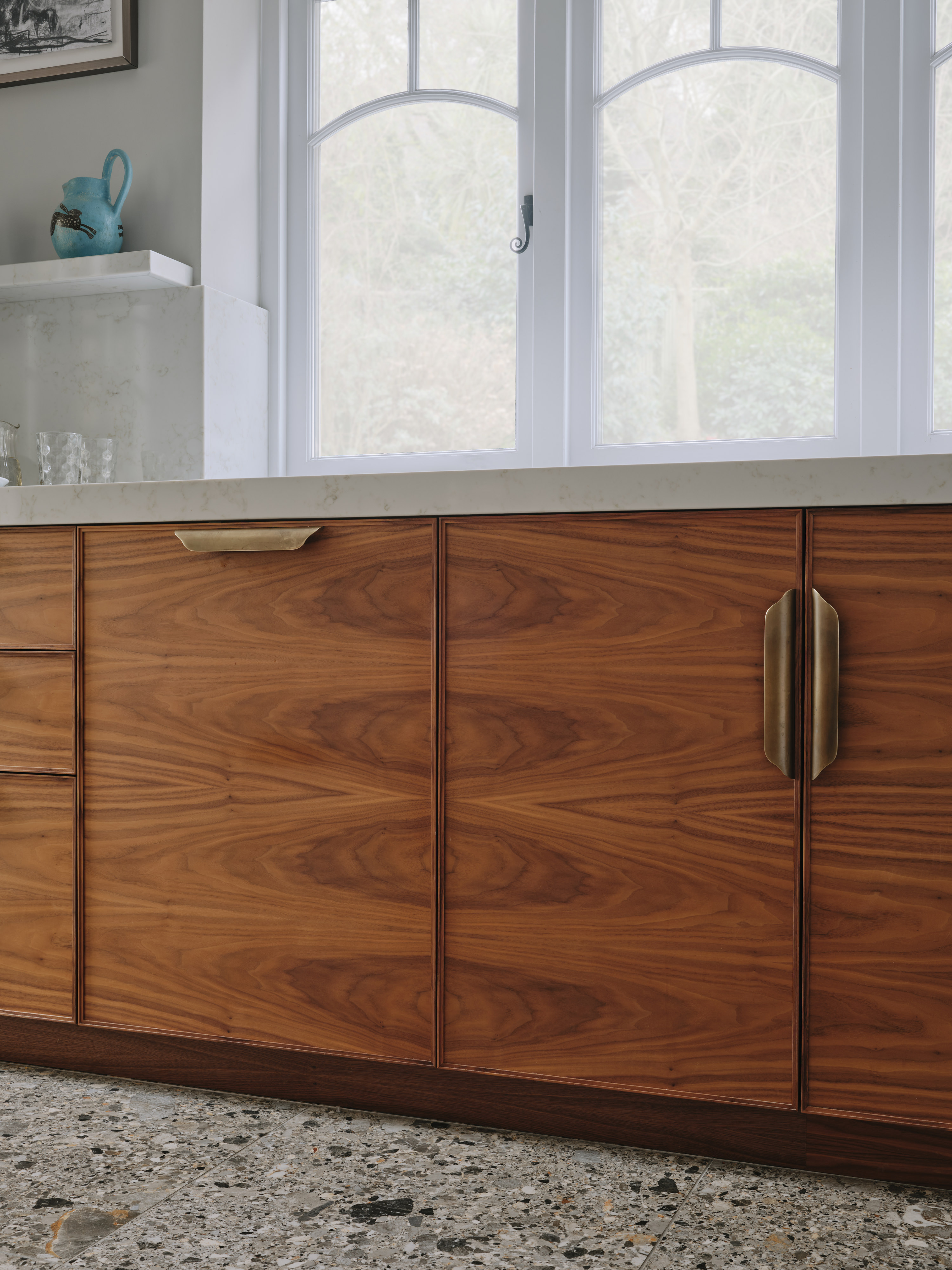 When our client moved from the Midlands to the New Forest, the first thing she wanted was a new kitchen, as this is the room in which she spends most of her time. The room was large enough to incorporate a large island with breakfast bar, a dining space with banquette seating and plenty of tall cupboards for storage space. She chose Ledbury Studio as she wanted something different from the eponymus Shaker look , and felt that a more contemporary aesthetic suited the style and architecture of this Edwardian villa. Charlie chose a beautiful bookmatched walnut veneer which he coordinated with hand patinated zinc panels , edged in the same walnut, and aged brass handles, combining quality craftsmanship, with beautiful materials, for a sleek and contemporary look. Ambre quartz worktops and chic terrazzo flooring complete the design.