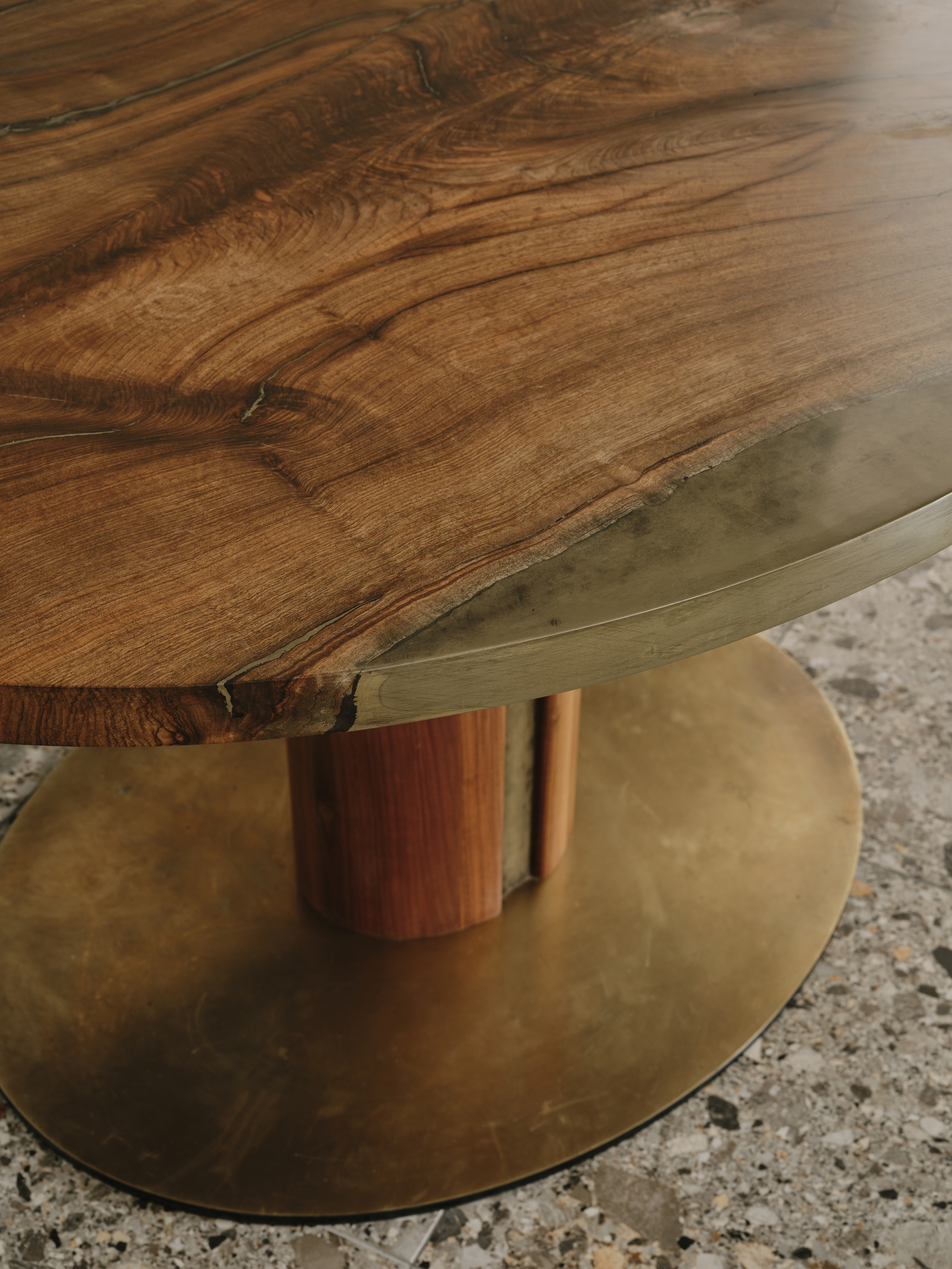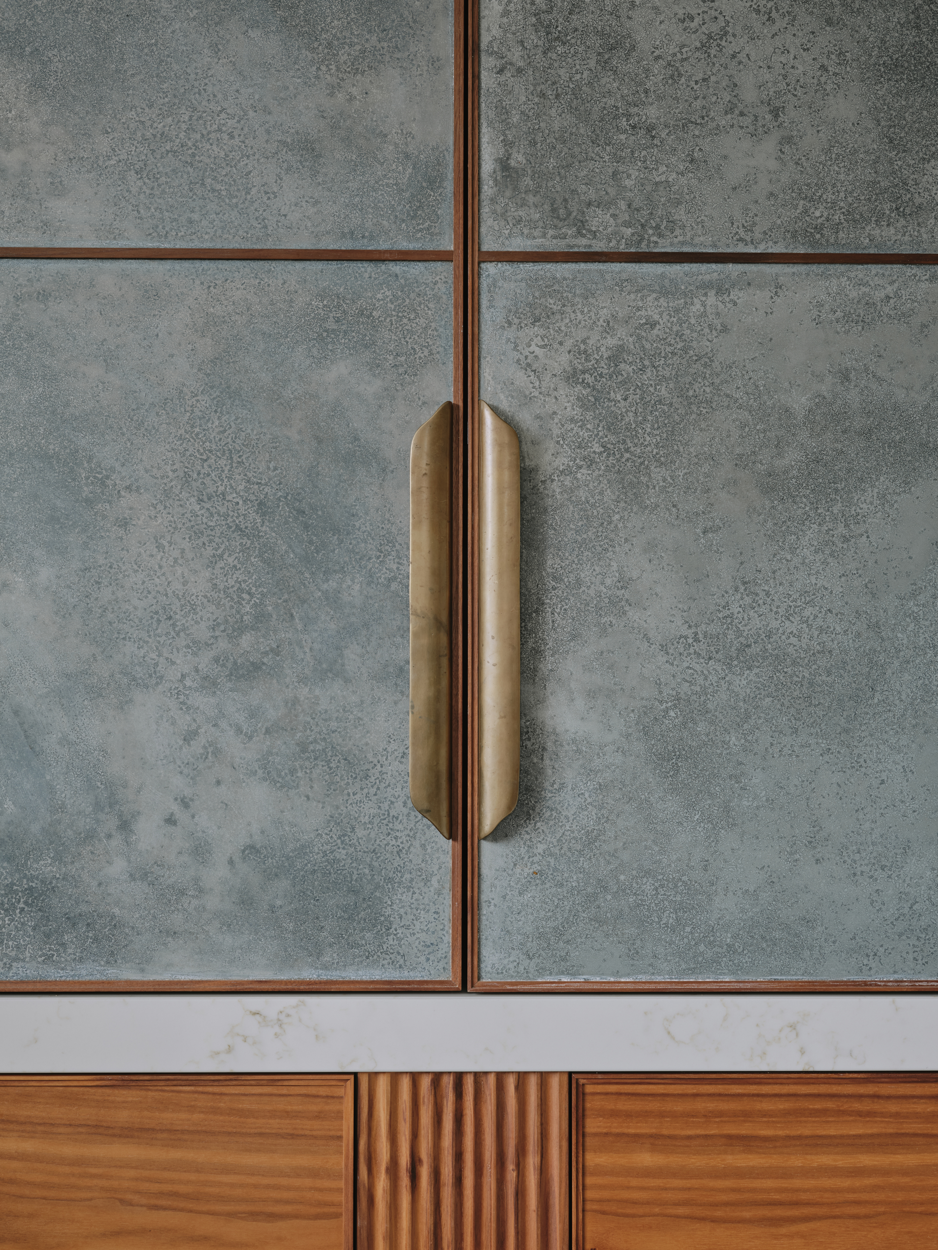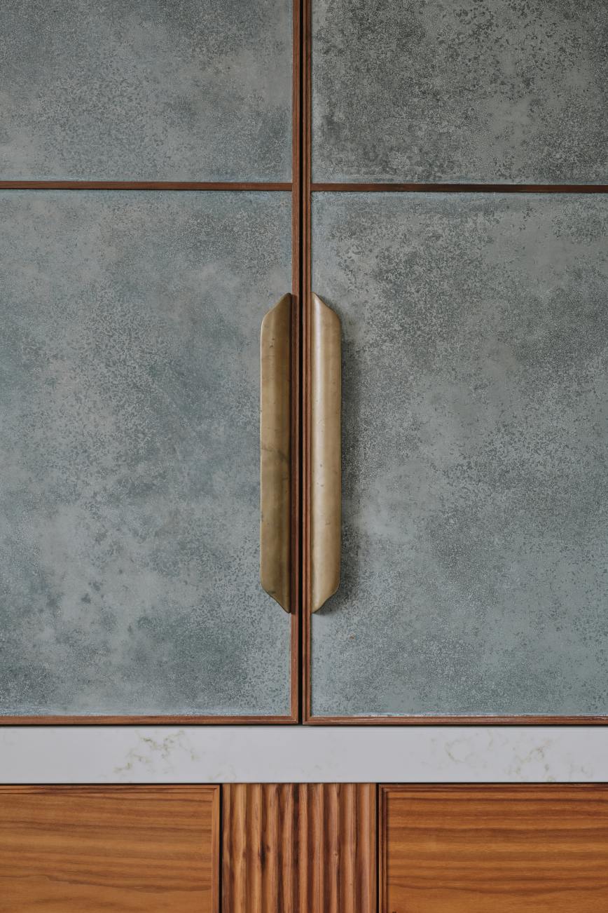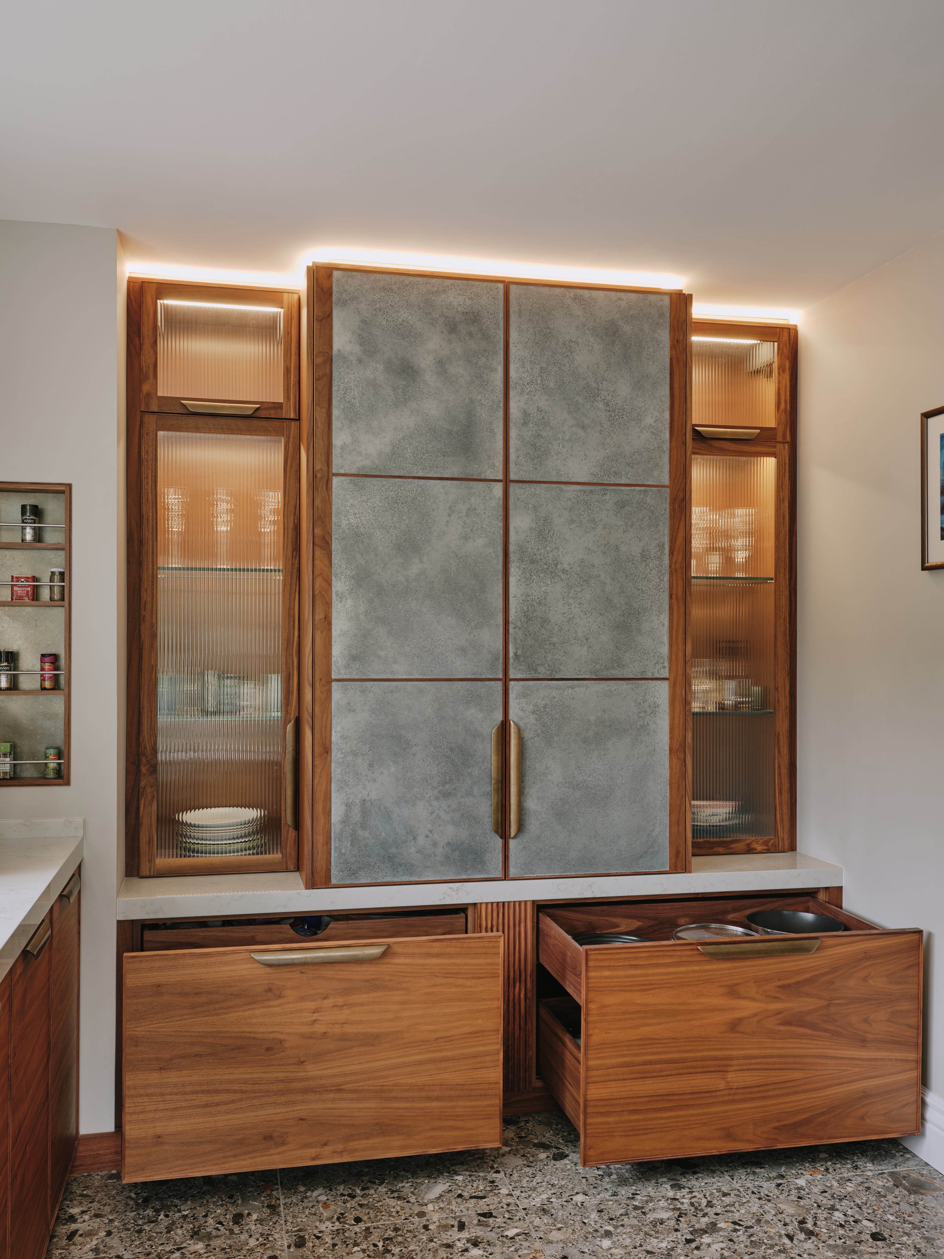 When our client moved from the Midlands to the New Forest, the first thing she wanted was a new kitchen, as this is the room in which she spends most of her time. The room was large enough to incorporate a large island with breakfast bar, a dining space with banquette seating and plenty of tall cupboards for storage space. She chose Ledbury Studio as she wanted something different from the eponymus Shaker look , and felt that a more contemporary aesthetic suited the style and architecture of this Edwardian villa. Charlie chose a beautiful bookmatched walnut veneer which he coordinated with hand patinated zinc panels , edged in the same walnut, and aged brass handles, combining quality craftsmanship, with beautiful materials, for a sleek and contemporary look. Ambre quartz worktops and chic terrazzo flooring complete the design.