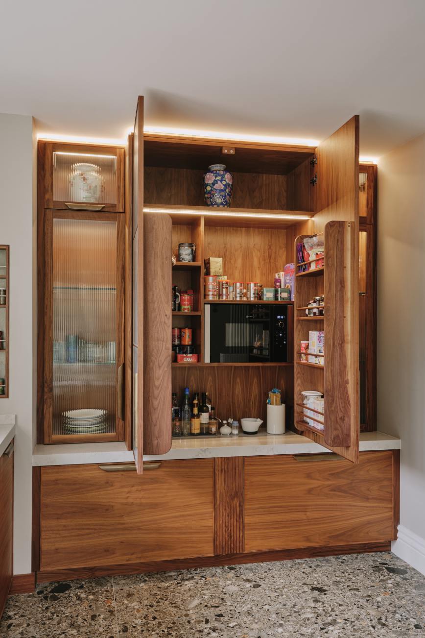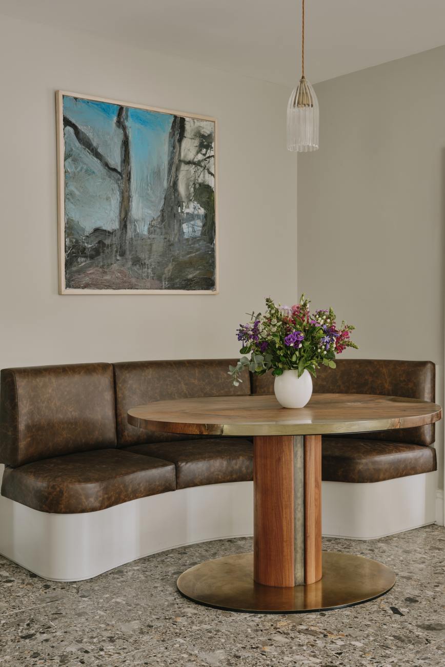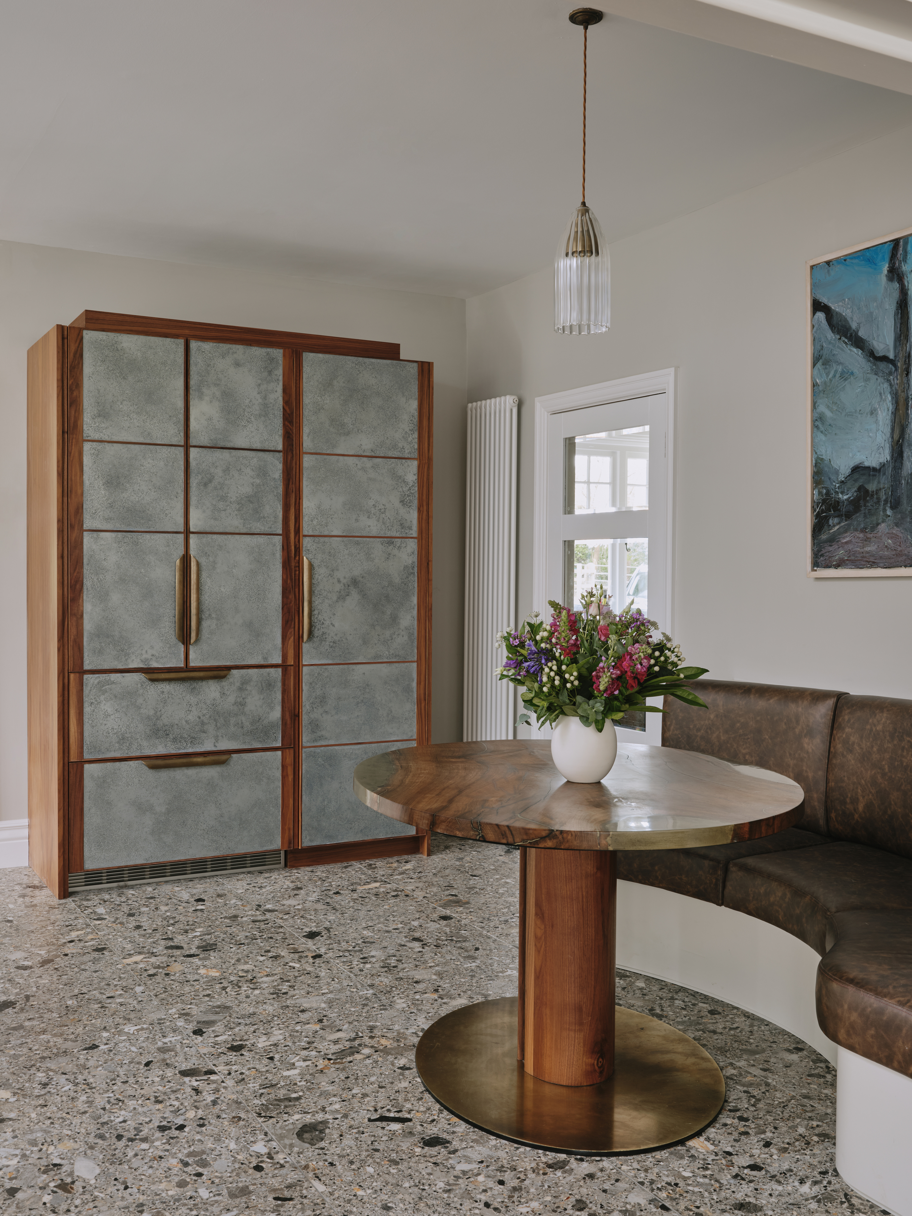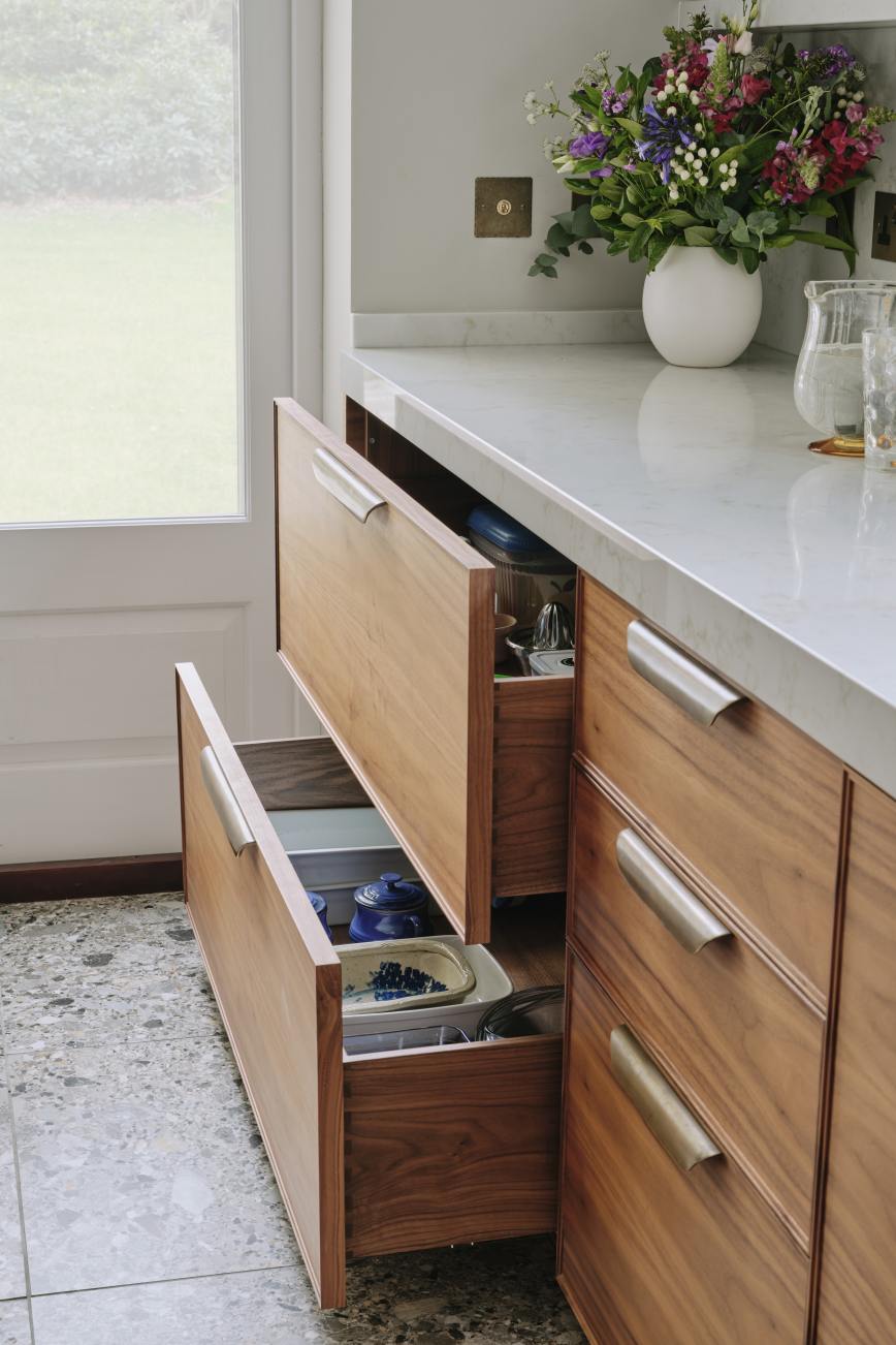 Every nook in this kitchen has been maximised for clutterless storage… large pull out drawers throughout, a housekeeper’s cupboard housing the microwave and breakfast items, and a tall larder next to the fridge with pull out freezer drawers. The beautiful walnut table ,designed by Charlie, made from a single piece of walnut and embellished with aged brass , is a completely bespoke piece of furniture, and is one of our client’s most treasured pieces of furniture. To compliment the table the banquette seat was made from walnut and upholstered in a tough leather, so that her gorgeous Dalmatian can lounge on it without fear of damage. Truly a kitchen for our client to enjoy with her best friend!