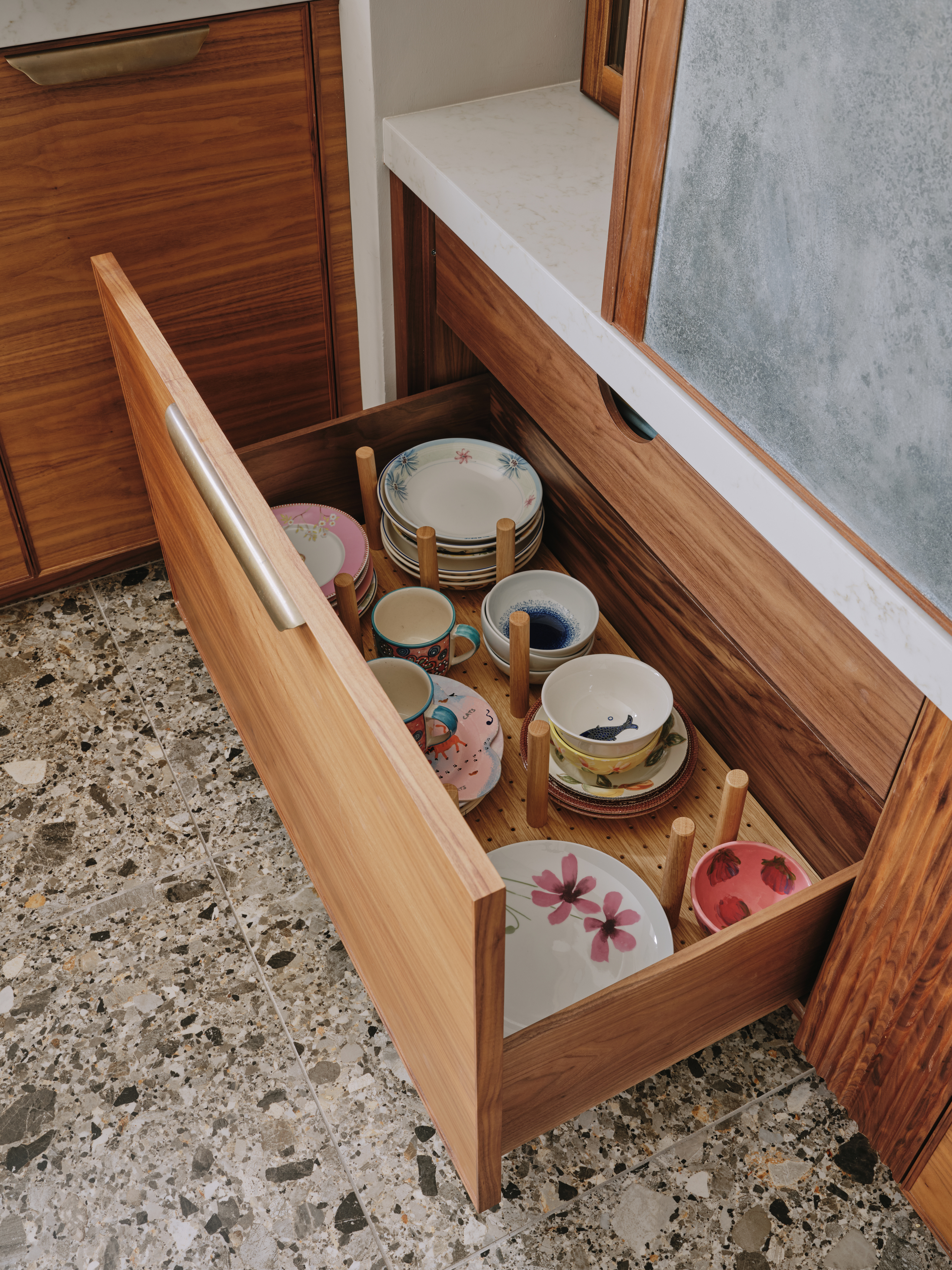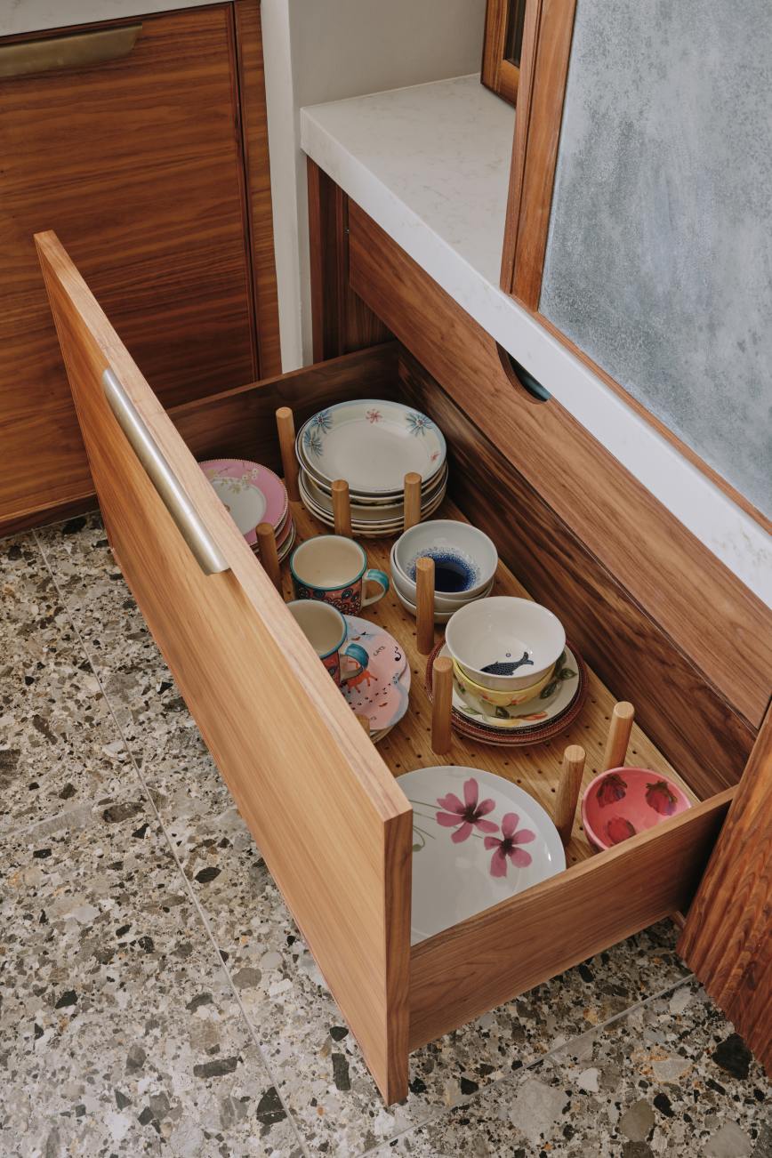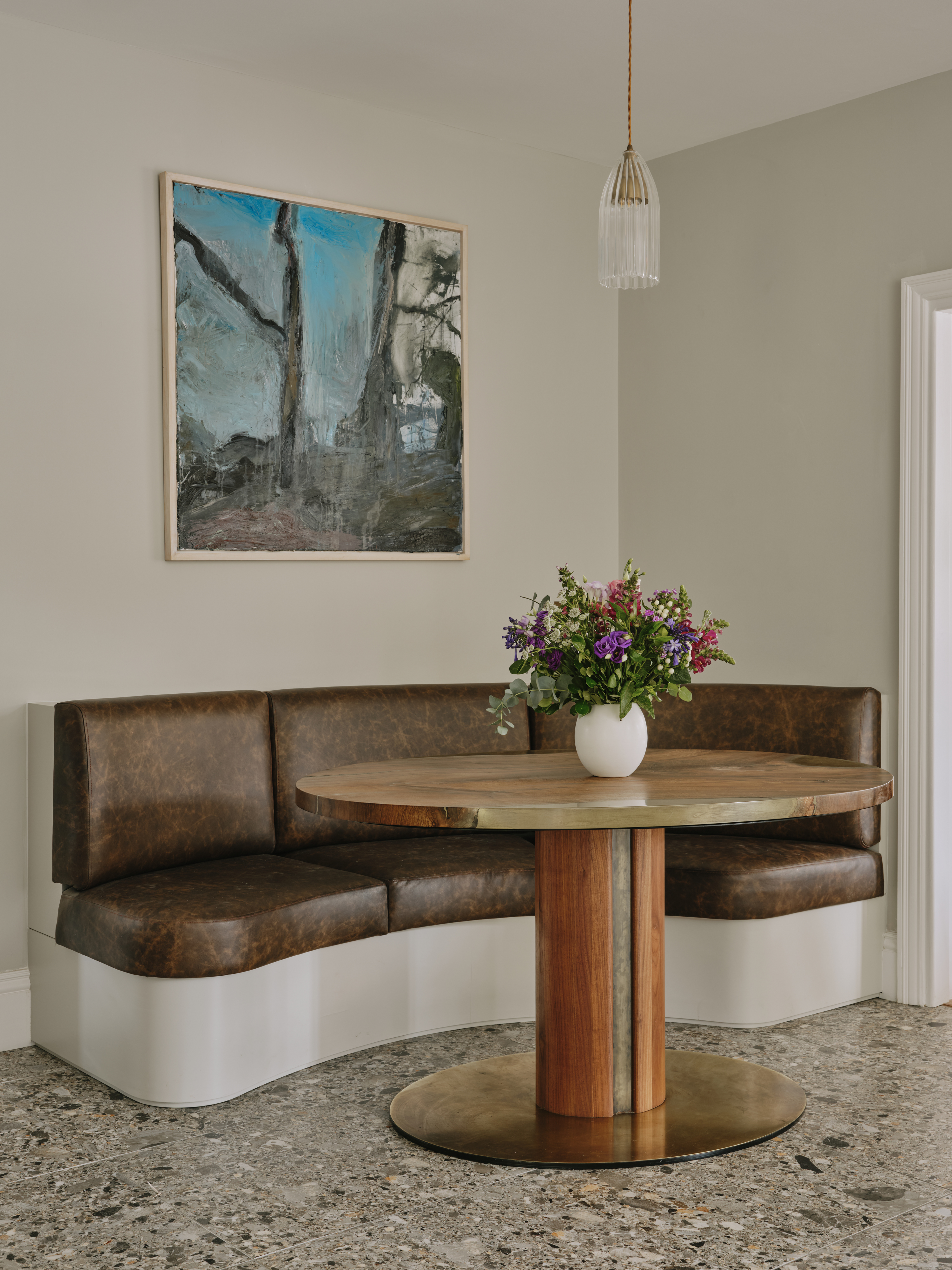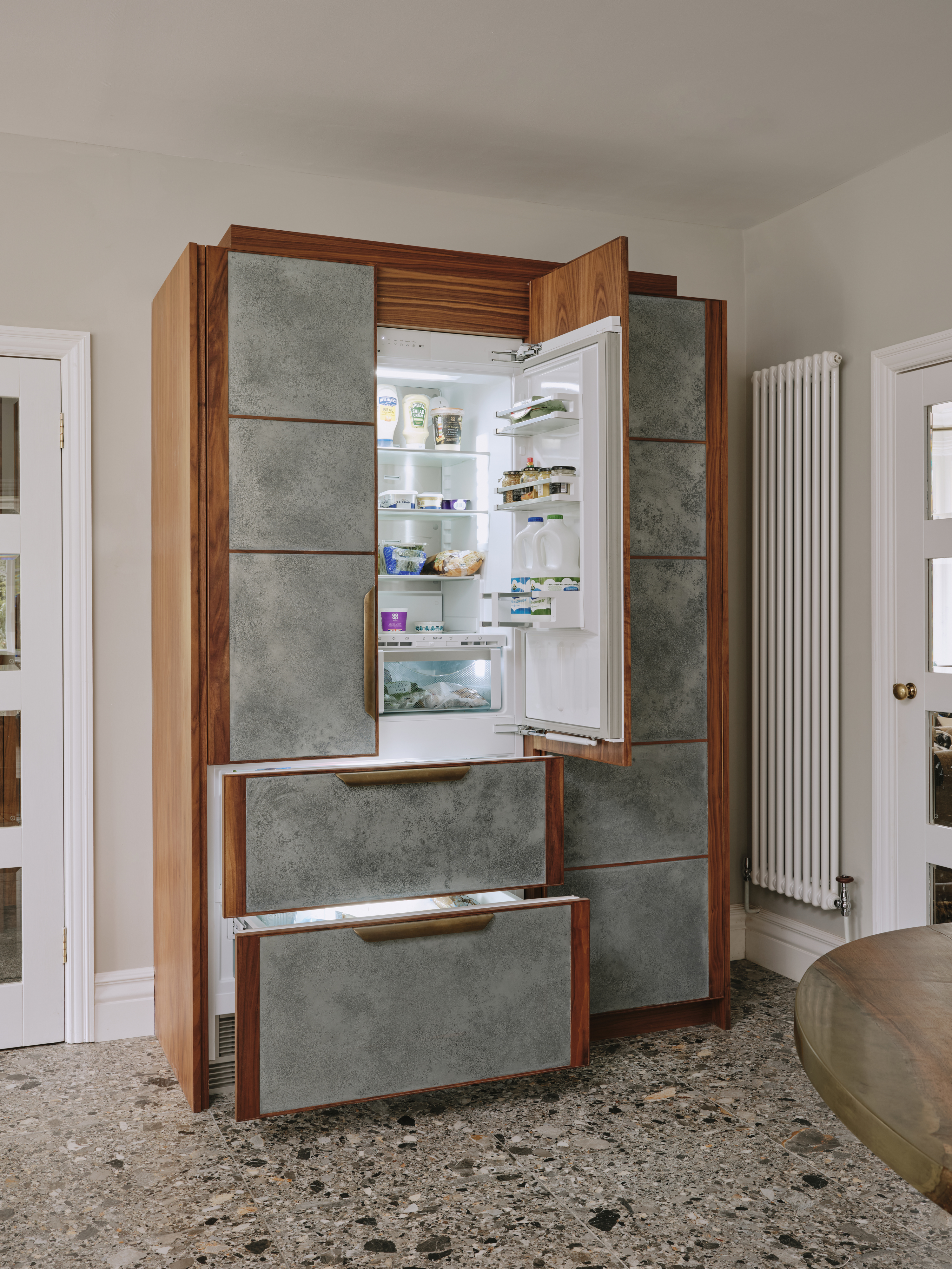 Every nook in this kitchen has been maximised for clutterless storage… large pull out drawers throughout, a housekeeper’s cupboard housing the microwave and breakfast items, and a tall larder next to the fridge with pull out freezer drawers. The beautiful walnut table ,designed by Charlie, made from a single piece of walnut and embellished with aged brass , is a completely bespoke piece of furniture, and is one of our client’s most treasured pieces of furniture. To compliment the table the banquette seat was made from walnut and upholstered in a tough leather, so that her gorgeous Dalmatian can lounge on it without fear of damage. Truly a kitchen for our client to enjoy with her best friend!