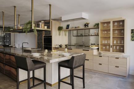 We are excited to unveil our new display in the Notting Hill showroom, bringing together many of our signature metallic and wood finishes in a new and exciting way. The island showcases our beautiful new wild walnut panels and white washed fluting which is illuminated from above by the led lighting concealed in the aged brass hanging rack and shelf. The oak cupboards surrounding the hob are rubbed back to expose the grain and finished with a pigmented pale wash , and patinated zinc panels on the tall housings sit within pale oak frames and side panels.