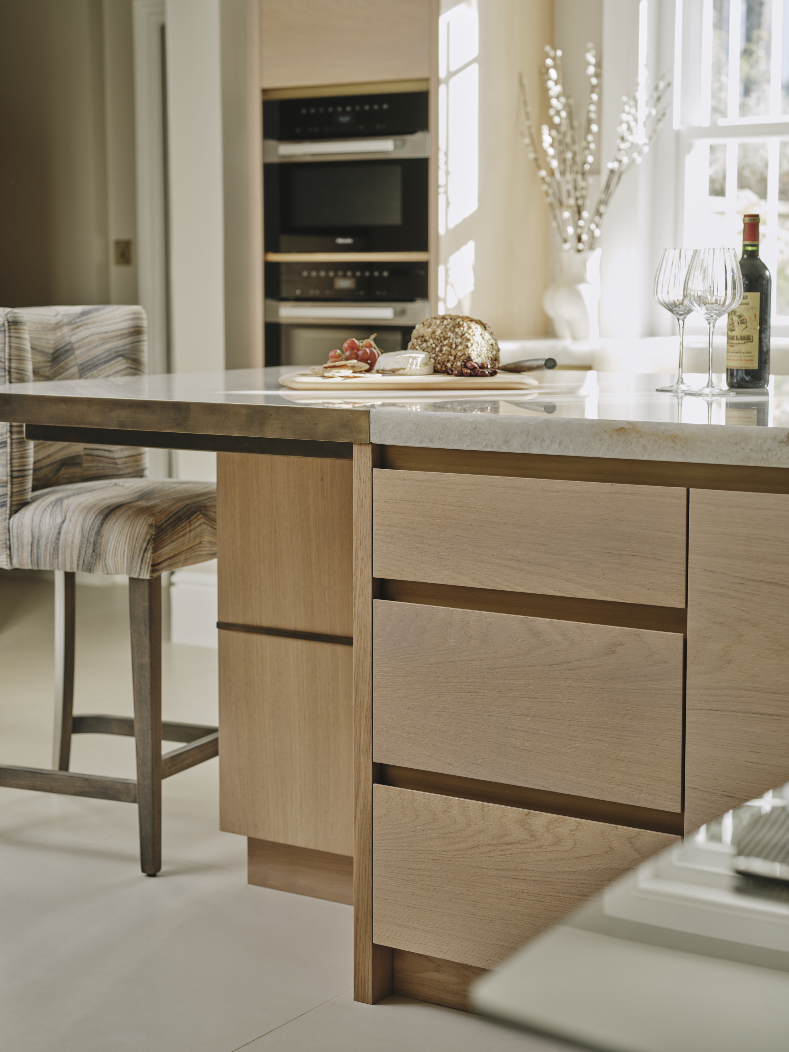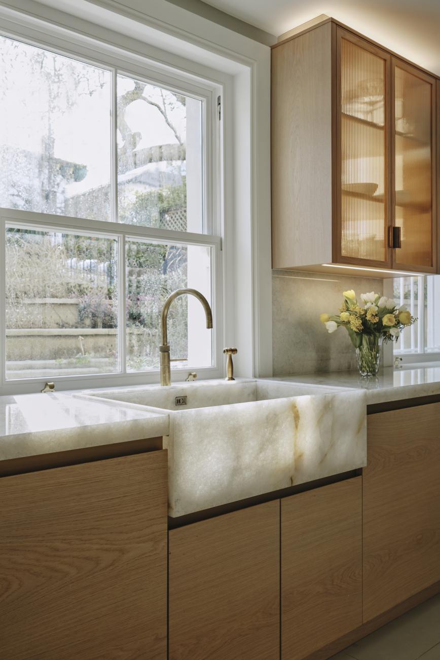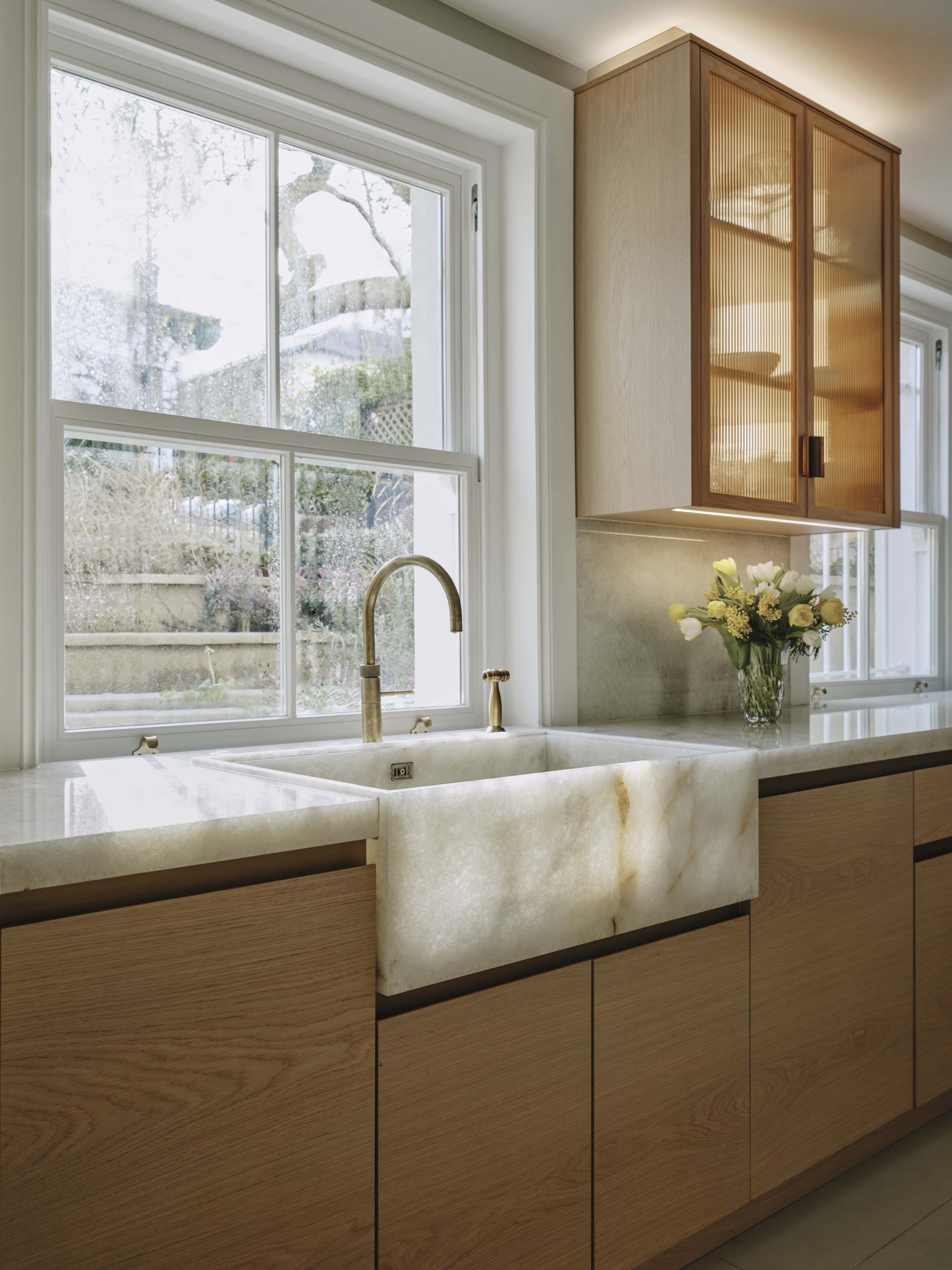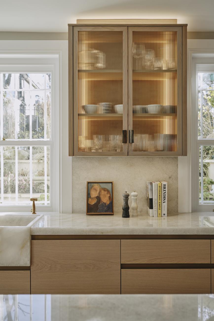 The oak cupboards throughout were rubbed back to expose the grain and finished with a pigmented pale wash, and for a sleek and contemporary look the base cupboards were kept handleless with patinated brass surrounds and kickplates. A notable feature is the sink made from diamond quartzite which catches the sunlight in the mornings. The same material is used on the worktops, and to create the wow factor the breakfast bar is underlit, and edged in patinated brass. LED lighting above and below the cupboards completes the look of this light and airy sophisticated kitchen which makes the best possible use of the space.