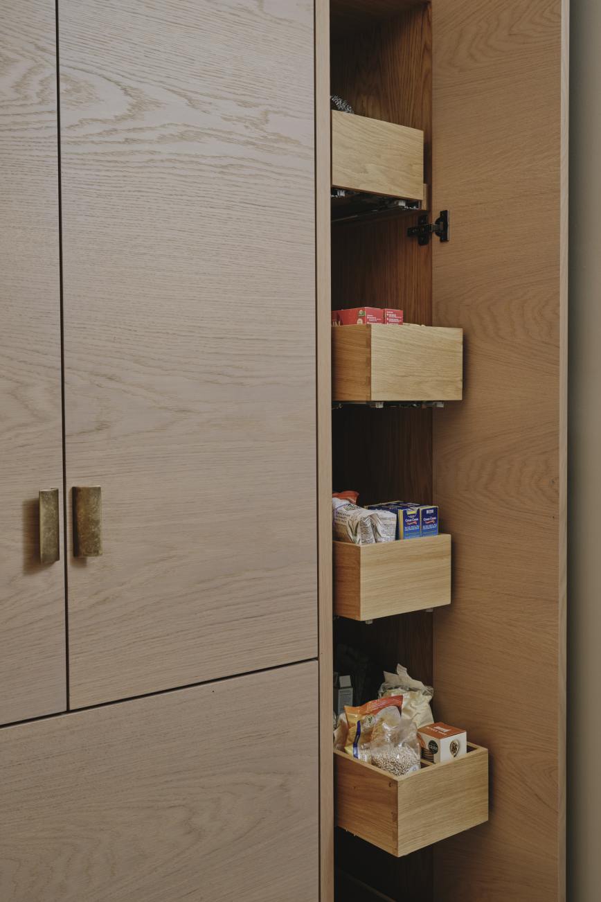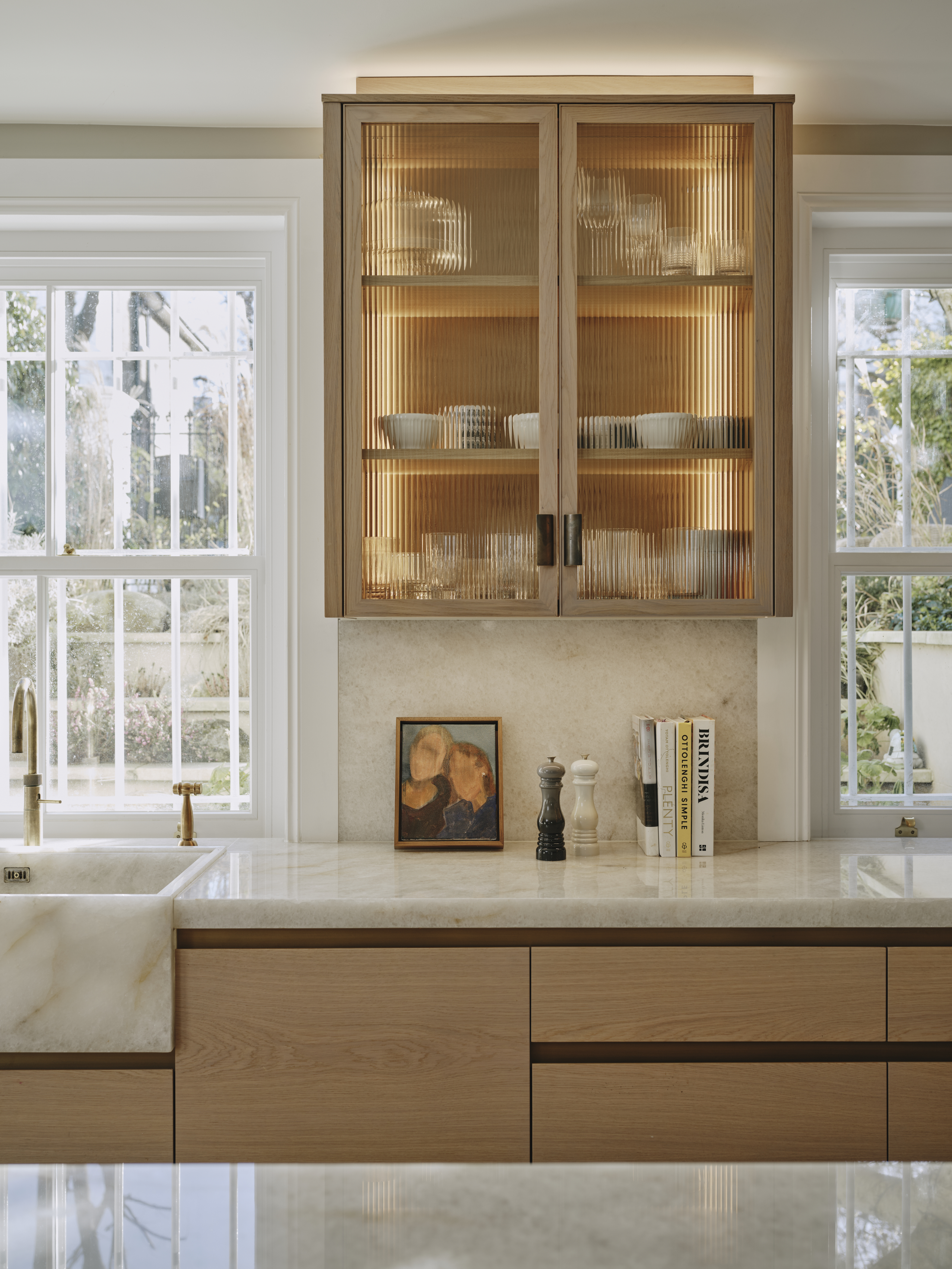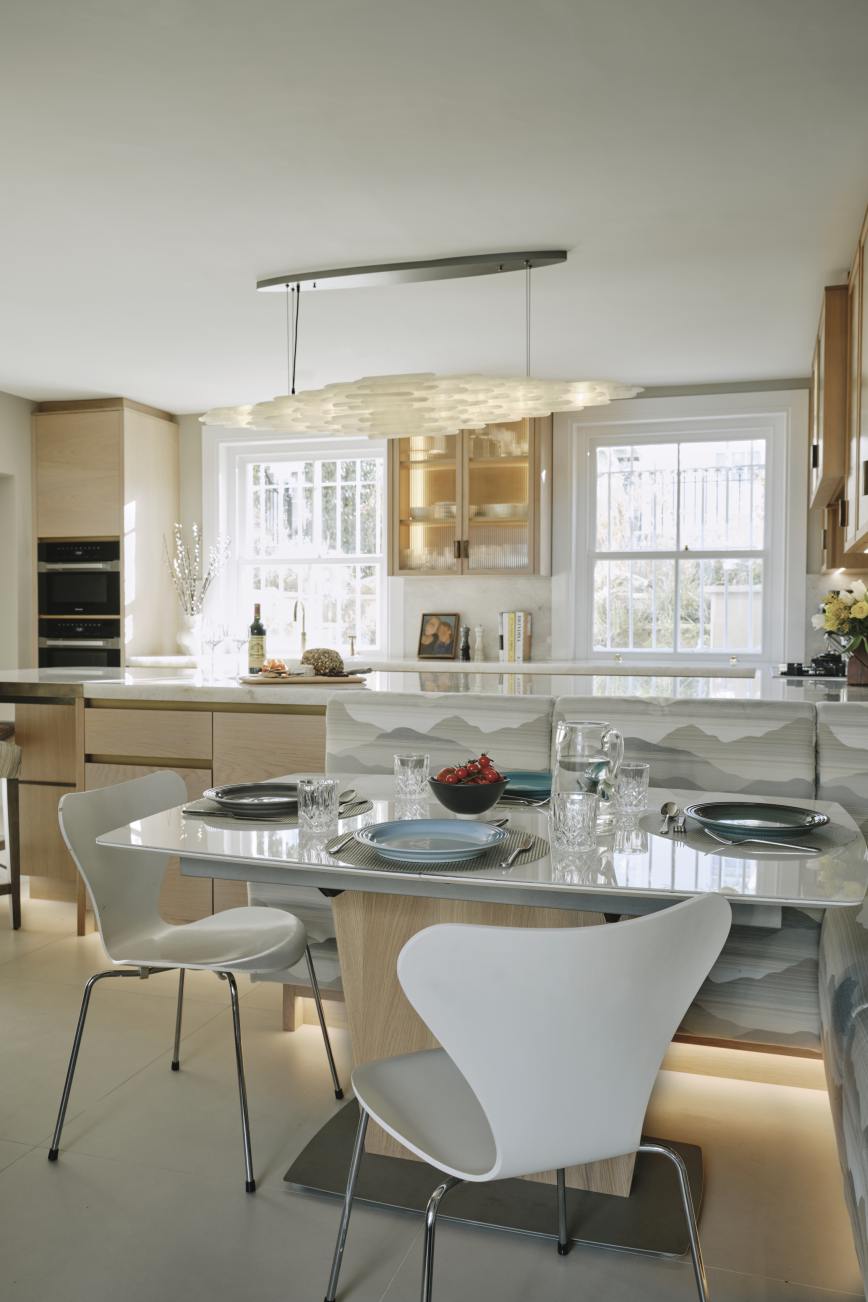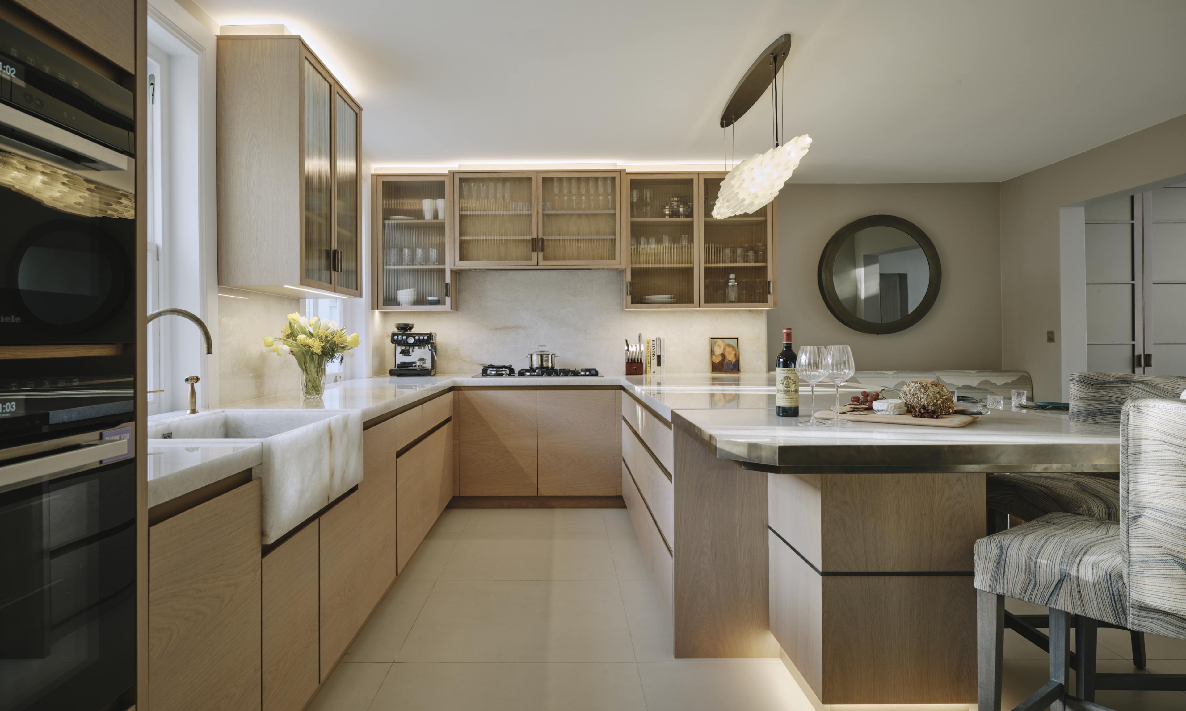 The oak cupboards throughout were rubbed back to expose the grain and finished with a pigmented pale wash, and for a sleek and contemporary look the base cupboards were kept handleless with patinated brass surrounds and kickplates. A notable feature is the sink made from diamond quartzite which catches the sunlight in the mornings. The same material is used on the worktops, and to create the wow factor the breakfast bar is underlit, and edged in patinated brass. LED lighting above and below the cupboards completes the look of this light and airy sophisticated kitchen which makes the best possible use of the space.