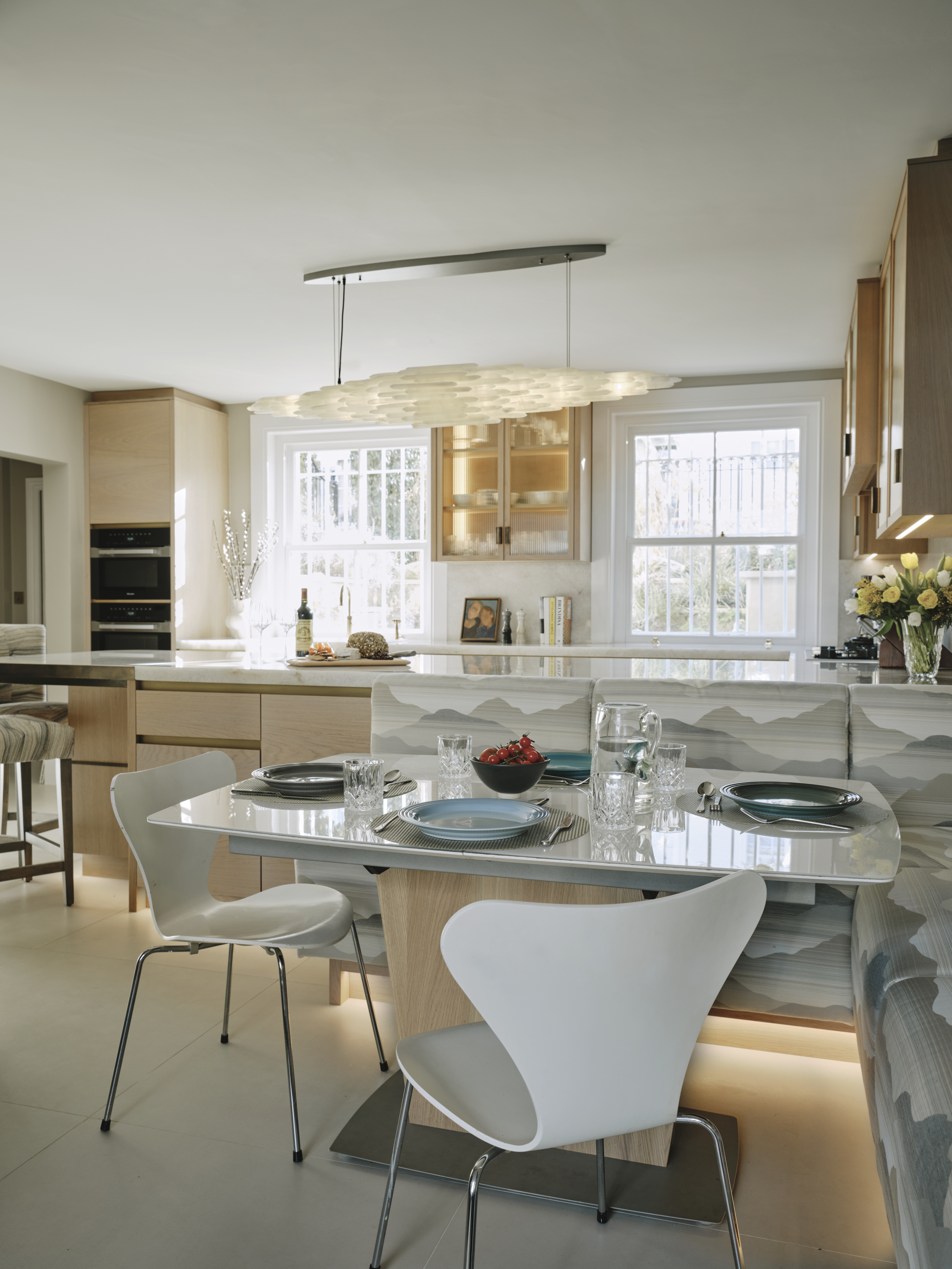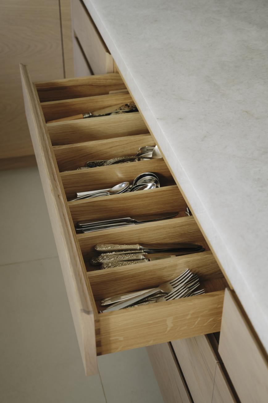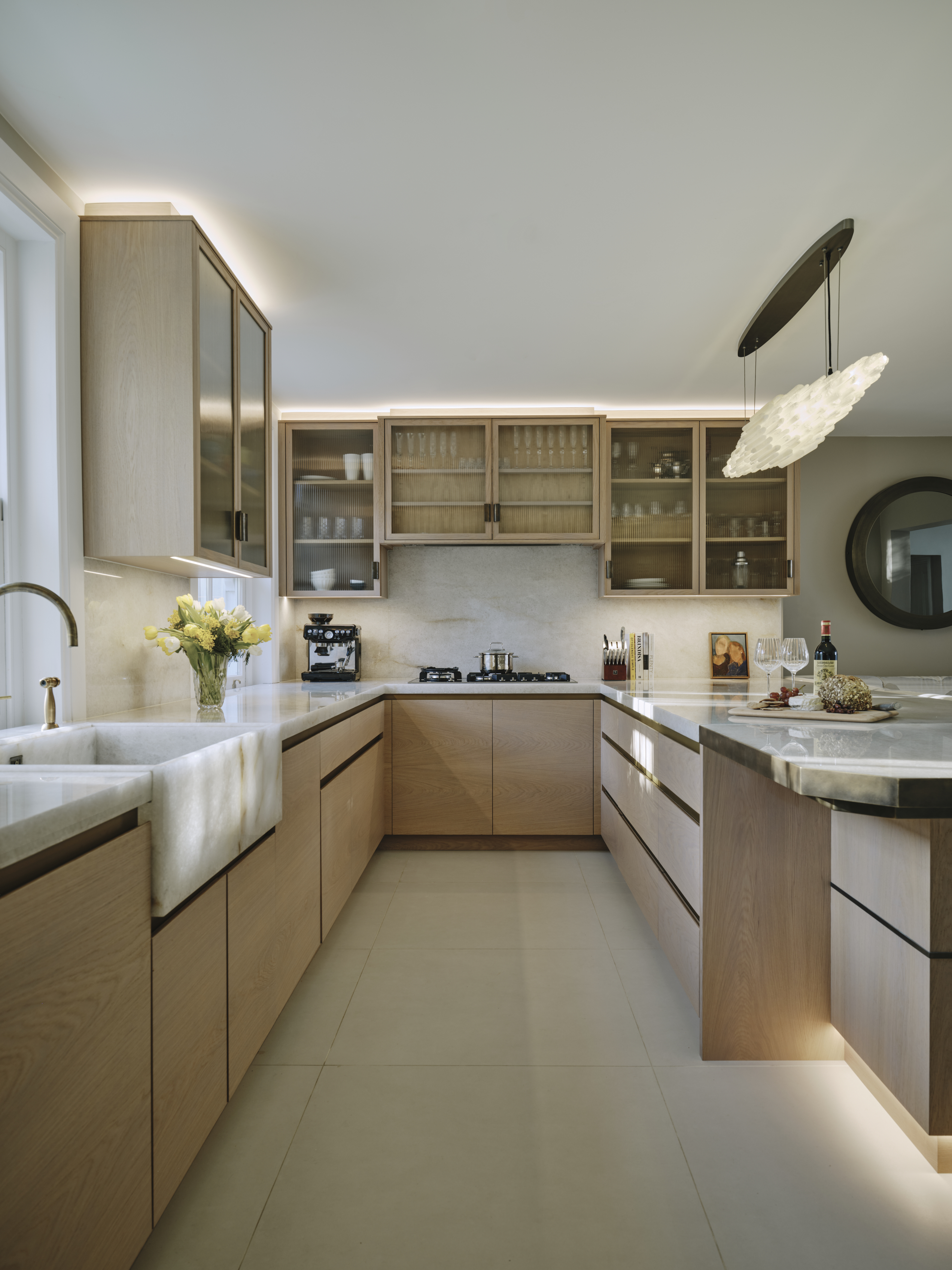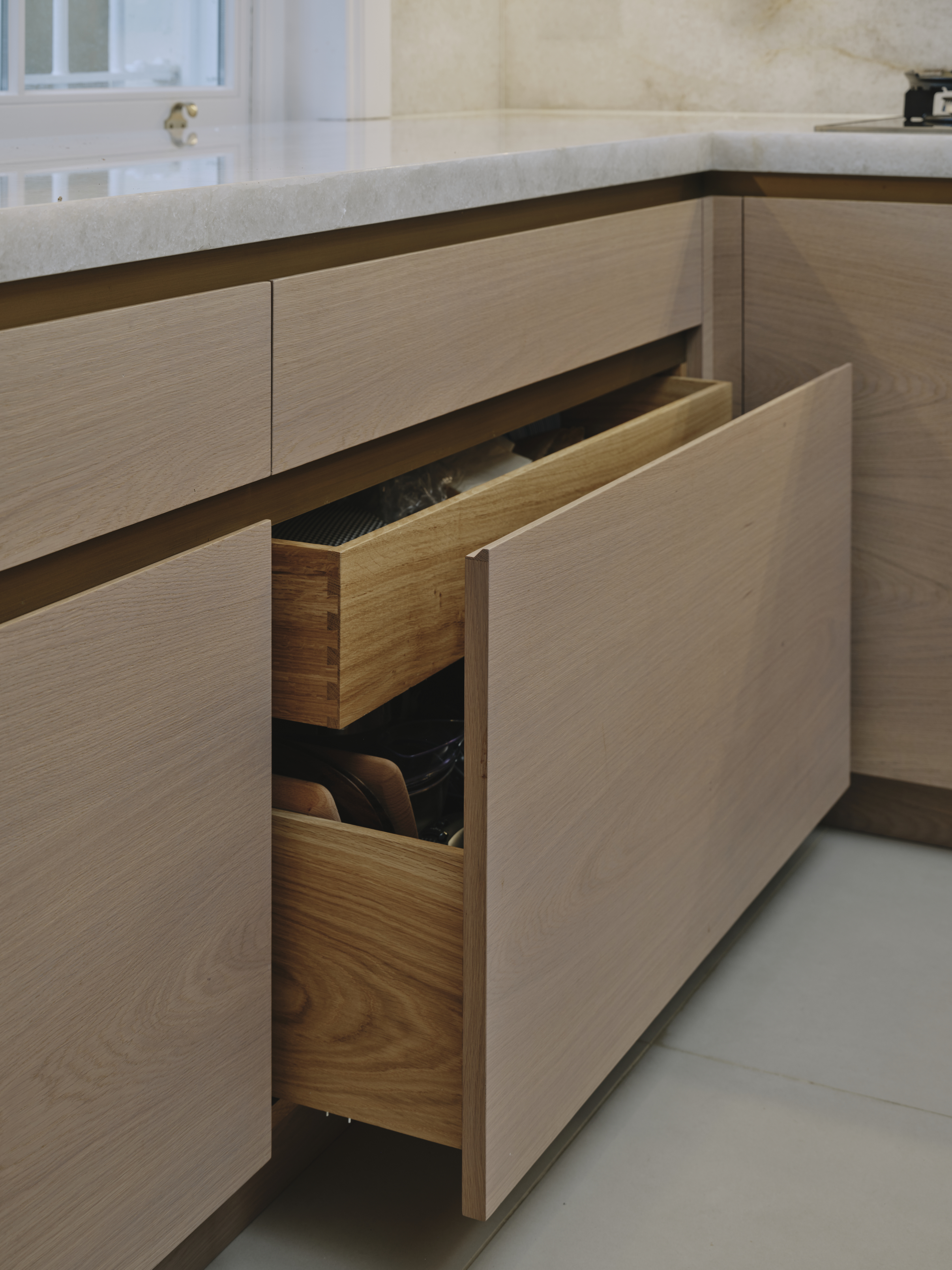The oak cupboards throughout were rubbed back to expose the grain and finished with a pigmented pale wash, and for a sleek and contemporary look the base cupboards were kept handleless with patinated brass surrounds and kickplates. A notable feature is the sink made from diamond quartzite which catches the sunlight in the mornings. The same material is used on the worktops, and to create the wow factor the breakfast bar is underlit, and edged in patinated brass. LED lighting above and below the cupboards completes the look of this light and airy sophisticated kitchen which makes the best possible use of the space.