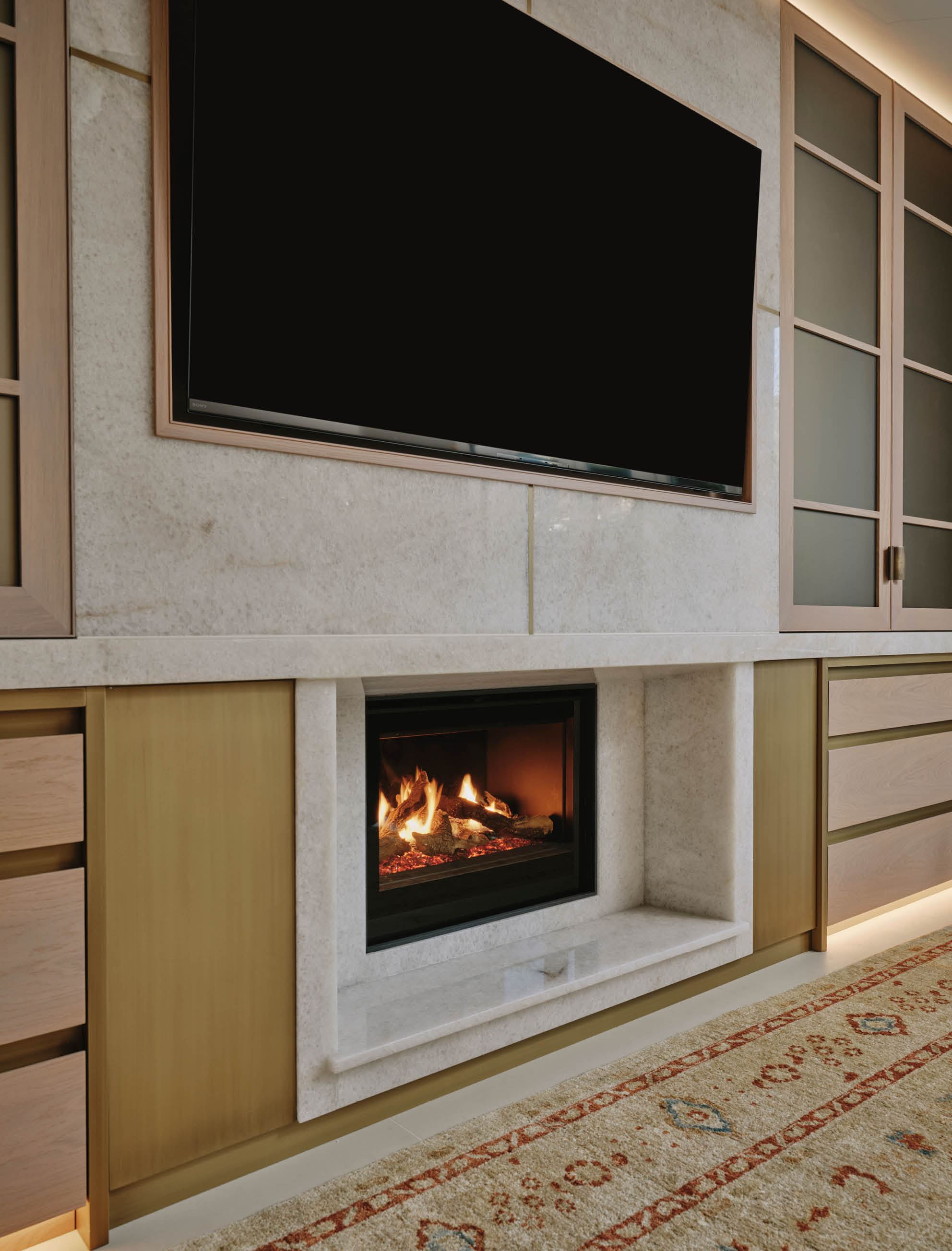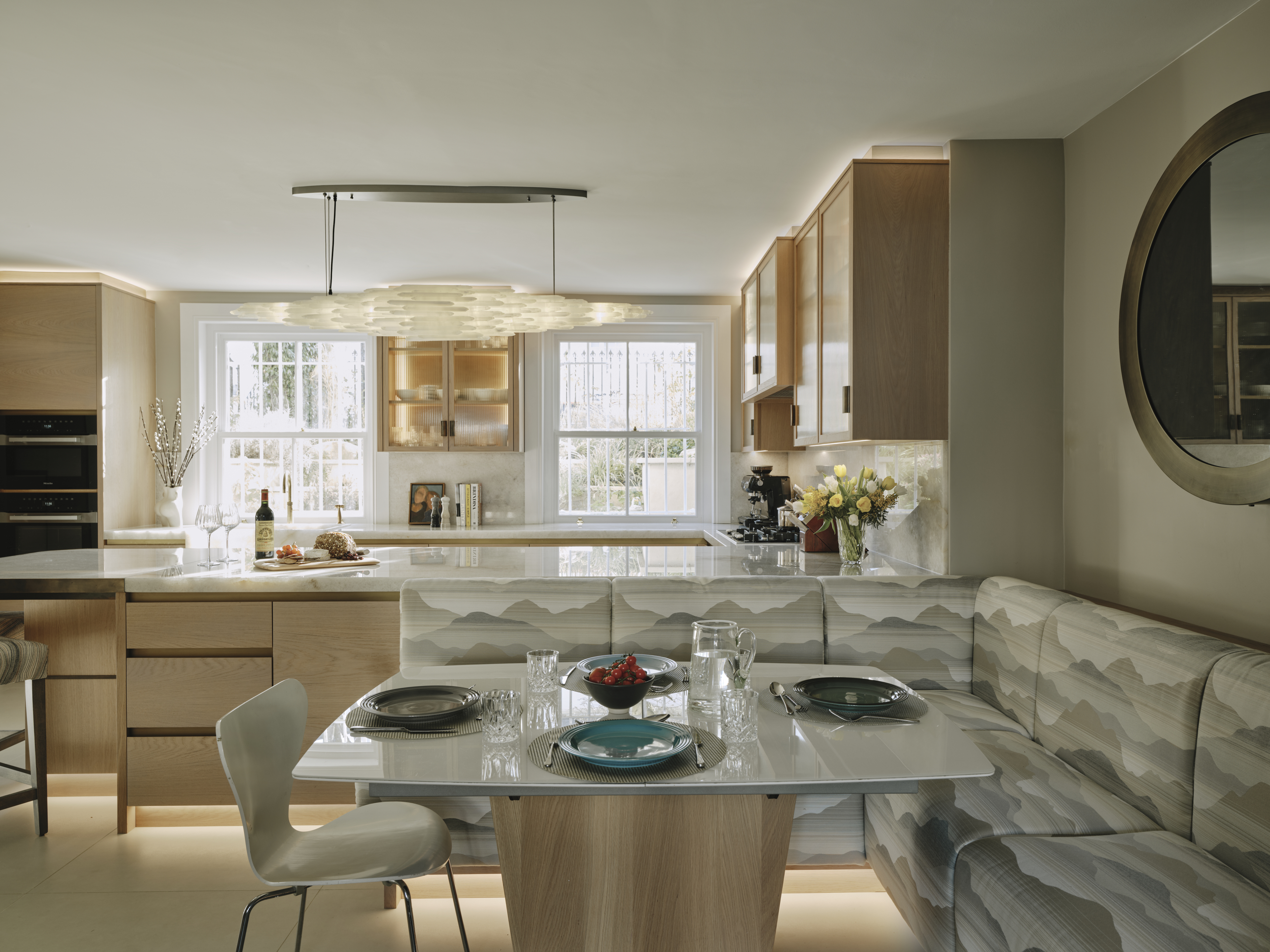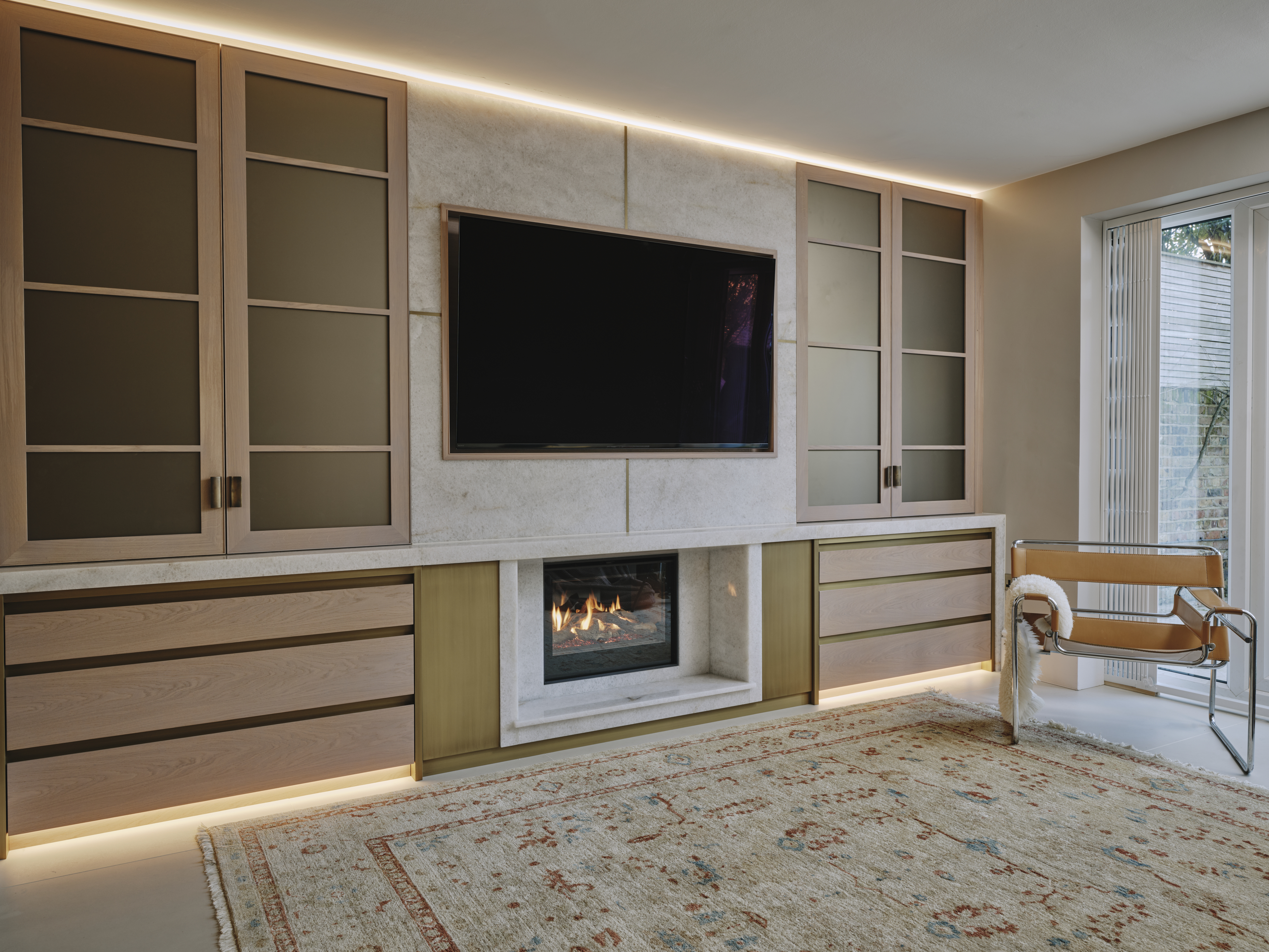 Following a disastrous flood in the basement of their St John’s Wood home, our clients asked us to redesign the space as a family area for cooking, eating and living. Charlie designed the kitchen area to take advantage of the morning sun, and separated the kitchen from the dining and living areas with a peninsular breakfast bar, the back of which forms upholstered bench seating for the dining table to make full use of the space. The design of the furniture is carried through to the media room to include fitted alcove cupboards glazed with opaque bronze glass, a built in TV, and fireplace surround crafted from diamond quartzite and patinated brass.