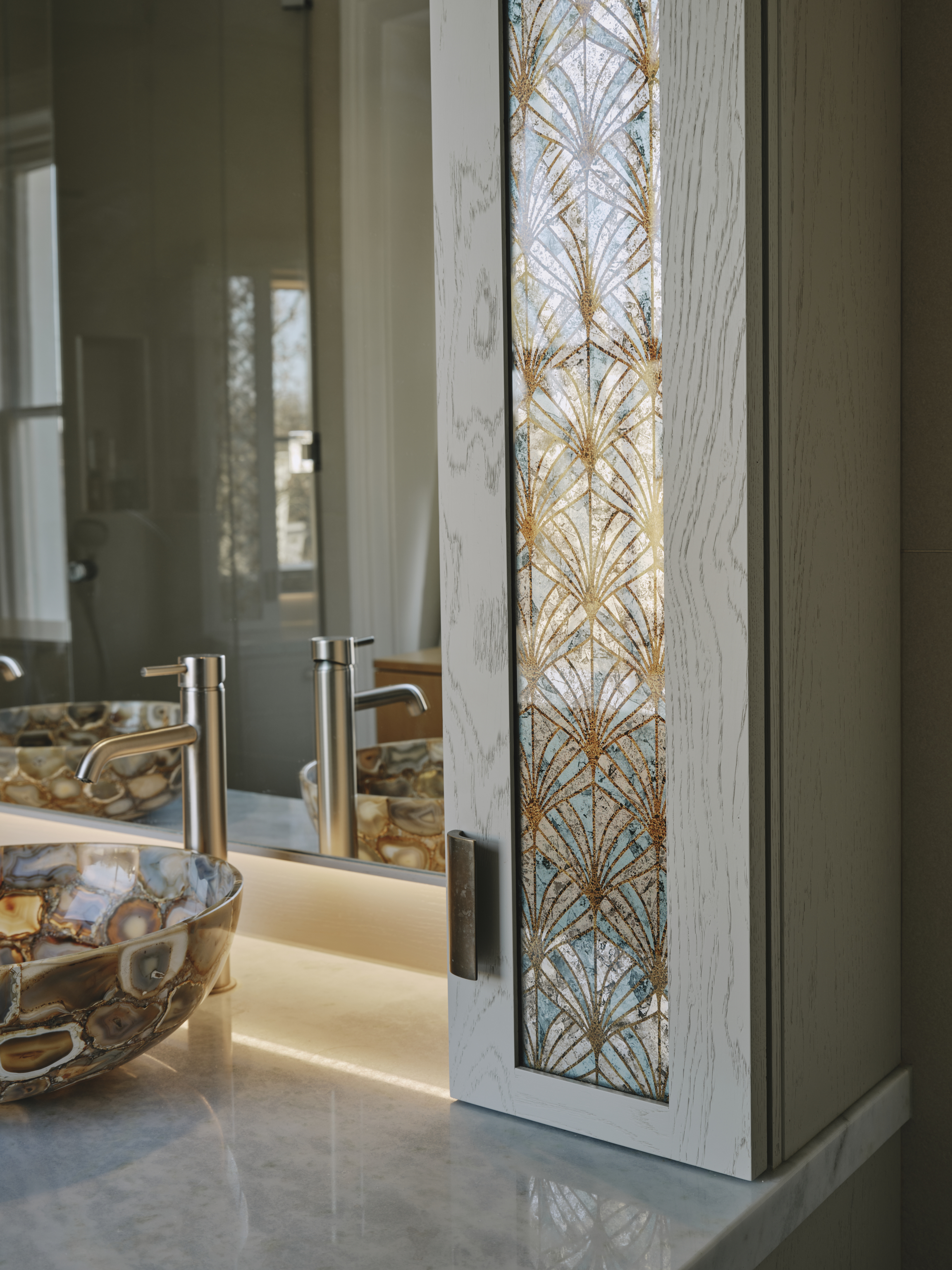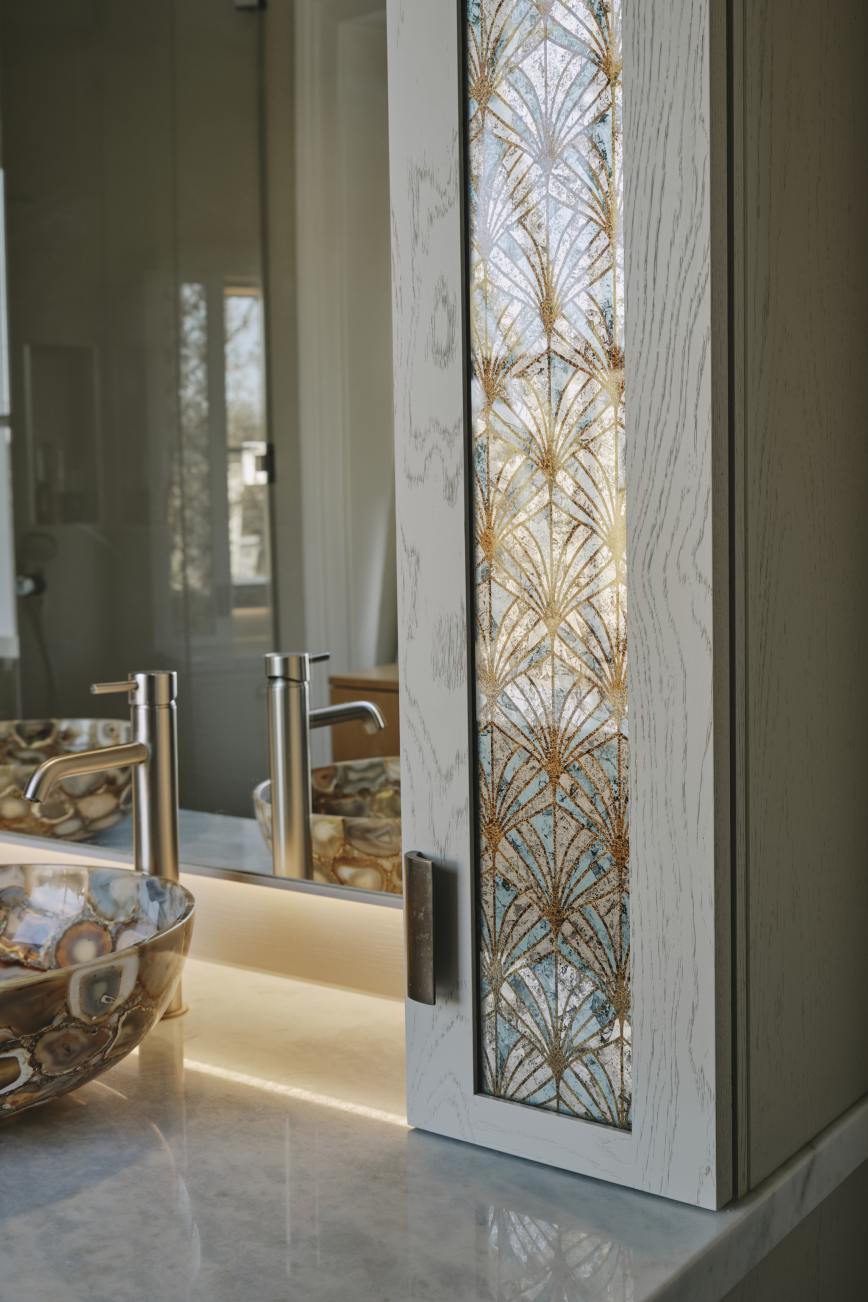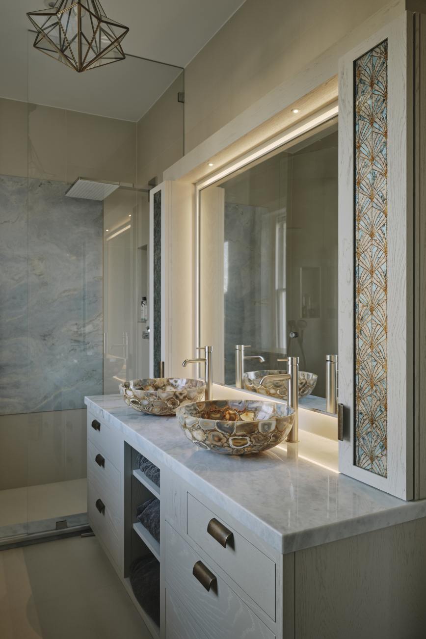 In the master ensuite bathroom the theme is continued with a pale washed oak vanity cupboard with patinated bronze handles. The wall cupboards for storage are framed in hand painted mirrored glass either side of the basins picking out the colours of the wash basins.