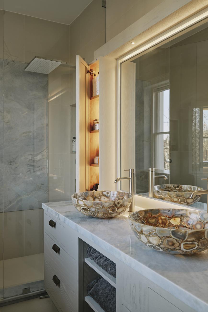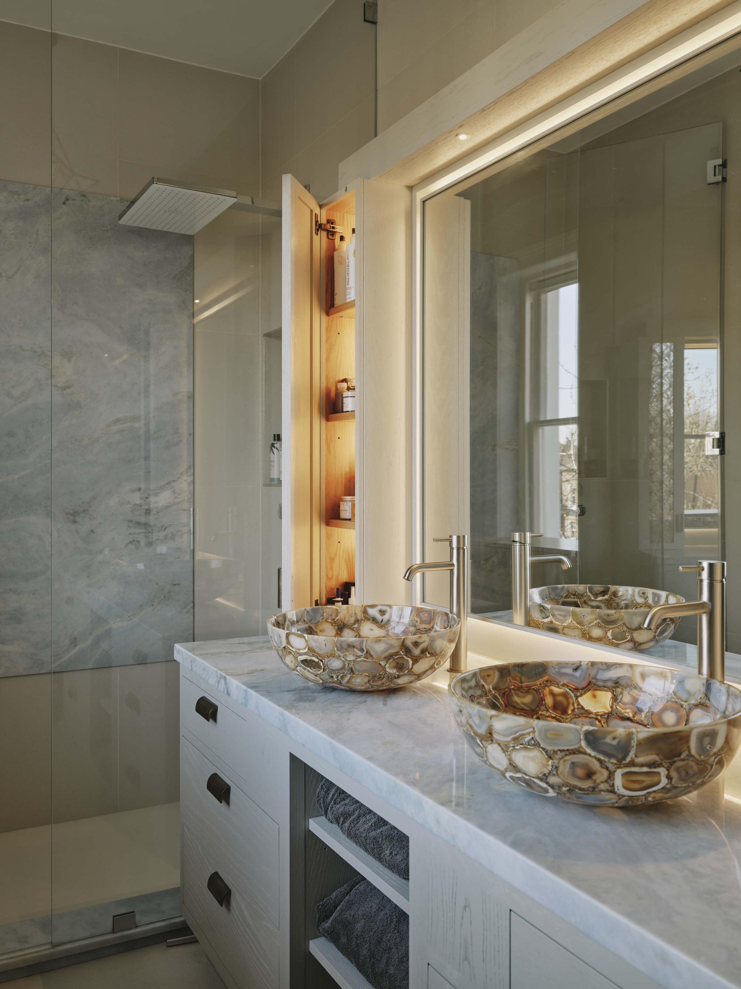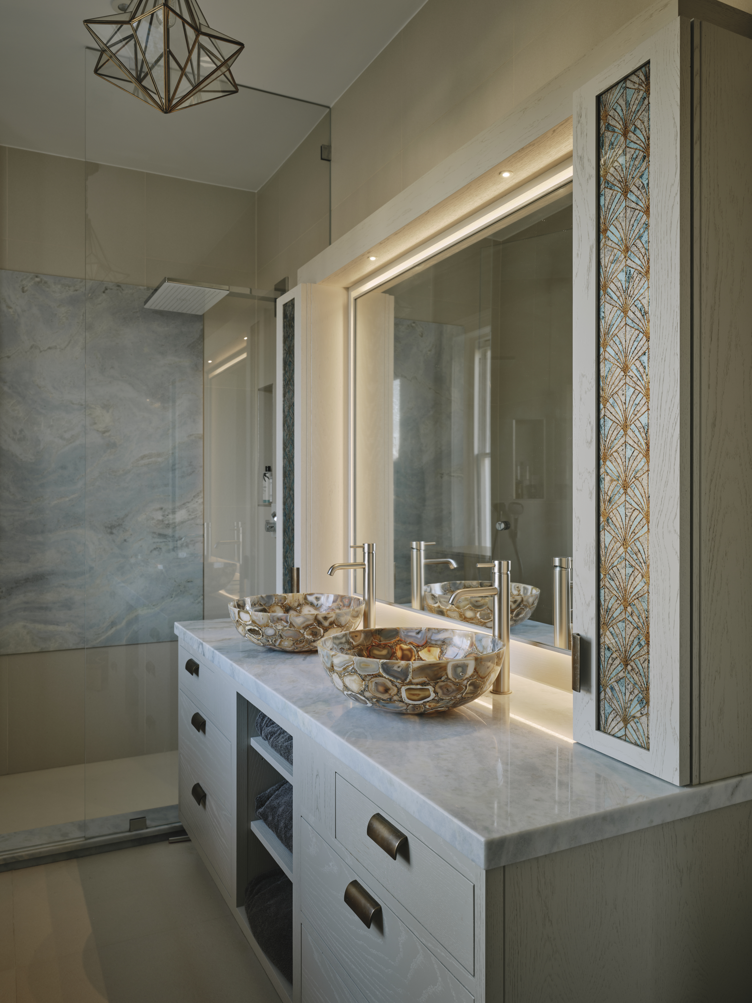 In the master ensuite bathroom the theme is continued with a pale washed oak vanity cupboard with patinated bronze handles. The wall cupboards for storage are framed in hand painted mirrored glass either side of the basins picking out the colours of the wash basins.