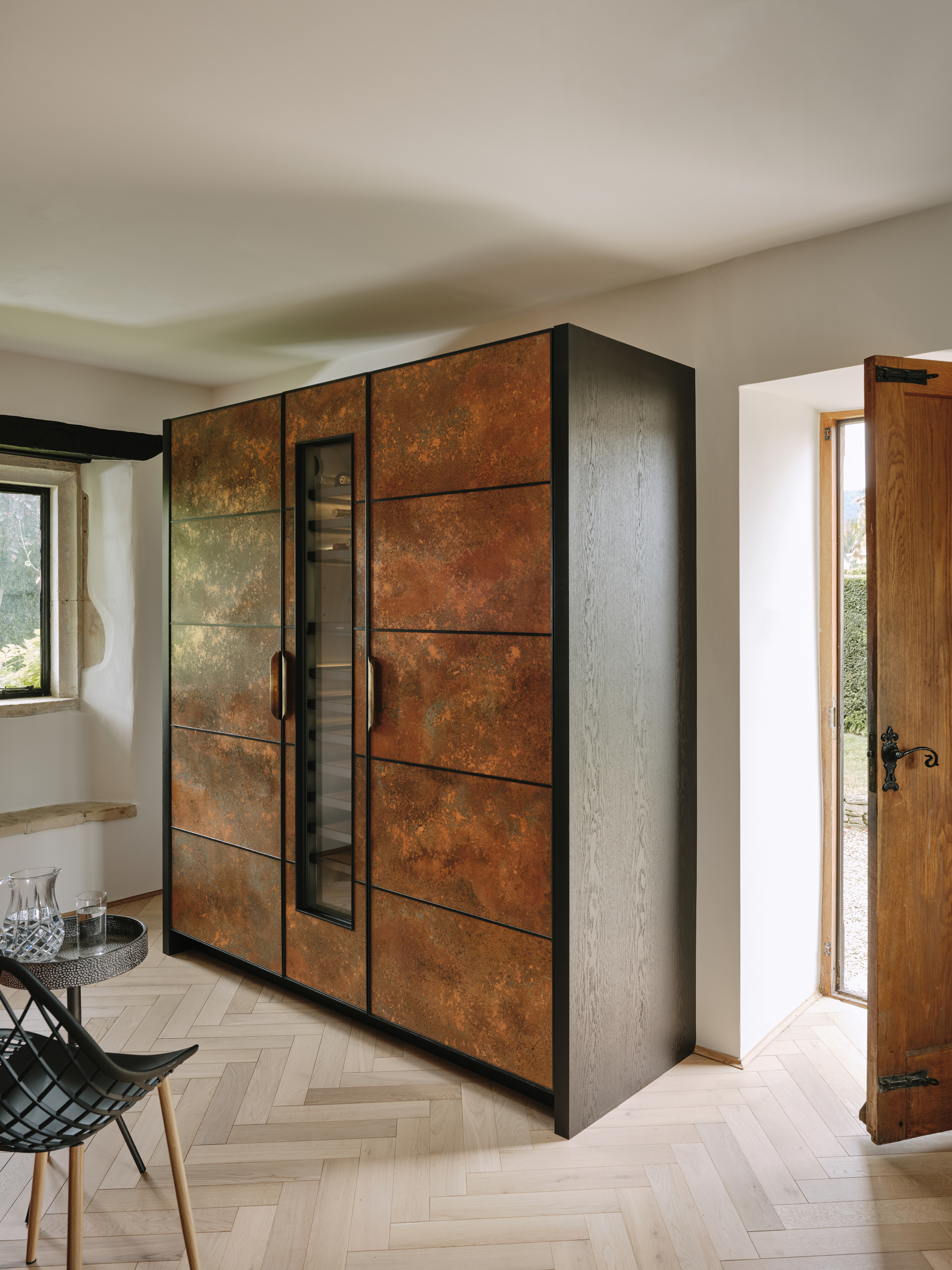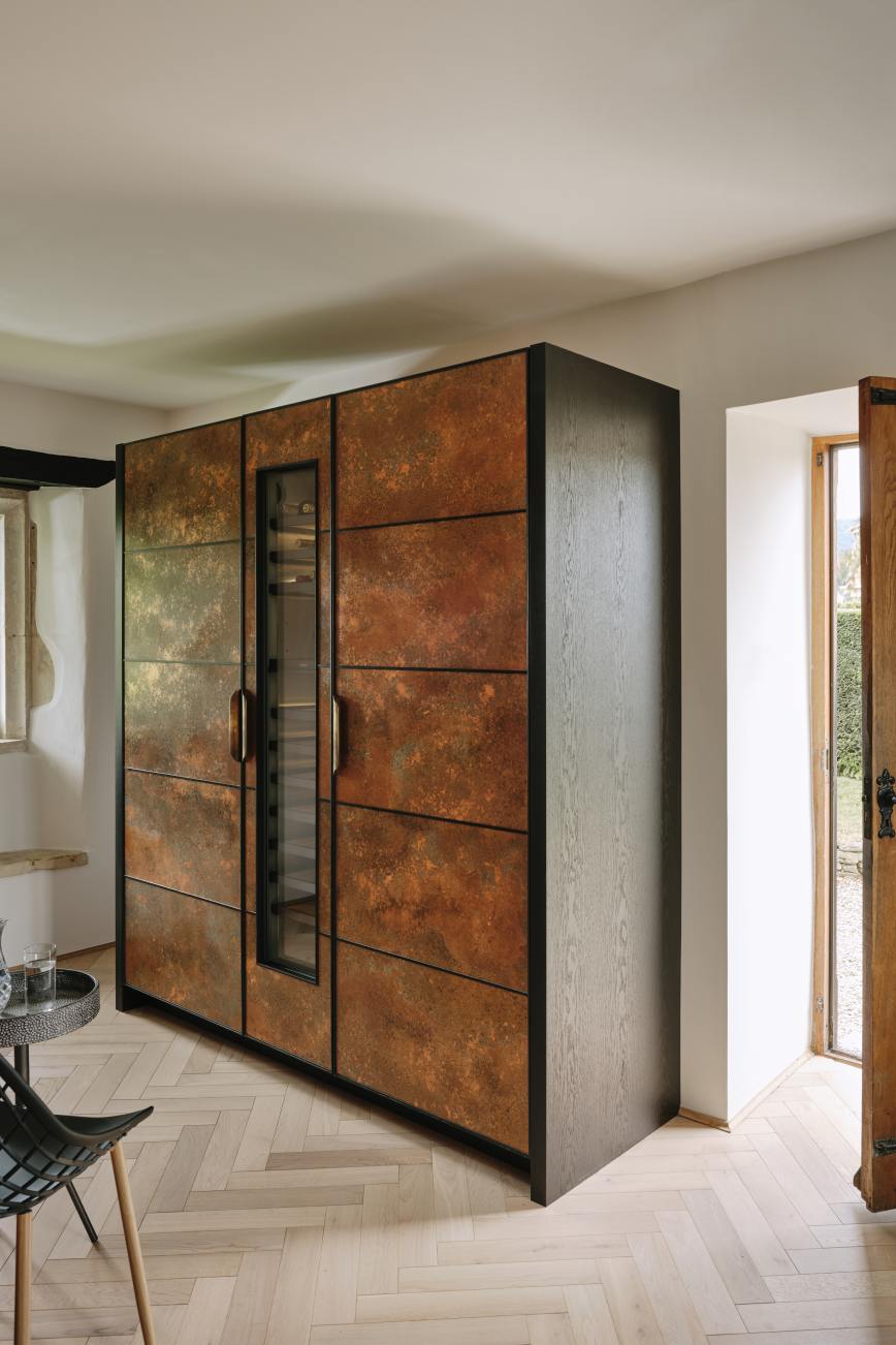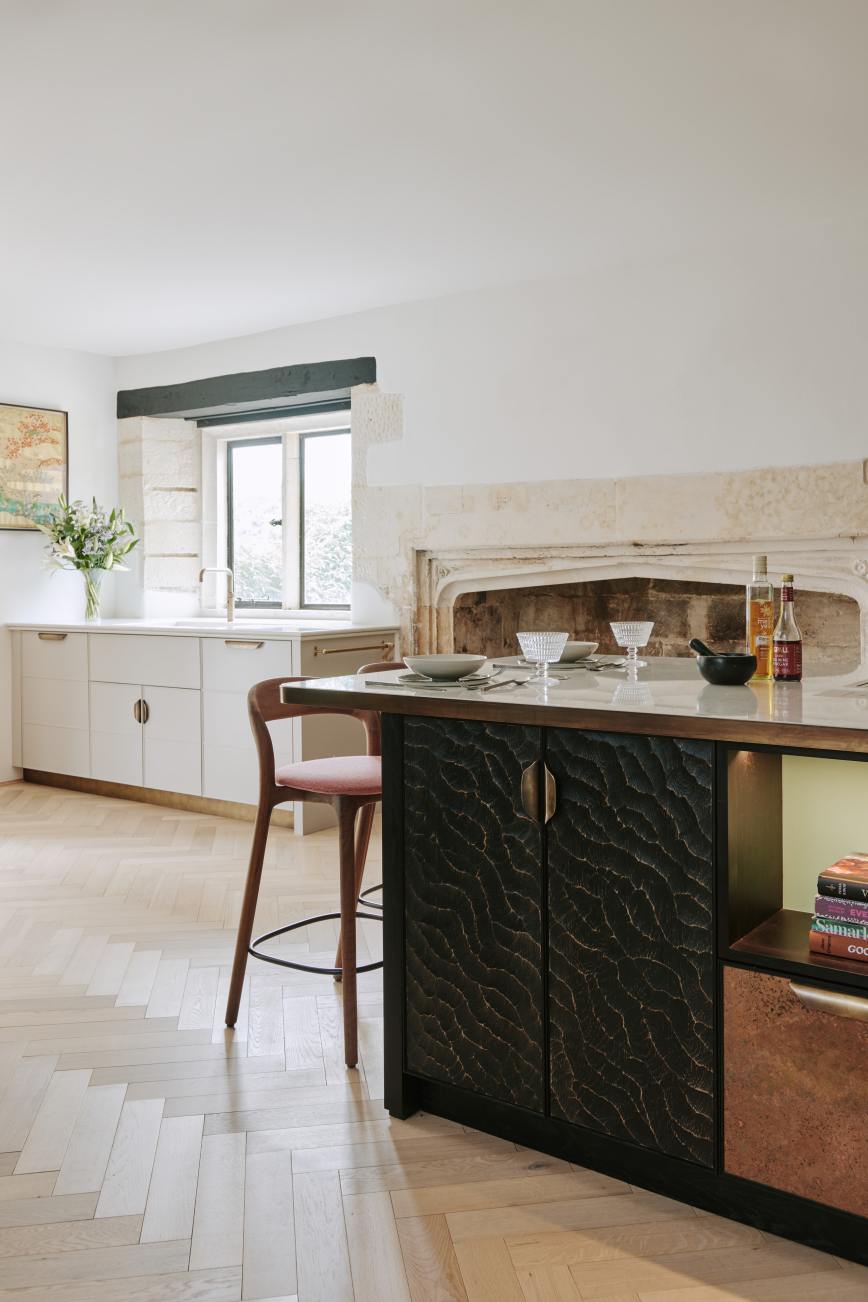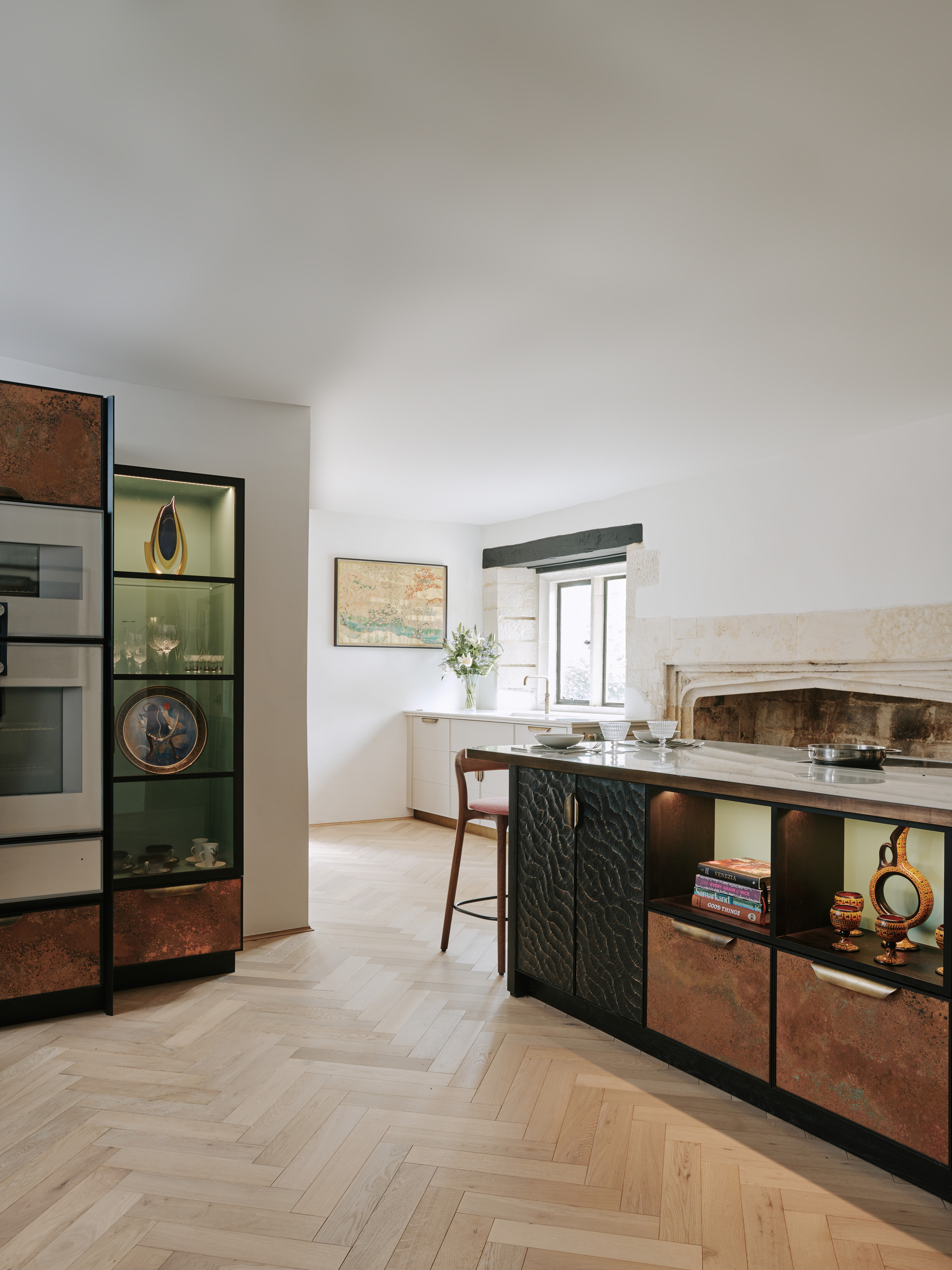 The ” choppy wood” carving on the back of the island cupboards adds texture to the scheme and resonates with the dark unevenness of the wooden beams in the room. The oven housing is designed to be a decorative display piece as it sits near the dining table, whilst still retaining practicality with storage space for pans below and the immediate proximity to the island . Like wise the fridge and freezer are housed in beautiful patinated copper, with a large breakfast cupboard and larder for food and groceries storage. Adding contrast to the dark furniture, the sink area is in white painted oak, with aged brass handles and worktops in practical ambra quartz tie the entire scheme together. To add an extra touch of glamour the sides of the island are in verdisgris copper, and the worktop is edged in a beautiful aged brass surround. Altogether the effect of the kitchen is to look like it has always been there , but with a wow factor that is definitely up to the minute!