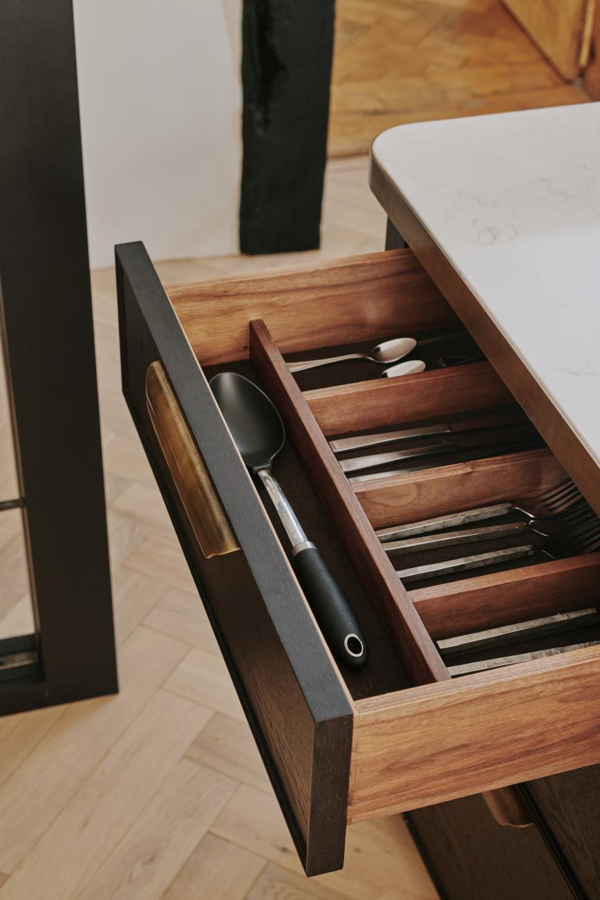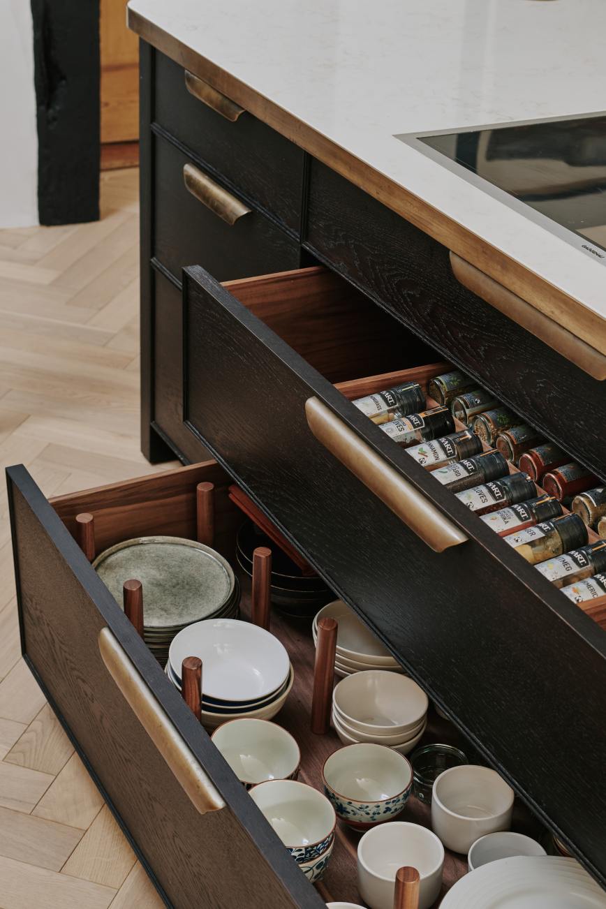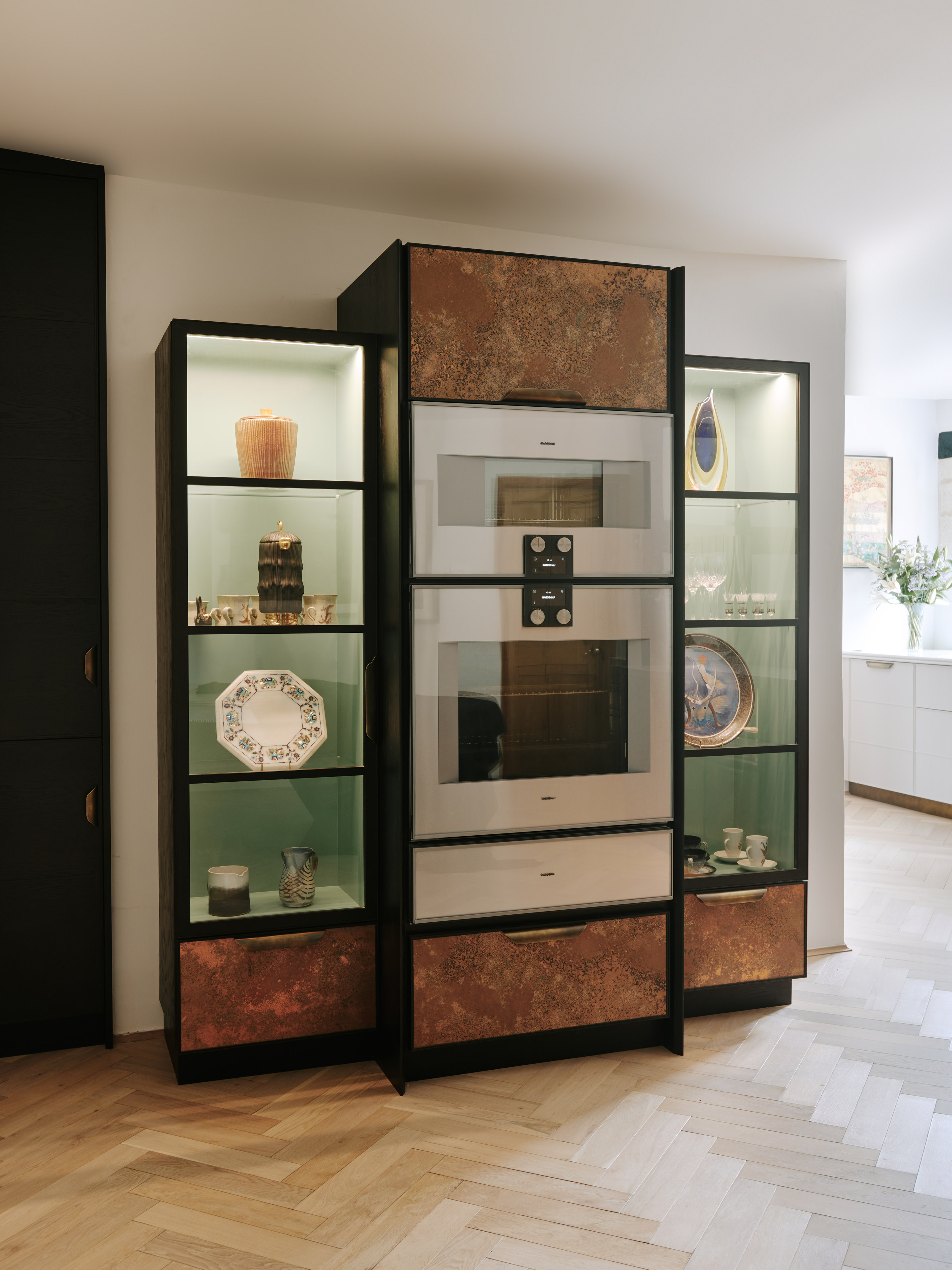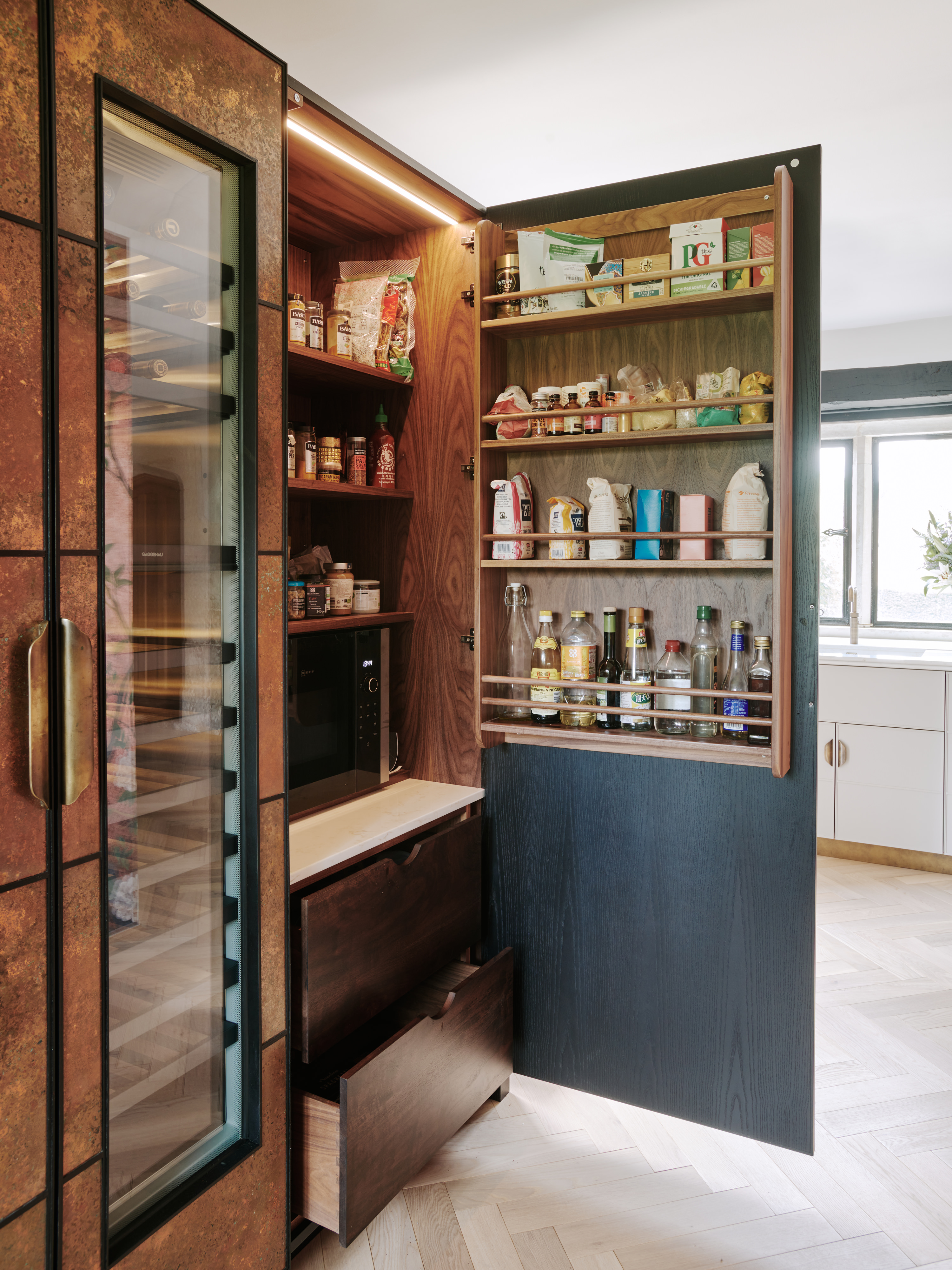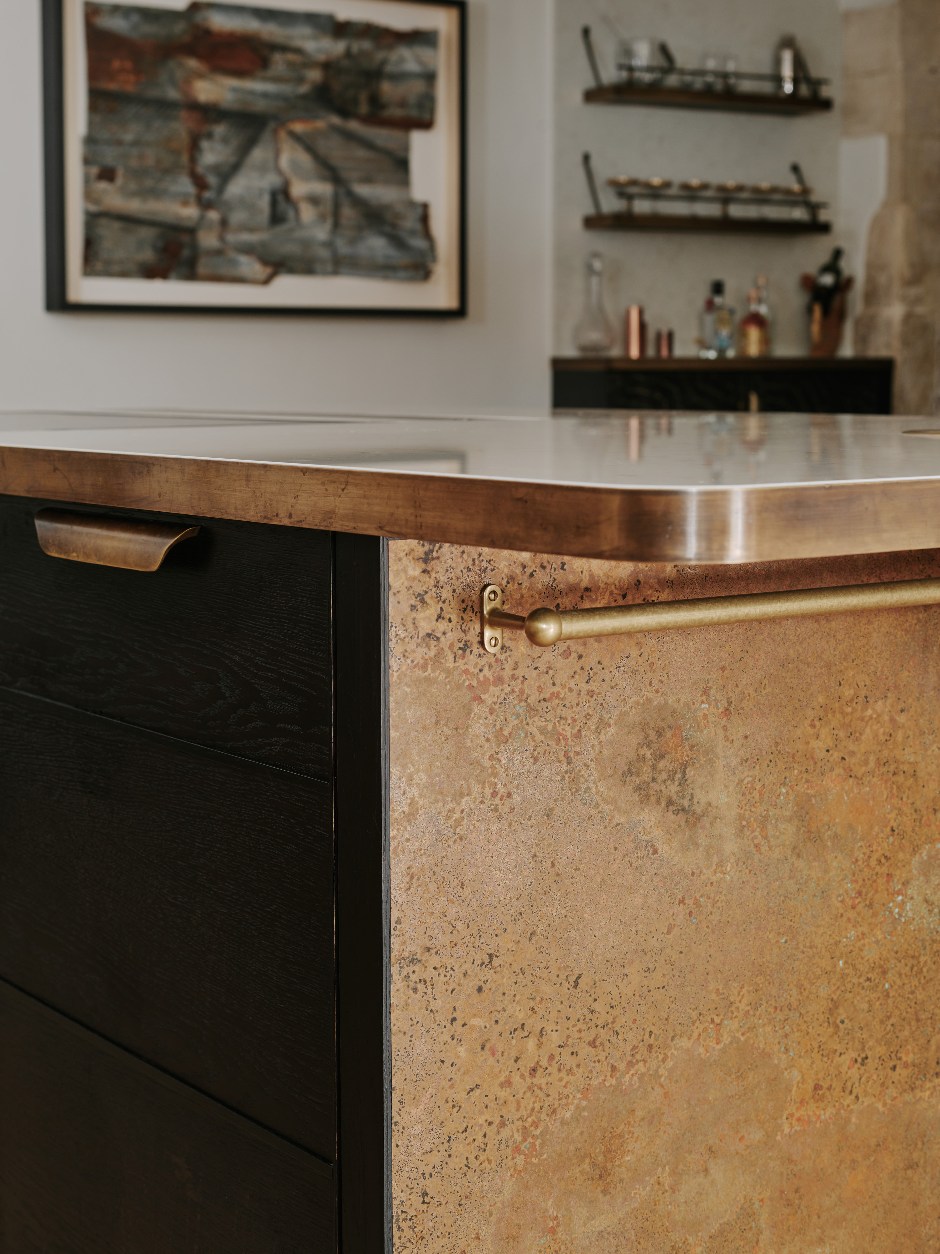 The ” choppy wood” carving on the back of the island cupboards adds texture to the scheme and resonates with the dark unevenness of the wooden beams in the room. The oven housing is designed to be a decorative display piece as it sits near the dining table, whilst still retaining practicality with storage space for pans below and the immediate proximity to the island . Like wise the fridge and freezer are housed in beautiful patinated copper, with a large breakfast cupboard and larder for food and groceries storage. Adding contrast to the dark furniture, the sink area is in white painted oak, with aged brass handles and worktops in practical ambra quartz tie the entire scheme together. To add an extra touch of glamour the sides of the island are in verdisgris copper, and the worktop is edged in a beautiful aged brass surround. Altogether the effect of the kitchen is to look like it has always been there , but with a wow factor that is definitely up to the minute!