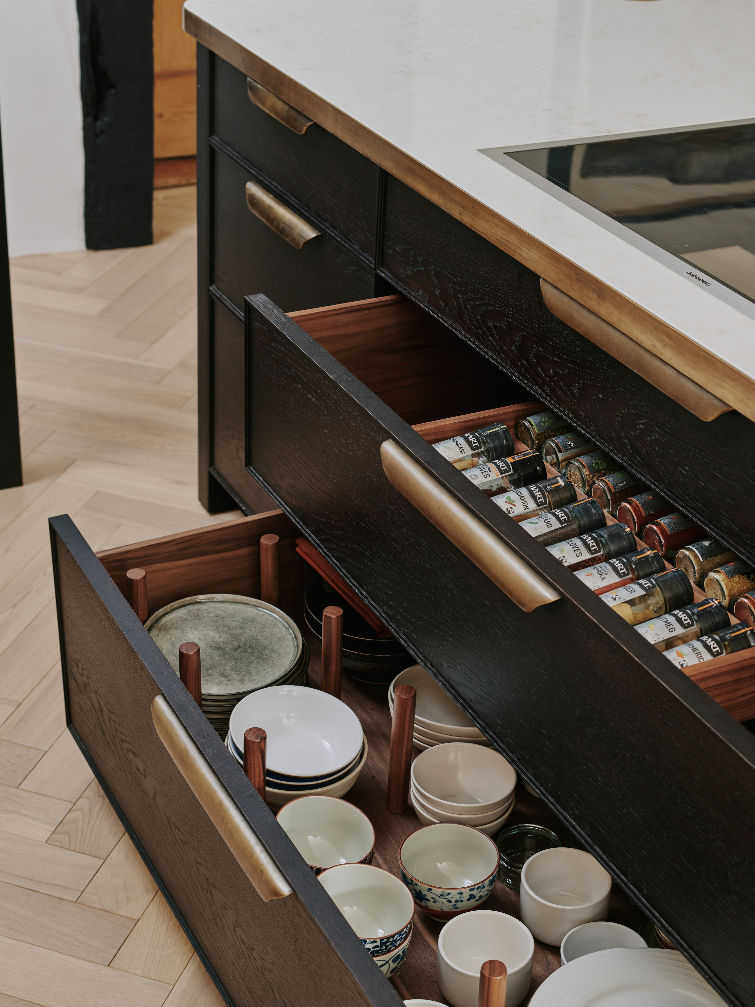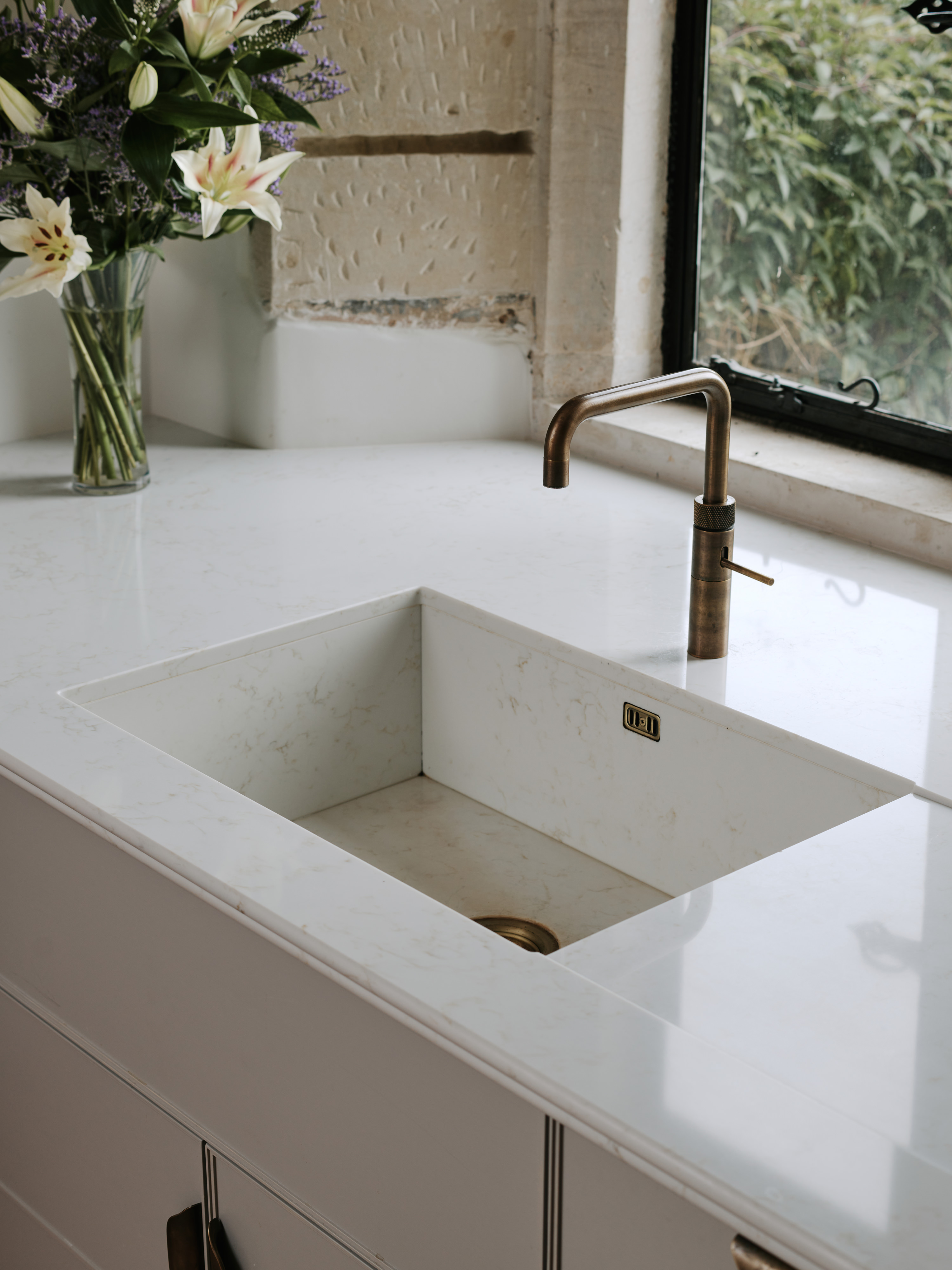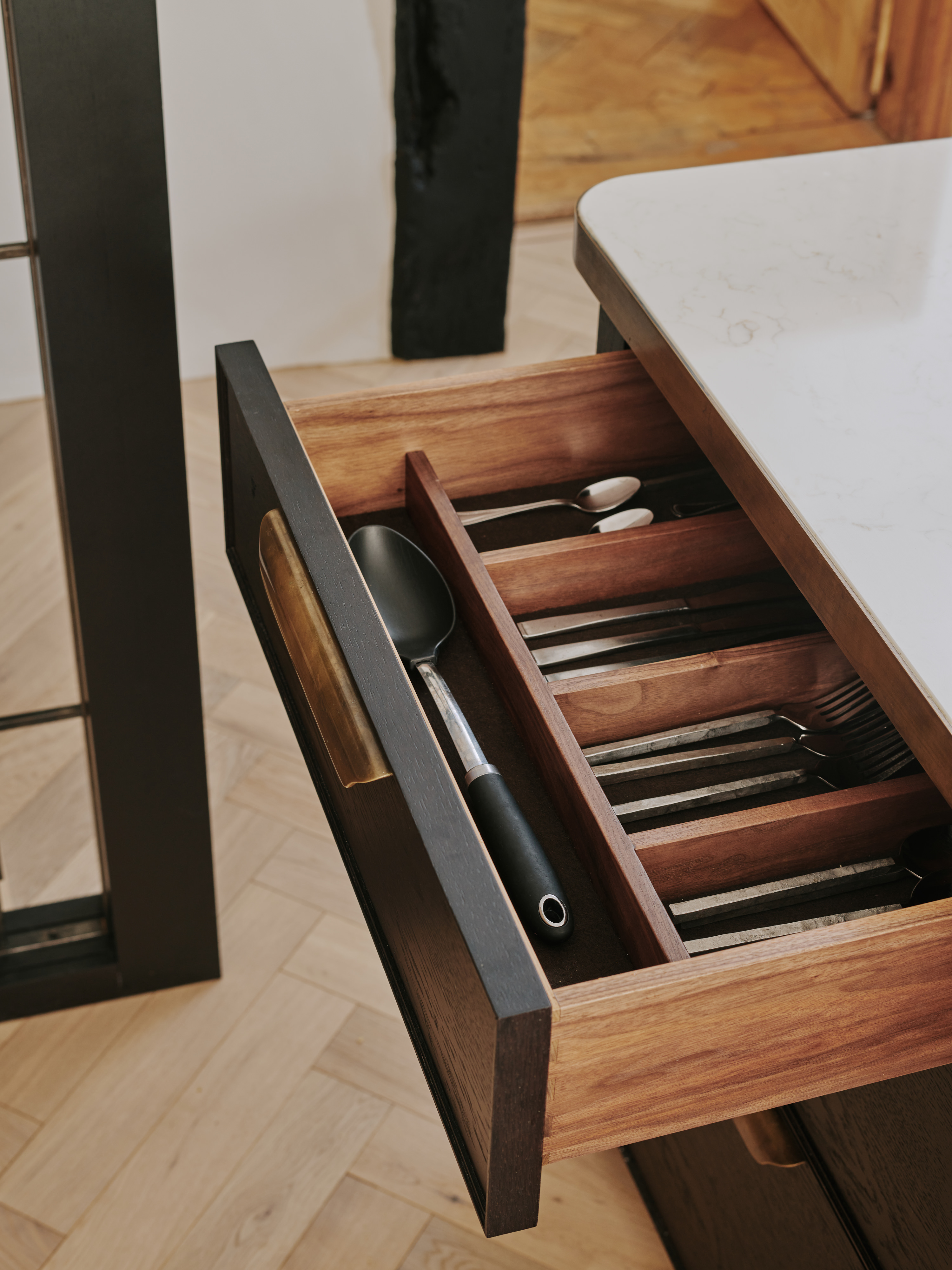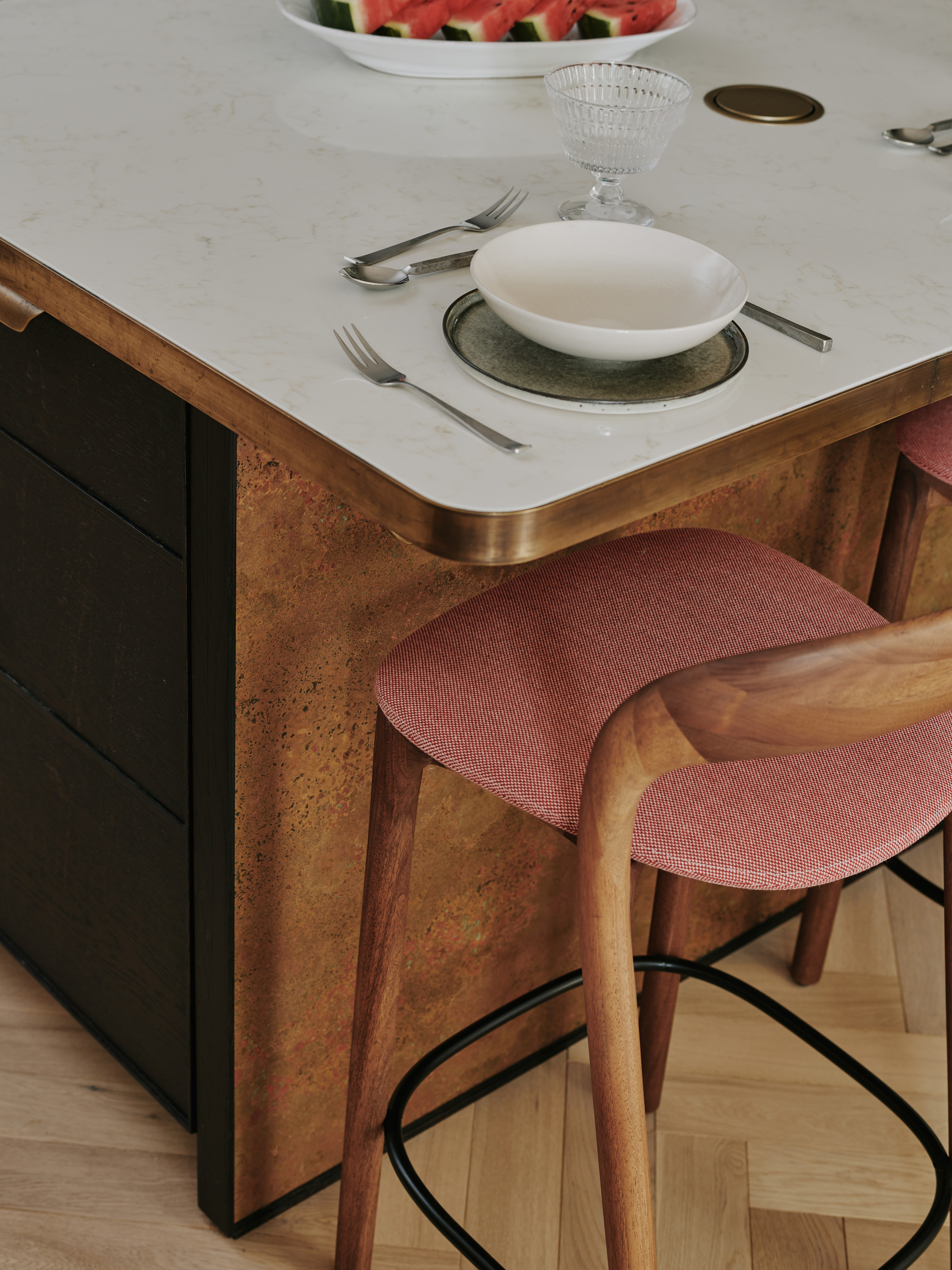 The ” choppy wood” carving on the back of the island cupboards adds texture to the scheme and resonates with the dark unevenness of the wooden beams in the room. The oven housing is designed to be a decorative display piece as it sits near the dining table, whilst still retaining practicality with storage space for pans below and the immediate proximity to the island . Like wise the fridge and freezer are housed in beautiful patinated copper, with a large breakfast cupboard and larder for food and groceries storage. Adding contrast to the dark furniture, the sink area is in white painted oak, with aged brass handles and worktops in practical ambra quartz tie the entire scheme together. To add an extra touch of glamour the sides of the island are in verdisgris copper, and the worktop is edged in a beautiful aged brass surround. Altogether the effect of the kitchen is to look like it has always been there , but with a wow factor that is definitely up to the minute!