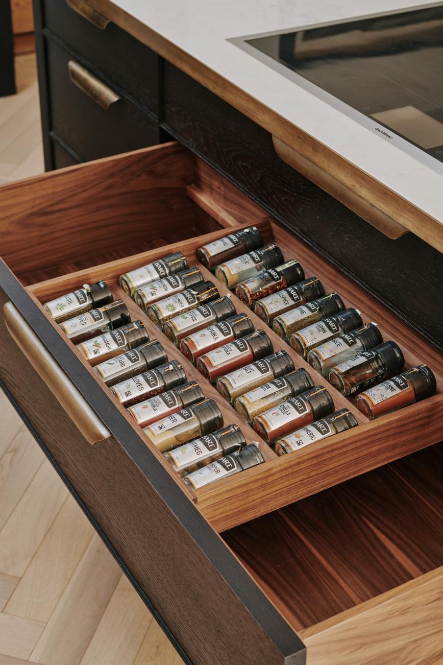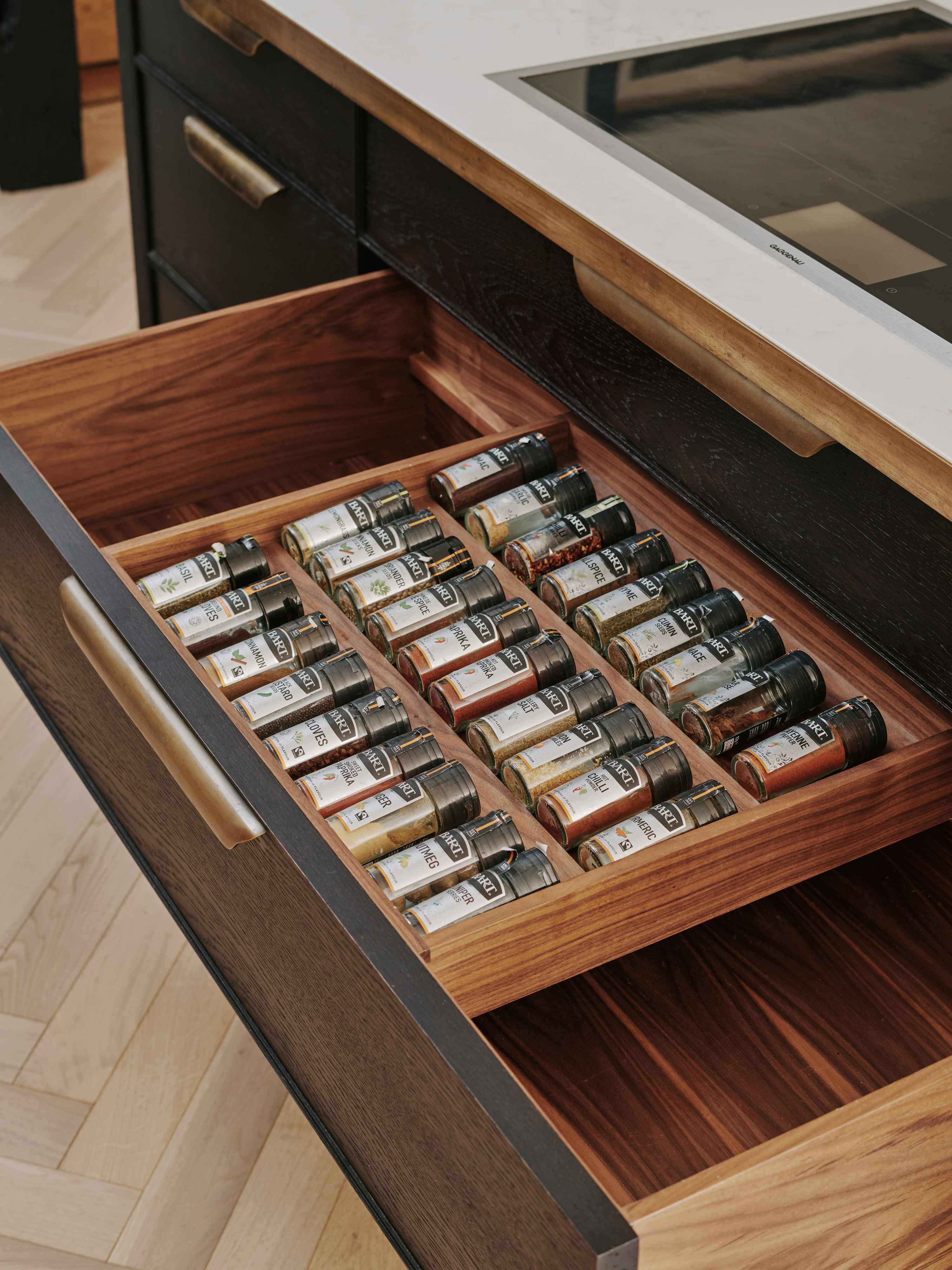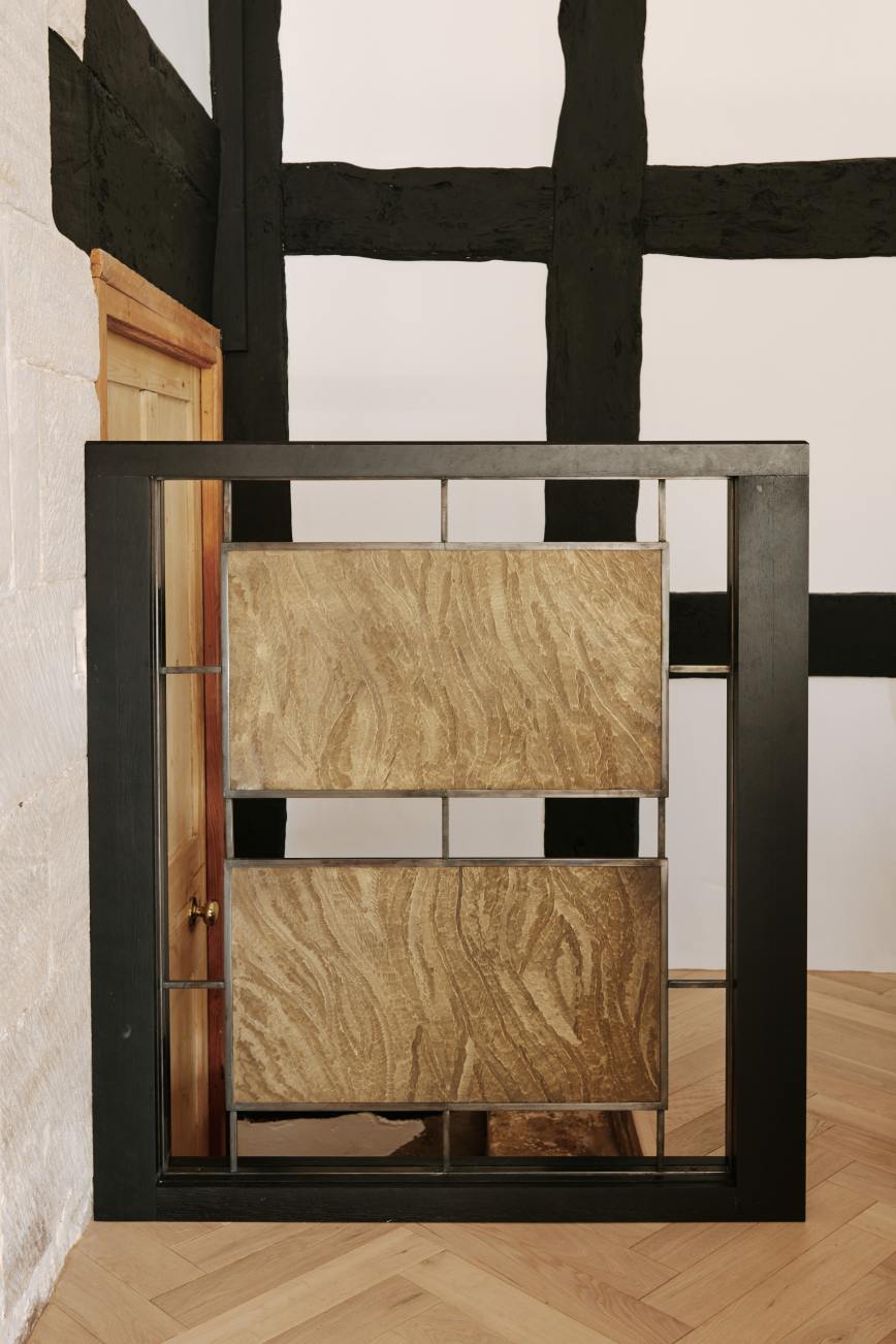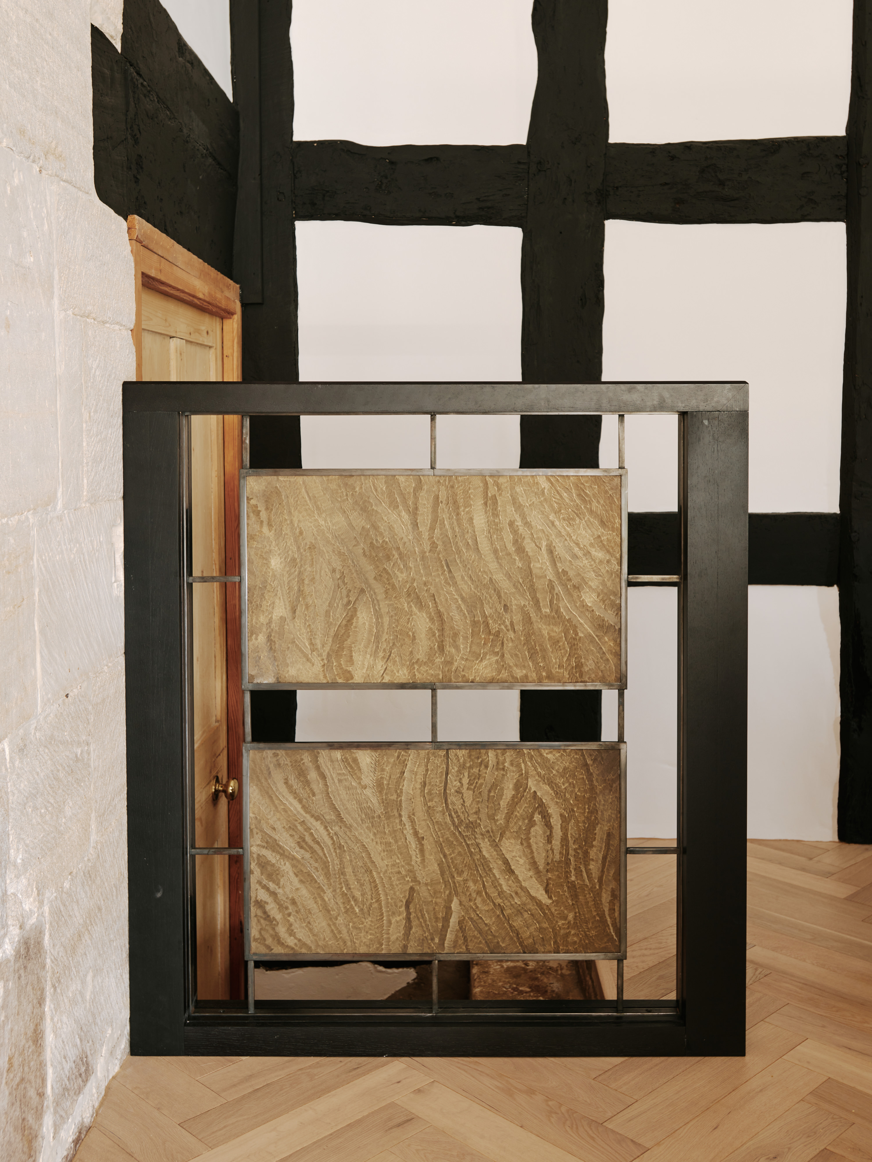 The ” choppy wood” carving on the back of the island cupboards adds texture to the scheme and resonates with the dark unevenness of the wooden beams in the room. The oven housing is designed to be a decorative display piece as it sits near the dining table, whilst still retaining practicality with storage space for pans below and the immediate proximity to the island . Like wise the fridge and freezer are housed in beautiful patinated copper, with a large breakfast cupboard and larder for food and groceries storage. Adding contrast to the dark furniture, the sink area is in white painted oak, with aged brass handles and worktops in practical ambra quartz tie the entire scheme together. To add an extra touch of glamour the sides of the island are in verdisgris copper, and the worktop is edged in a beautiful aged brass surround. Altogether the effect of the kitchen is to look like it has always been there , but with a wow factor that is definitely up to the minute!