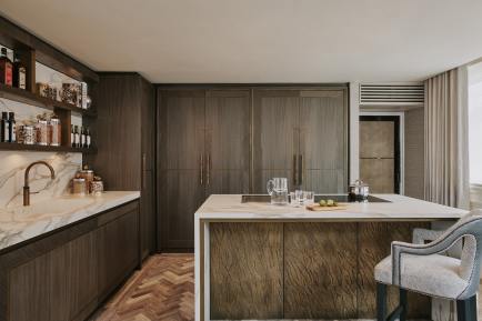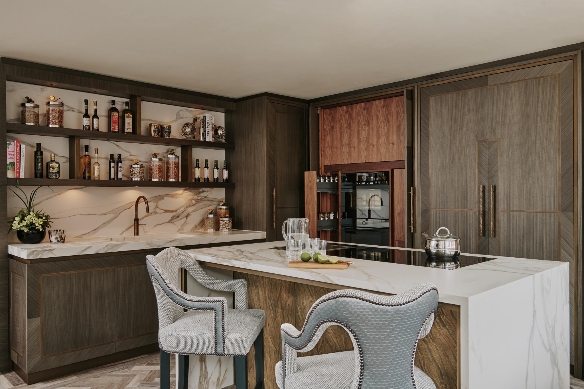 Our Marquetry kitchens are a contemporary take on traditional artisanal skills. Directional crosslaid veneers are applied by hand in an intricate marquetry design, accented with liquid metal bronze inlays on the doors and custom-designed bronze bar handles. Adding texture and contrast to the fine craftsmanship of the marquetry panels on the tall housing, the island is clad in spectacular solid brass. The brass been distressed by hand, aged and patinated to create this distinctive effect. Large pocket doors surrounding the appliances and larder cupboard allow the working areas of the kitchen to be accessed when needed and hidden when not in use. This is particularly useful in an open-plan space, such as this, which is used for living, dining and cooking. The sink is made from practical Calacatta Oro porcelain, which has also been used for the worktops and wall panel behind the sink.