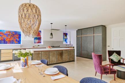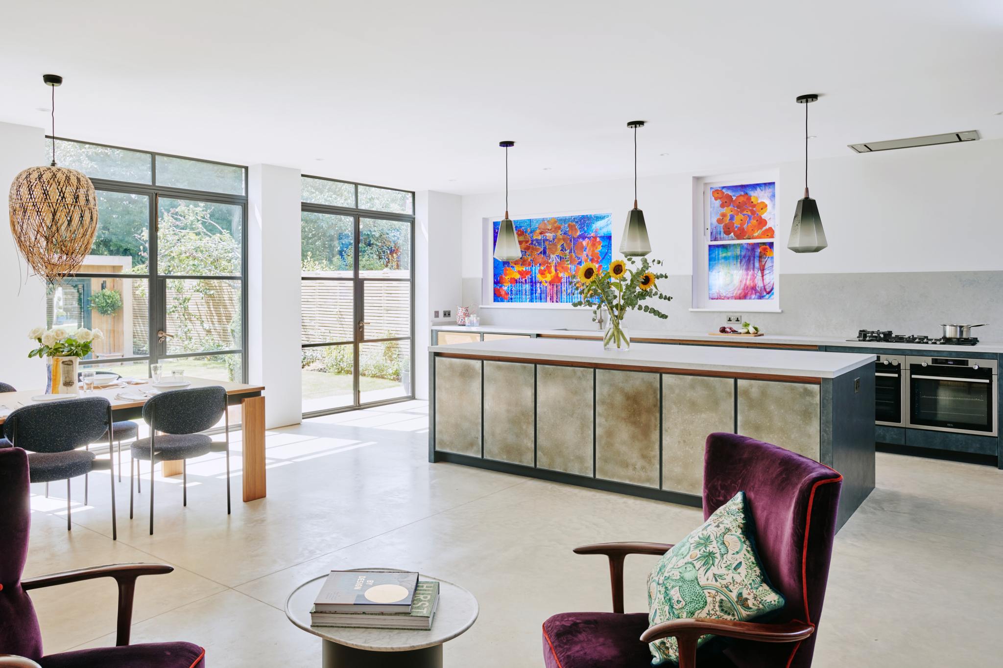 An extensive renovation to our client’s home in Wimbledon inspired her to choose Ledbury Studio for the kitchen. She wanted a large open space for living, eating and dining... spacious enough for relaxing with her extended family, along with plenty of room to keep a watchful eye over her baby’s play area. A lover and collector of modern art, our client wanted a minimal, industrial look to the kitchen,