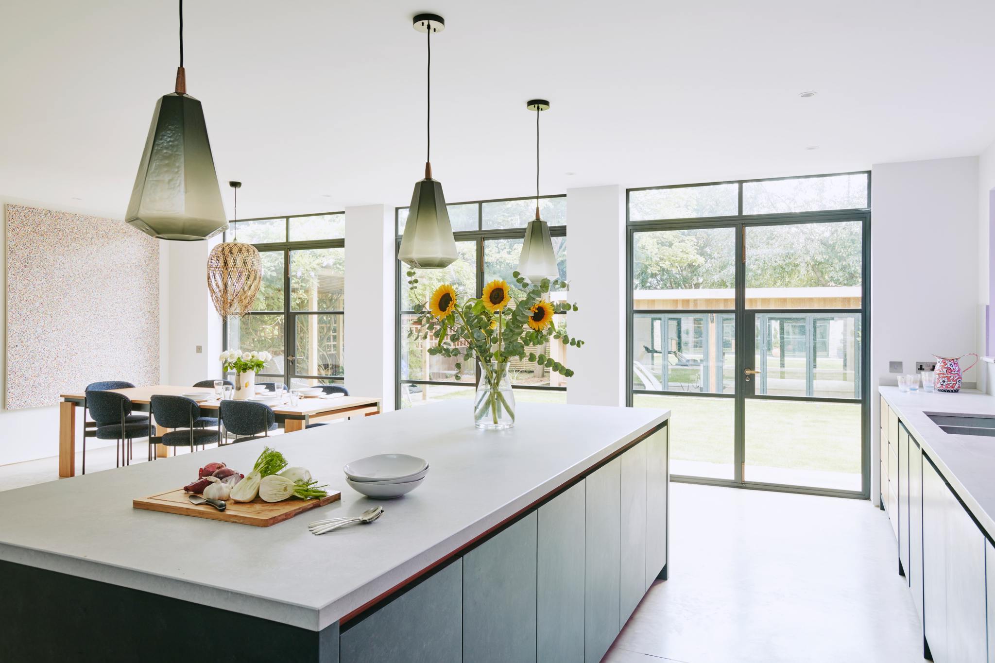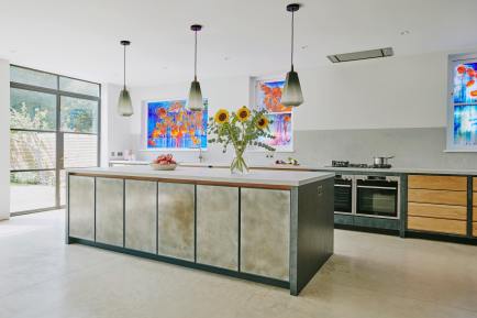 to act as a backdrop to her collection of colourful paintings, and the stunning stained glass windows specially commissioned for the kitchen from the celebrated artist Brian Clarke. Working from a palette of grey tones, Charlie used hand finished and aged solid zinc doors from the Metallics Collection for the island, and elsewhere a specially commissioned paint effect was created on-site by our artist Emma to complete the look. Handless cupboards complete the minimal design of the cupboards, and two sets of natural oak drawers with exposed dovetail joints, add a craft inspired element to the very pared-back design. Crittall doors leading out into the garden and cool concrete floors provide the final finishing design elements to this unique kitchen.