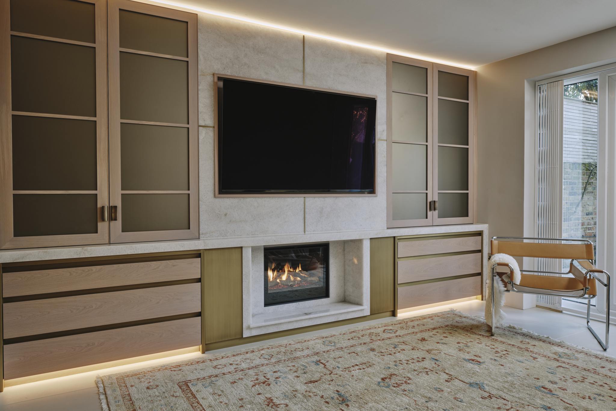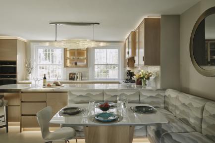 Following a disastrous flood in the basement of their St John’s Wood home, our clients asked us to redesign the space as a family area for cooking, eating and living. Charlie designed the kitchen area to take advantage of the morning sun, and separated the kitchen from the dining and living areas with a peninsular breakfast bar, the back of which forms upholstered bench seating for the dining table to make full use of the space. The design of the furniture is carried through to the media room to include fitted alcove cupboards glazed with opaque bronze glass, a built in TV, and fireplace surround crafted from diamond quartzite and patinated brass.