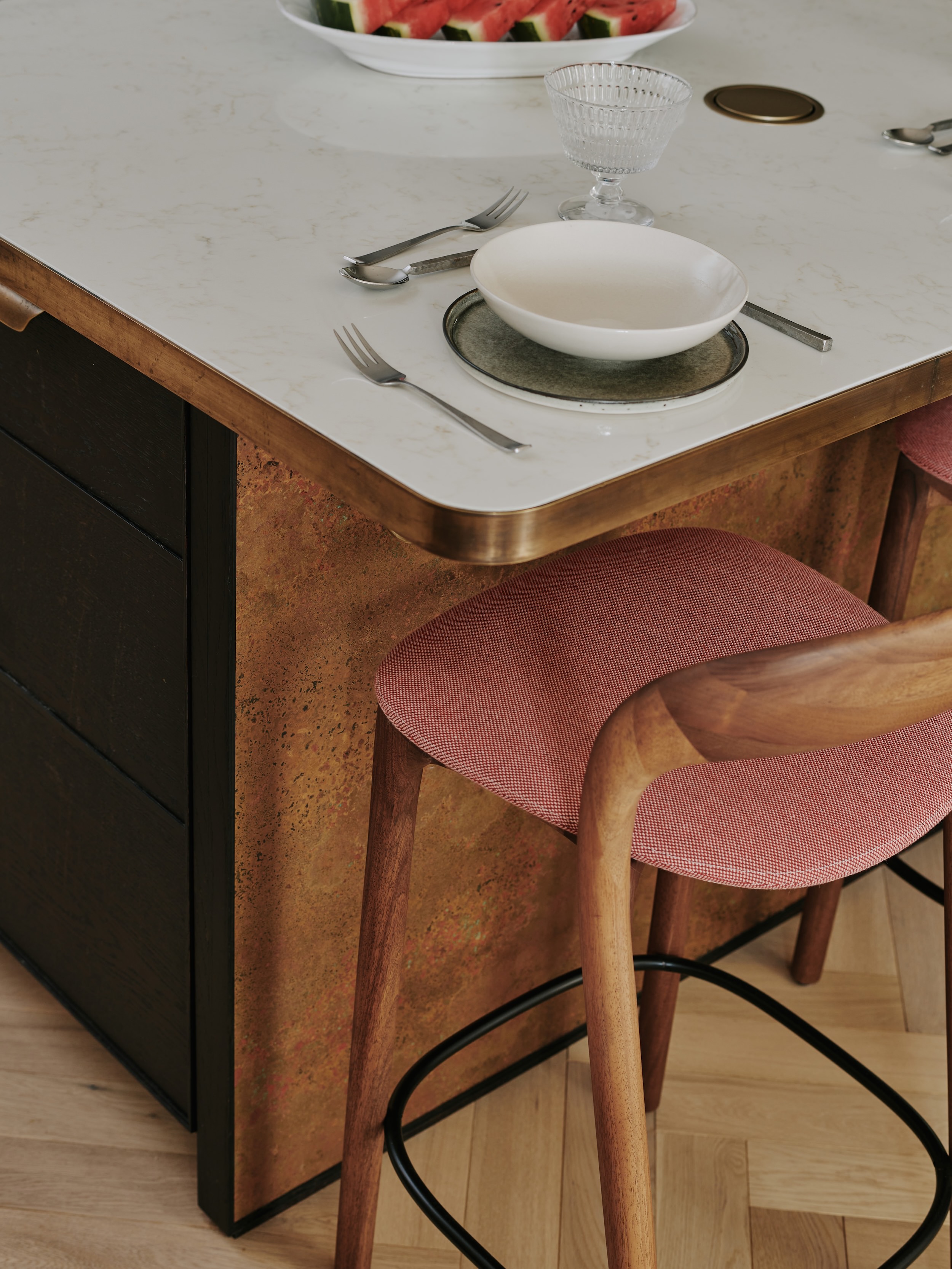This may include hand-applied patinas on copper or brass, rare timbers selected for their grain and tone, or finishes developed specifically for a single project. Materials are chosen for how they age, how they feel to use, and how they sit within a home, rather than for their novelty.